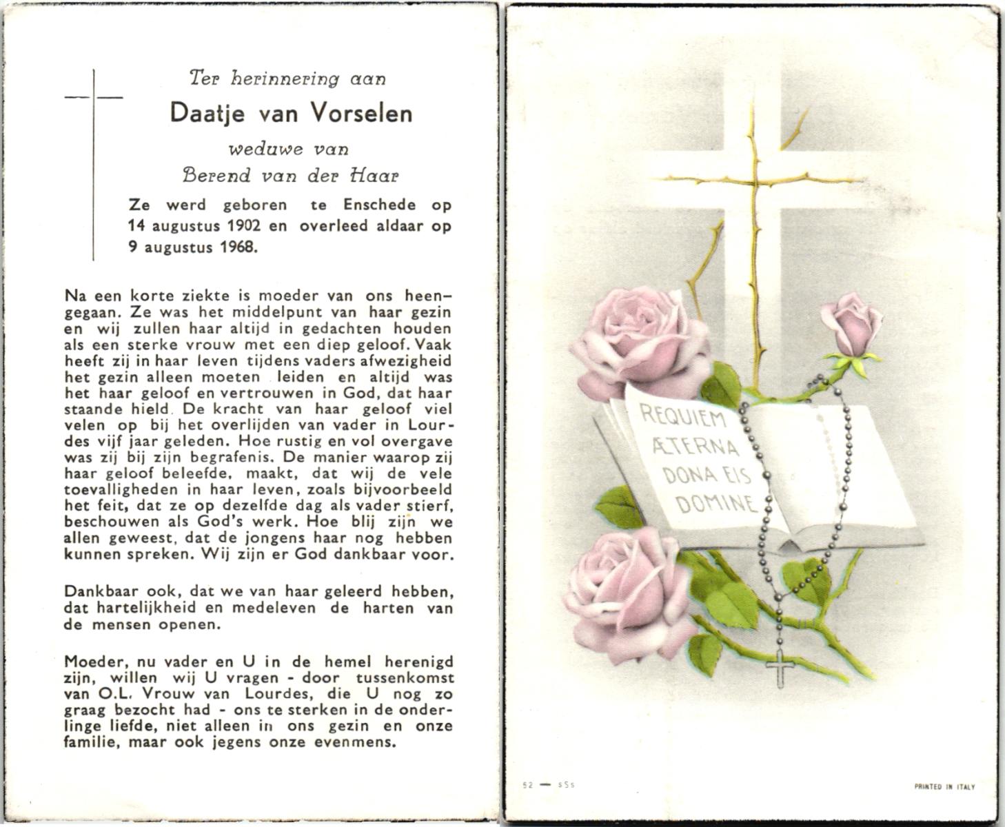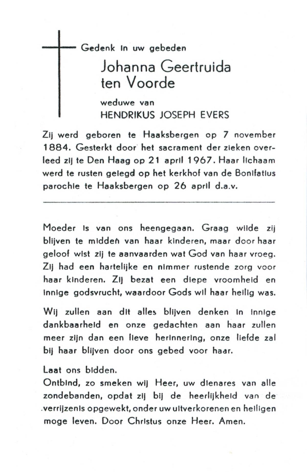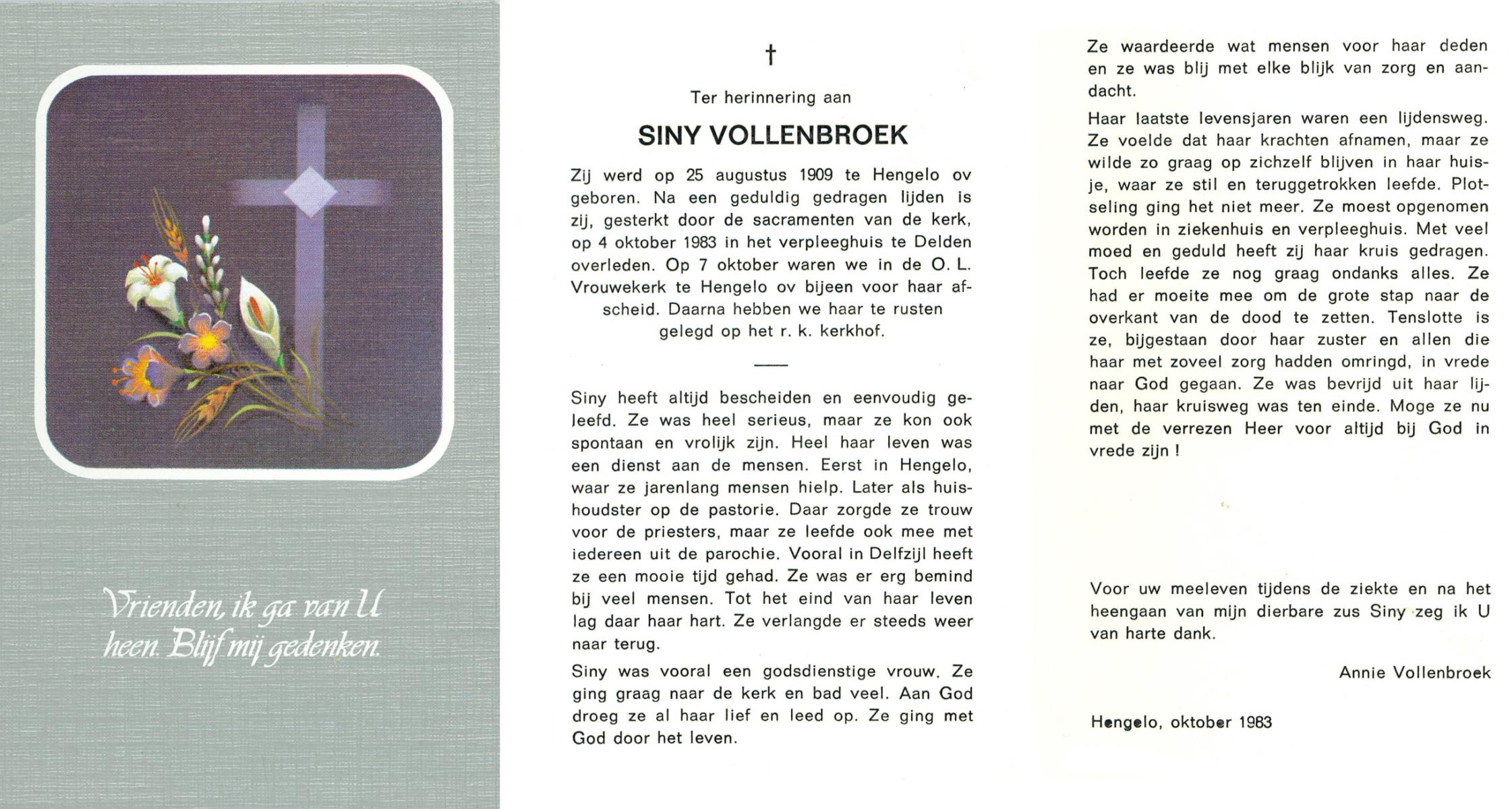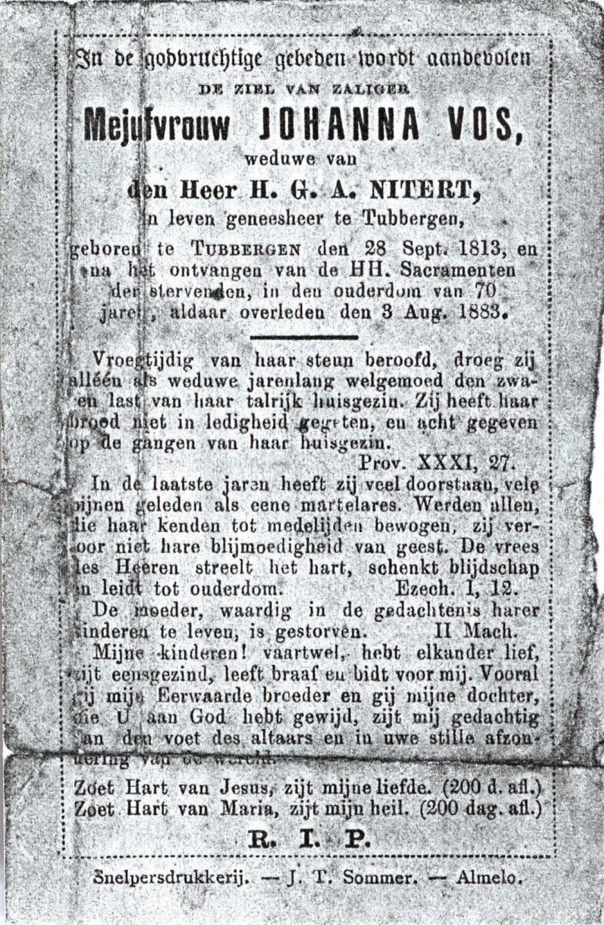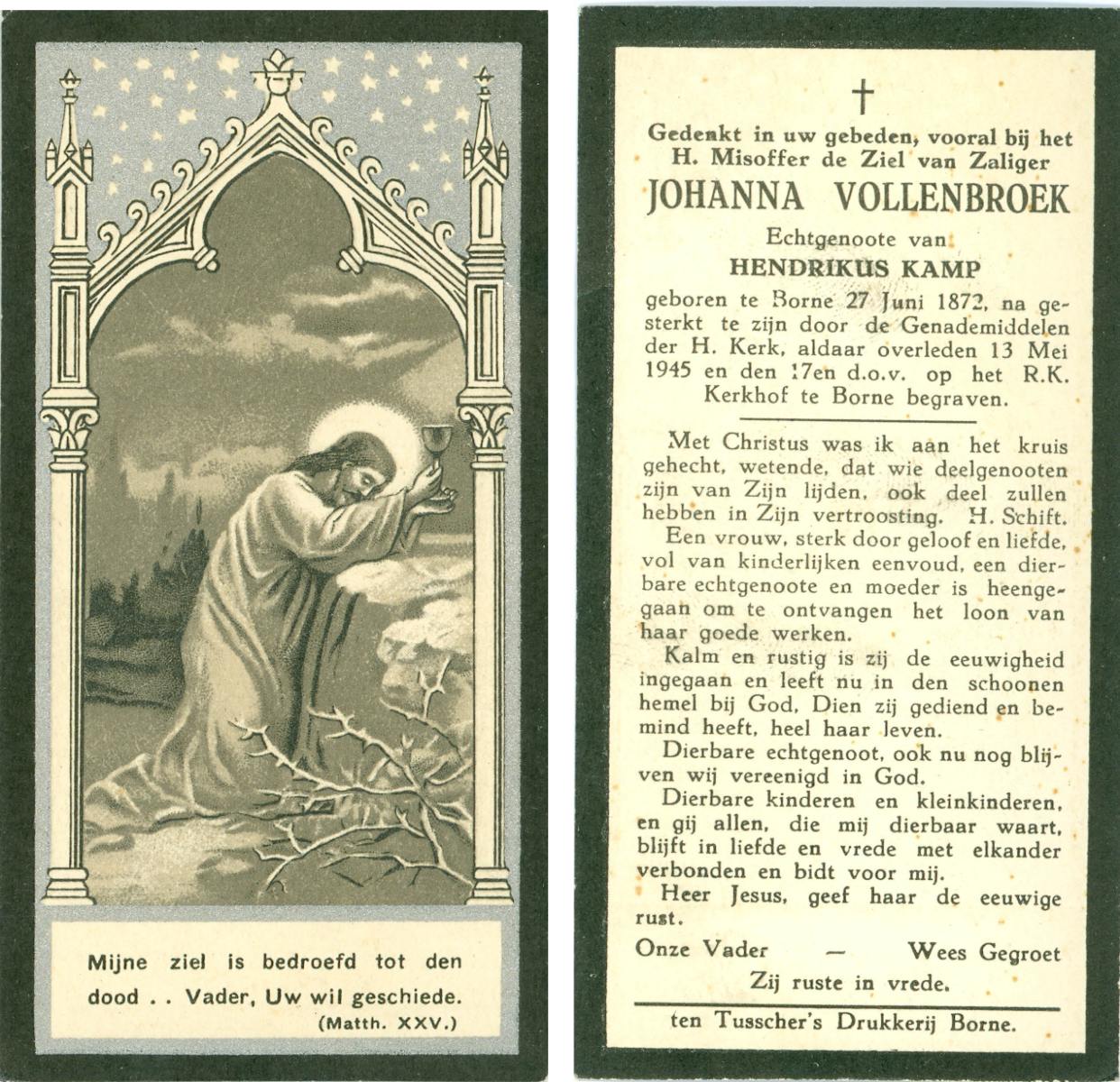 VLIET, van, Johanna, geboren op 03-02-1881 te Vinkeveen, overleden op 14-9-1962 te Delden op 81-jarige leeftijd, begraven op 18-9-1962 te Delden parochie-kerkhof H.Blasius.
