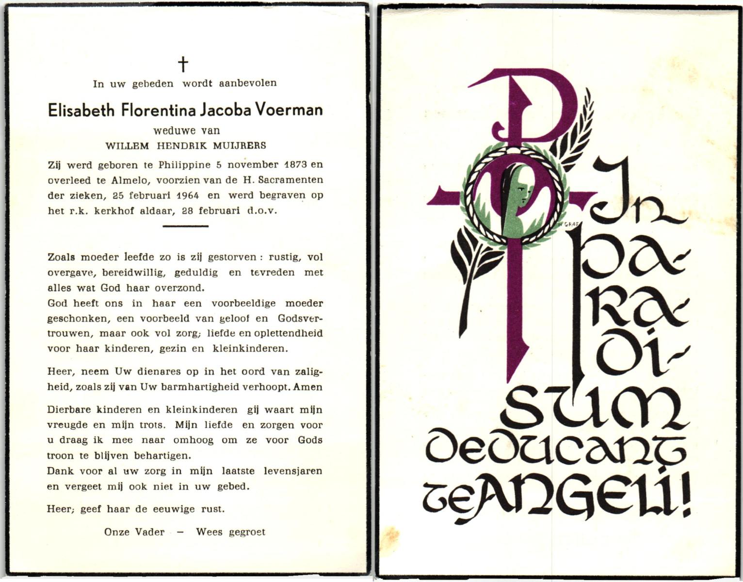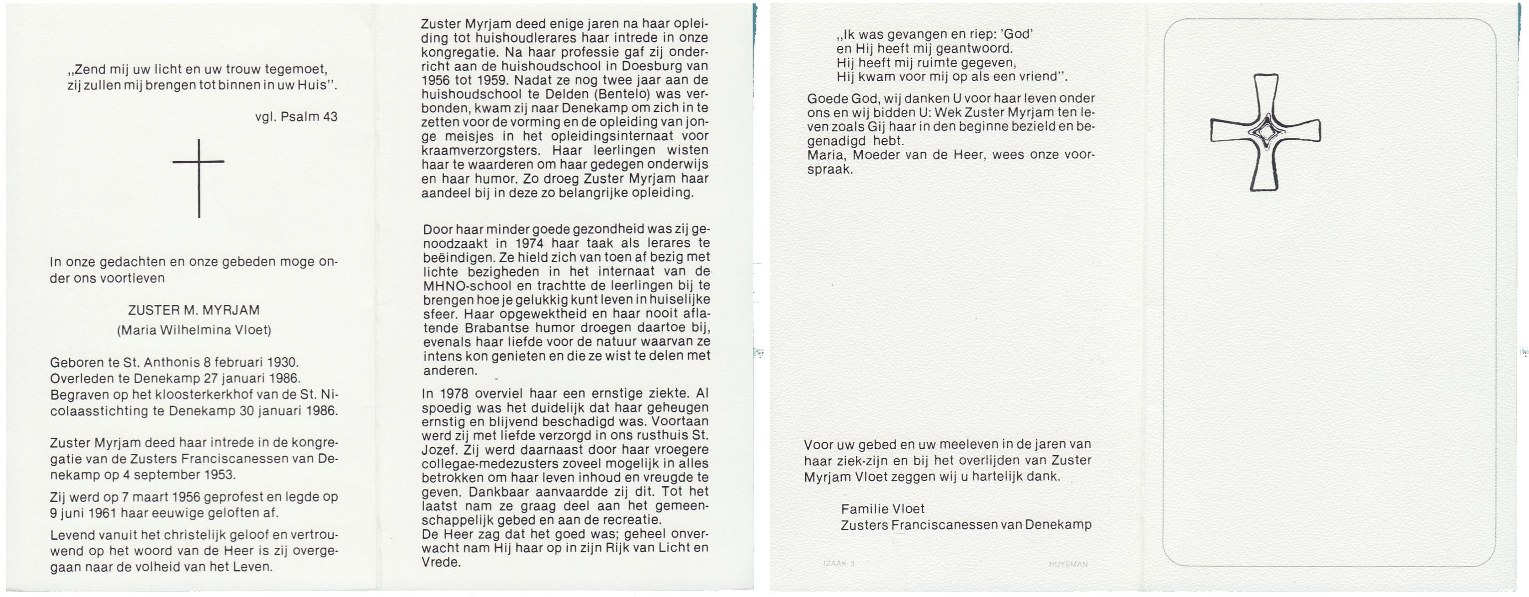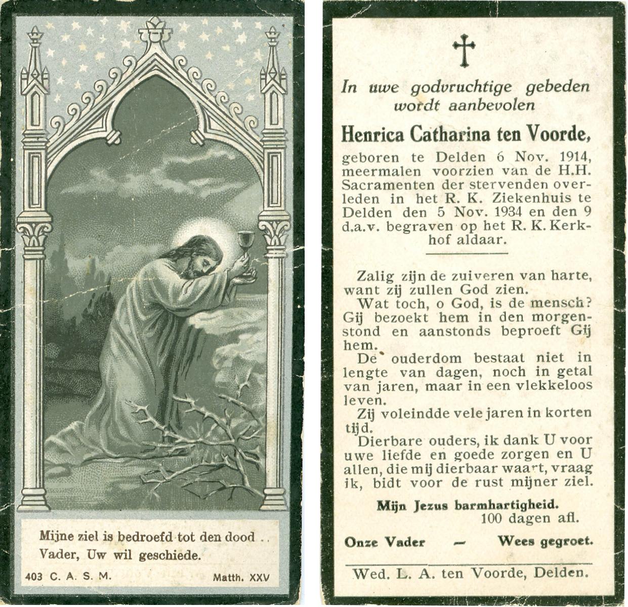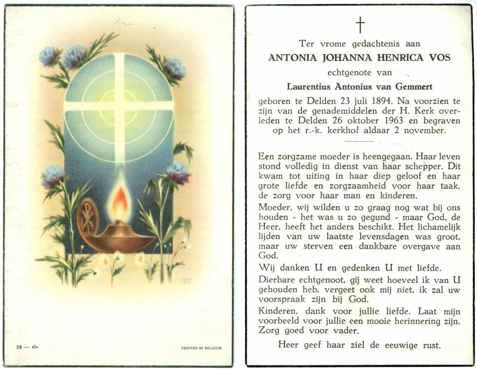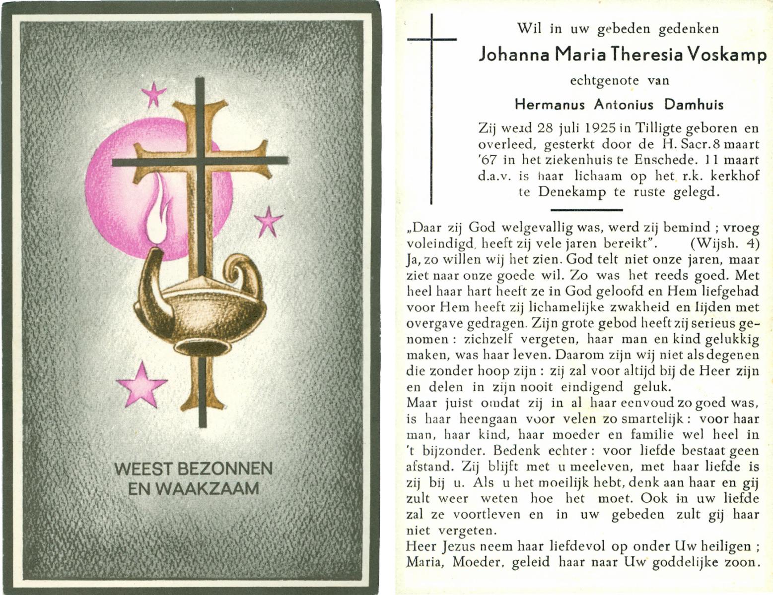 VLIET, van, Johanna, geboren op 03-02-1881 te Vinkeveen, overleden op 14-9-1962 te Delden op 81-jarige leeftijd, begraven op 18-9-1962 te Delden parochie-kerkhof H.Blasius.