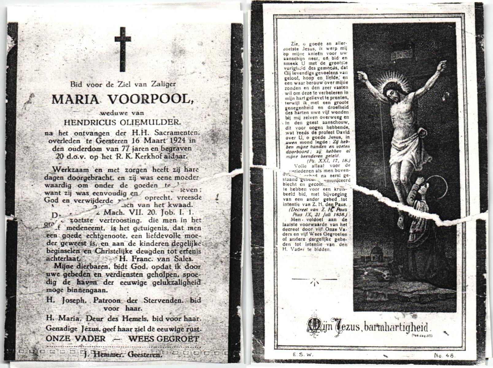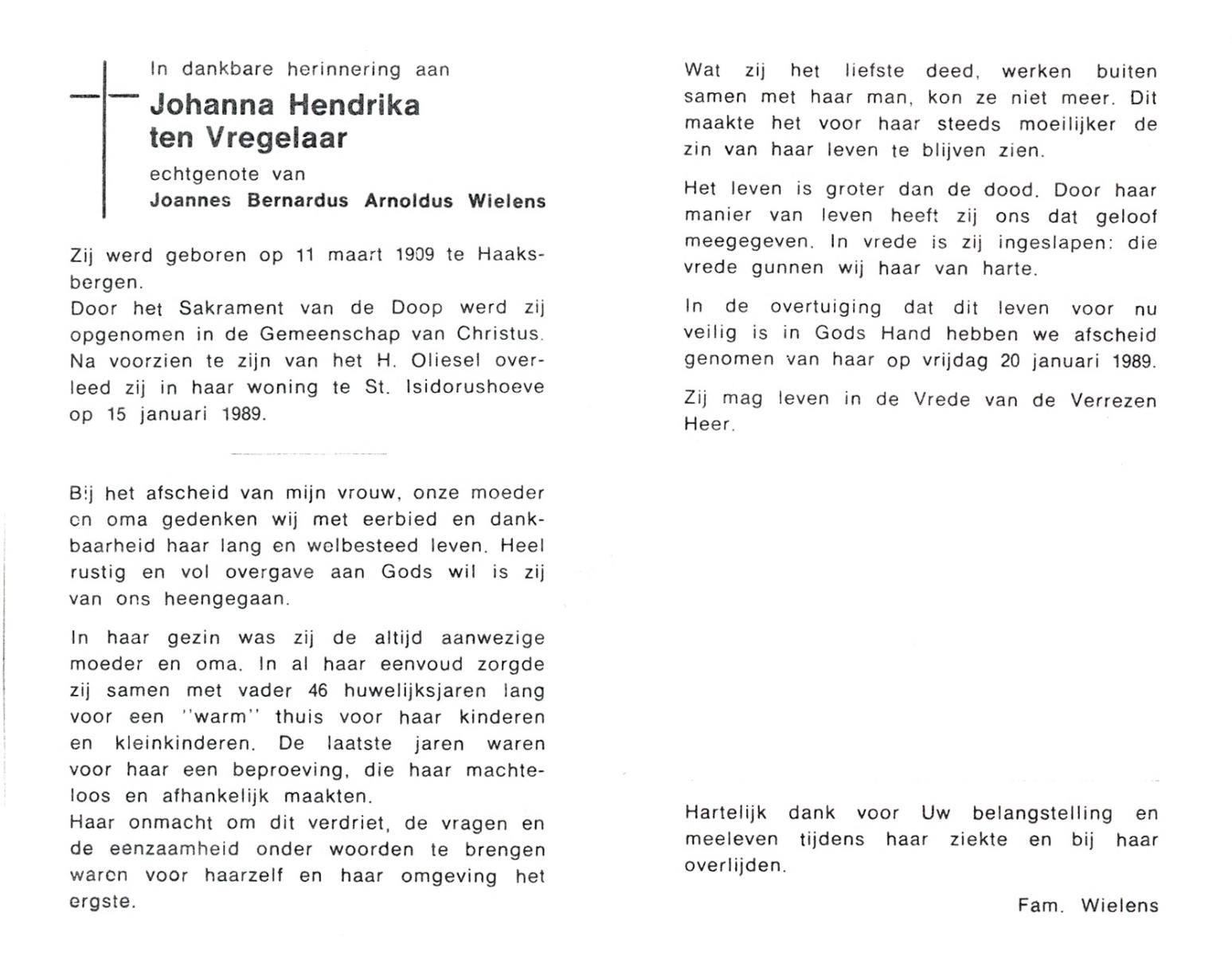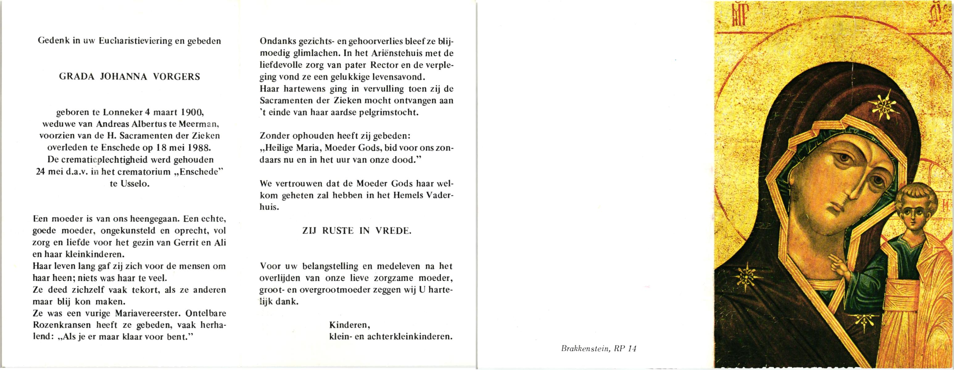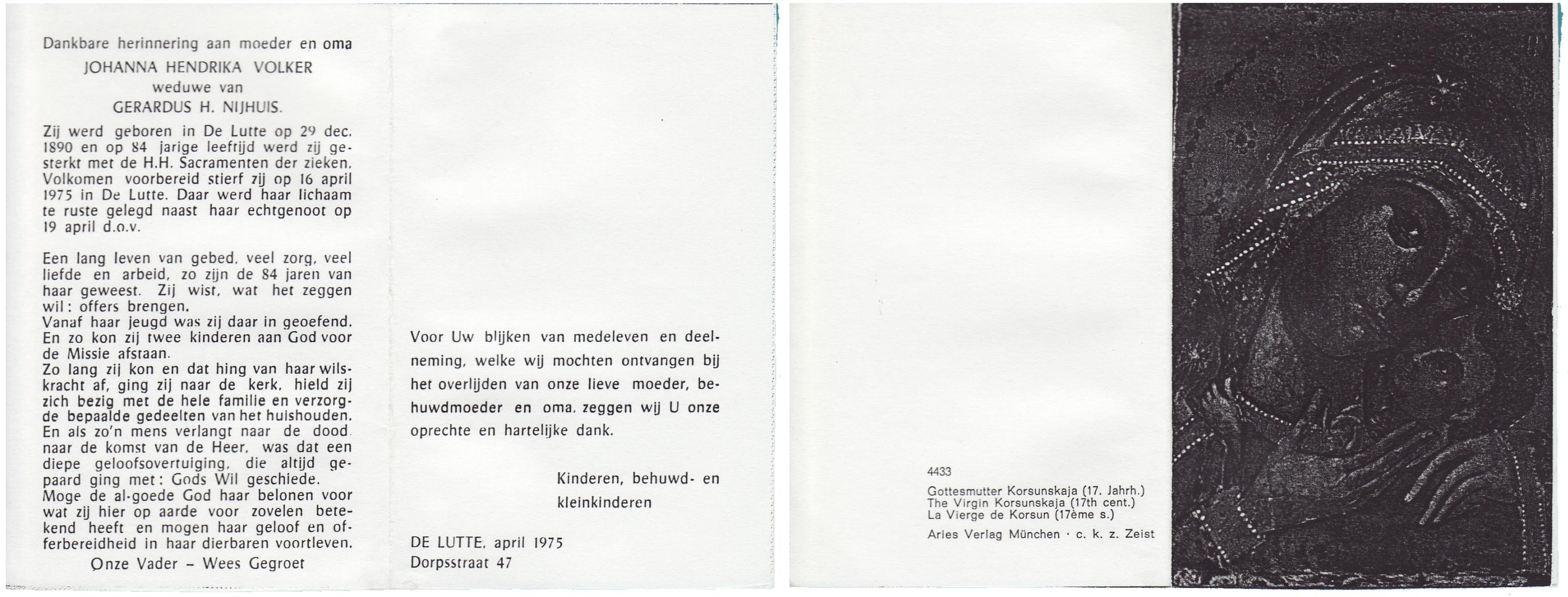 VLIET, van, Johanna, geboren op 03-02-1881 te Vinkeveen, overleden op 14-9-1962 te Delden op 81-jarige leeftijd, begraven op 18-9-1962 te Delden parochie-kerkhof H.Blasius.