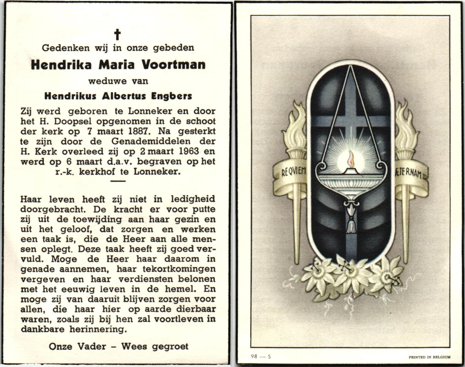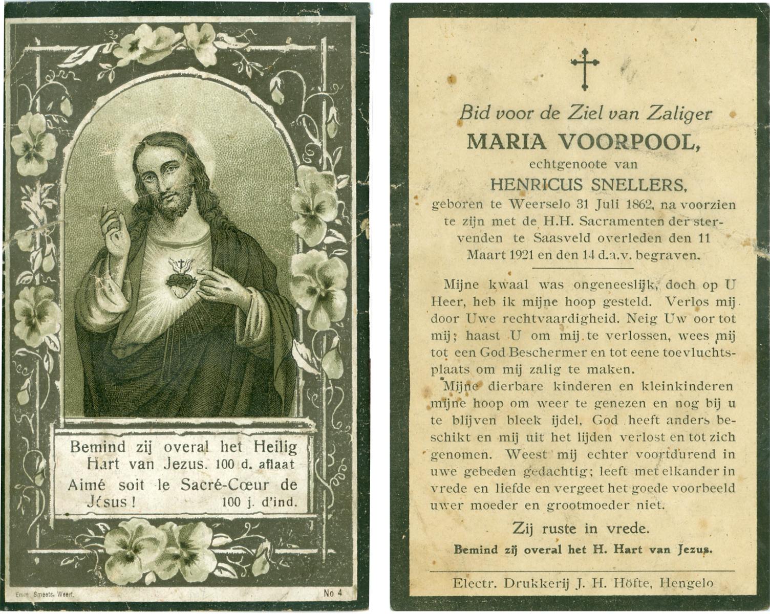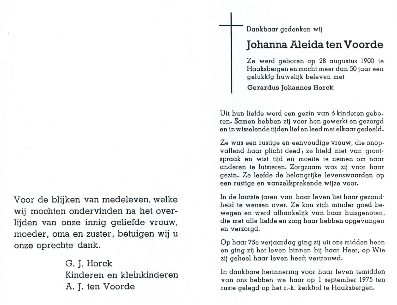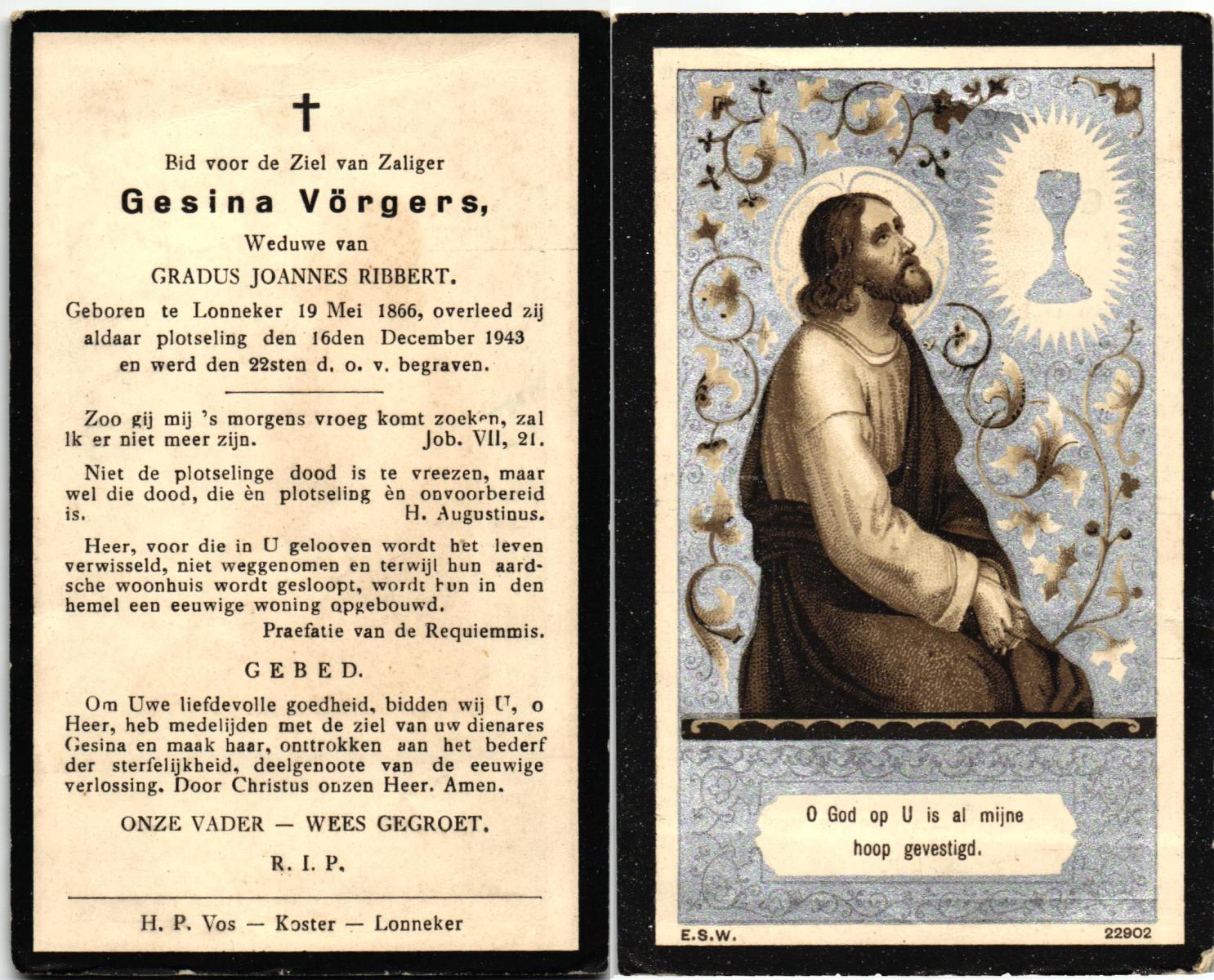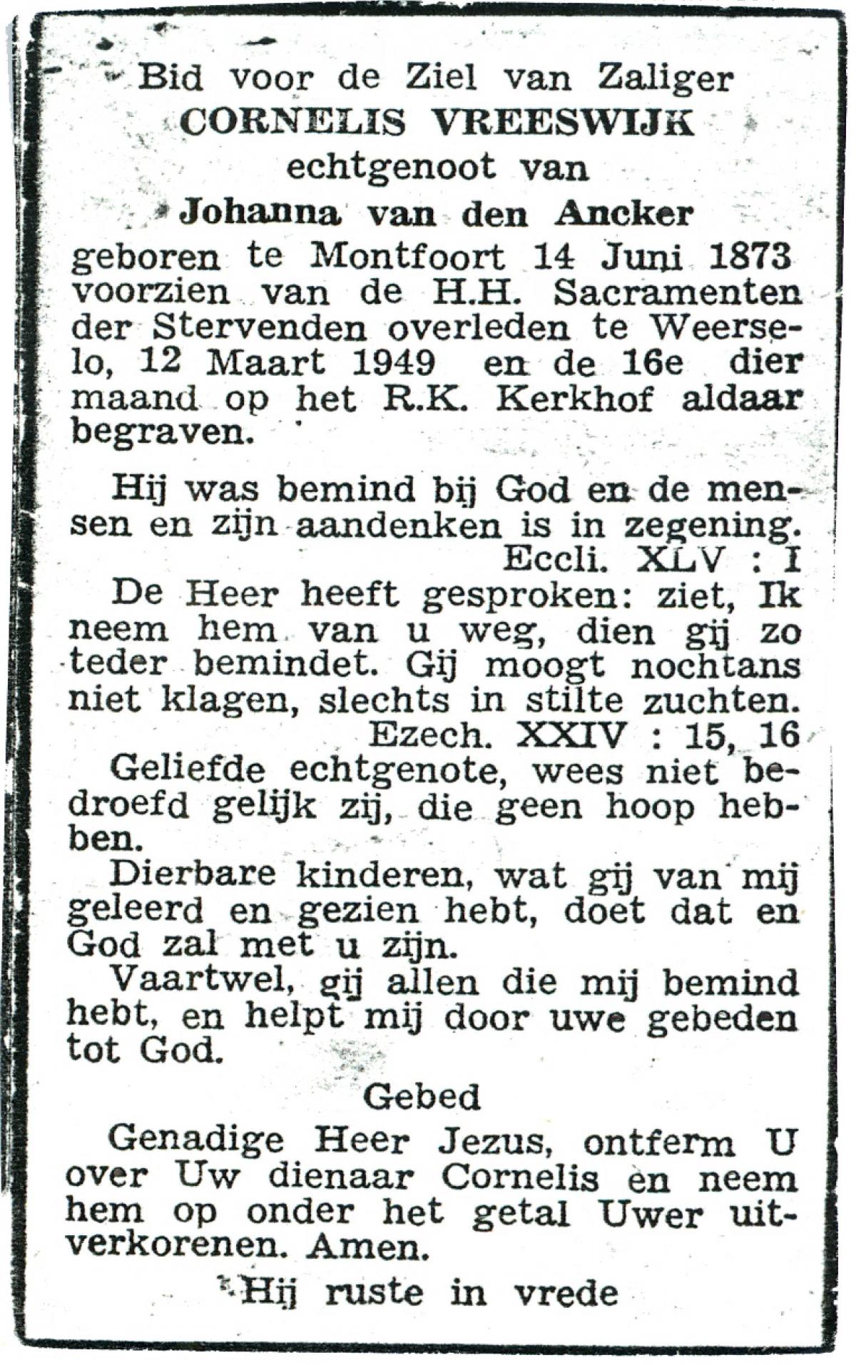 VLIET, van, Johanna, geboren op 03-02-1881 te Vinkeveen, overleden op 14-9-1962 te Delden op 81-jarige leeftijd, begraven op 18-9-1962 te Delden parochie-kerkhof H.Blasius.