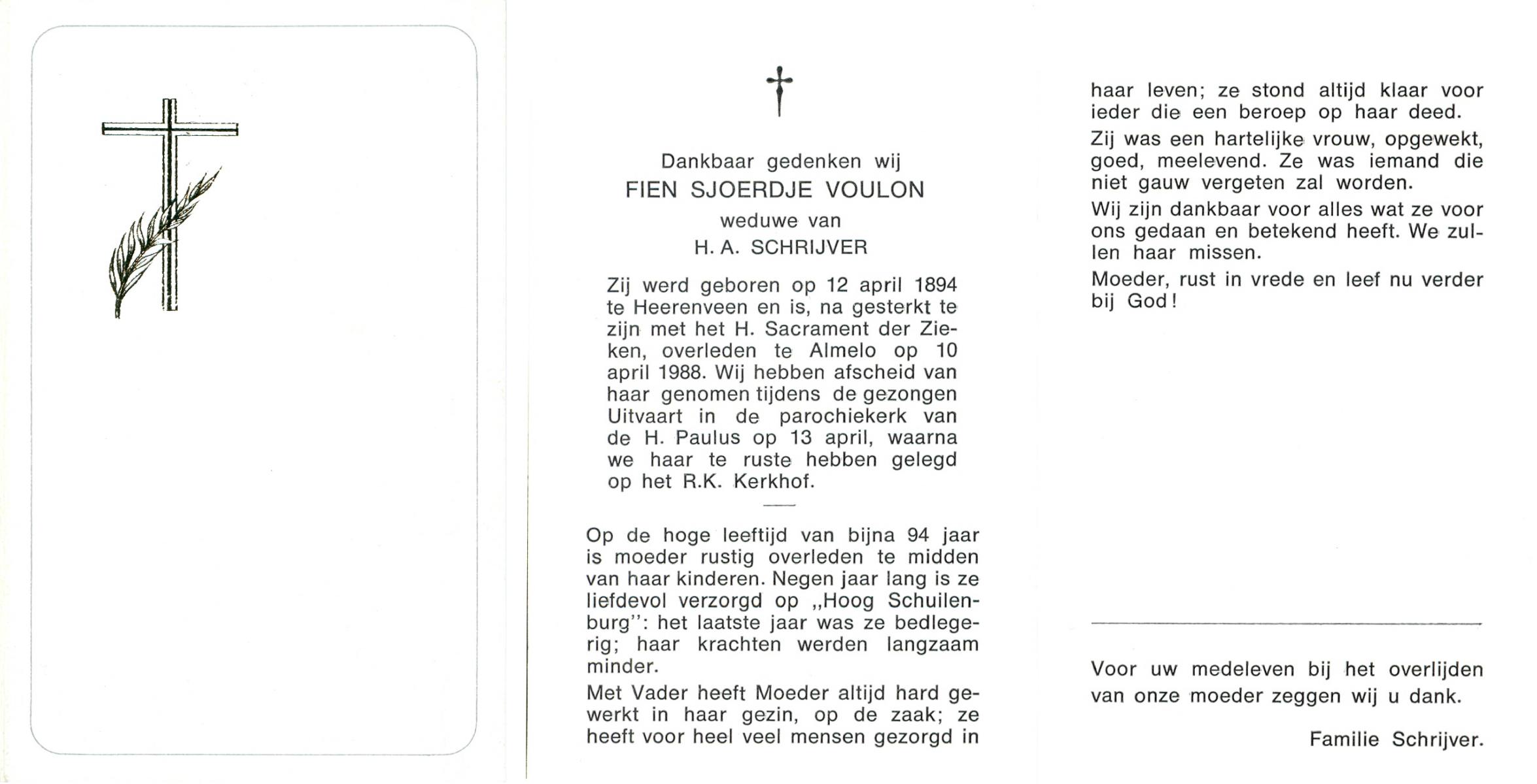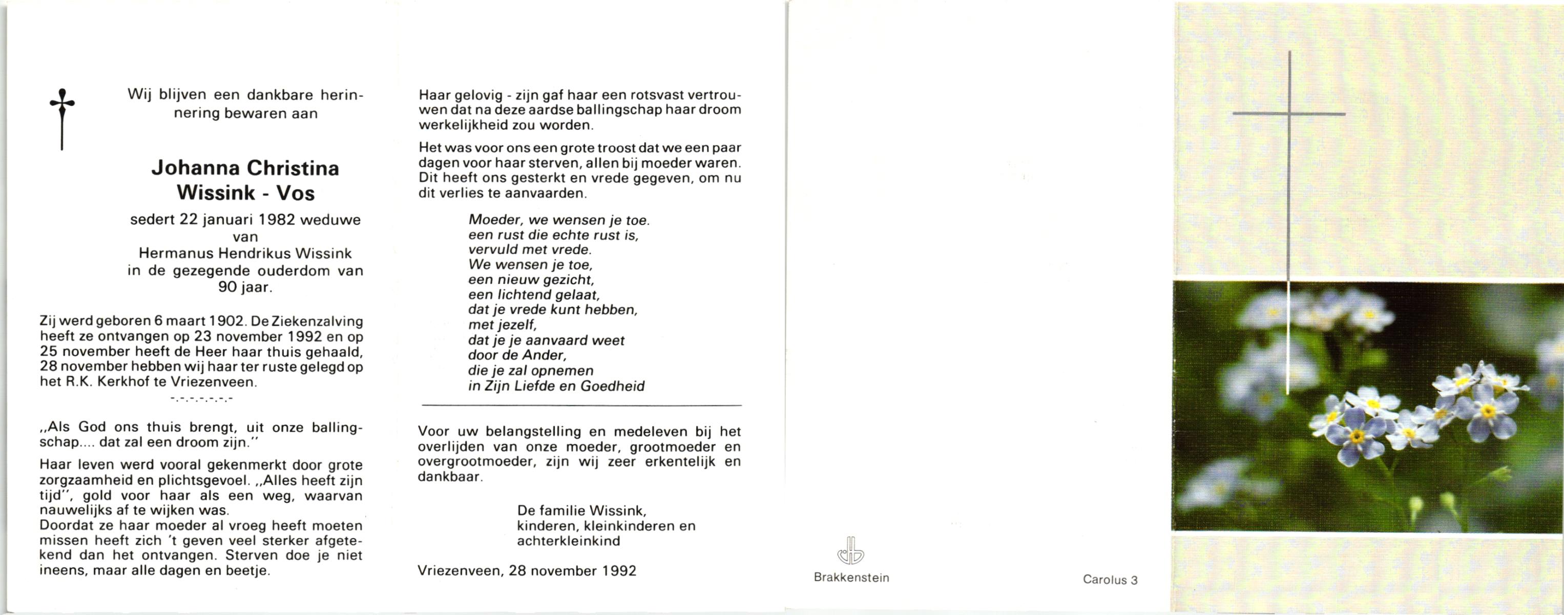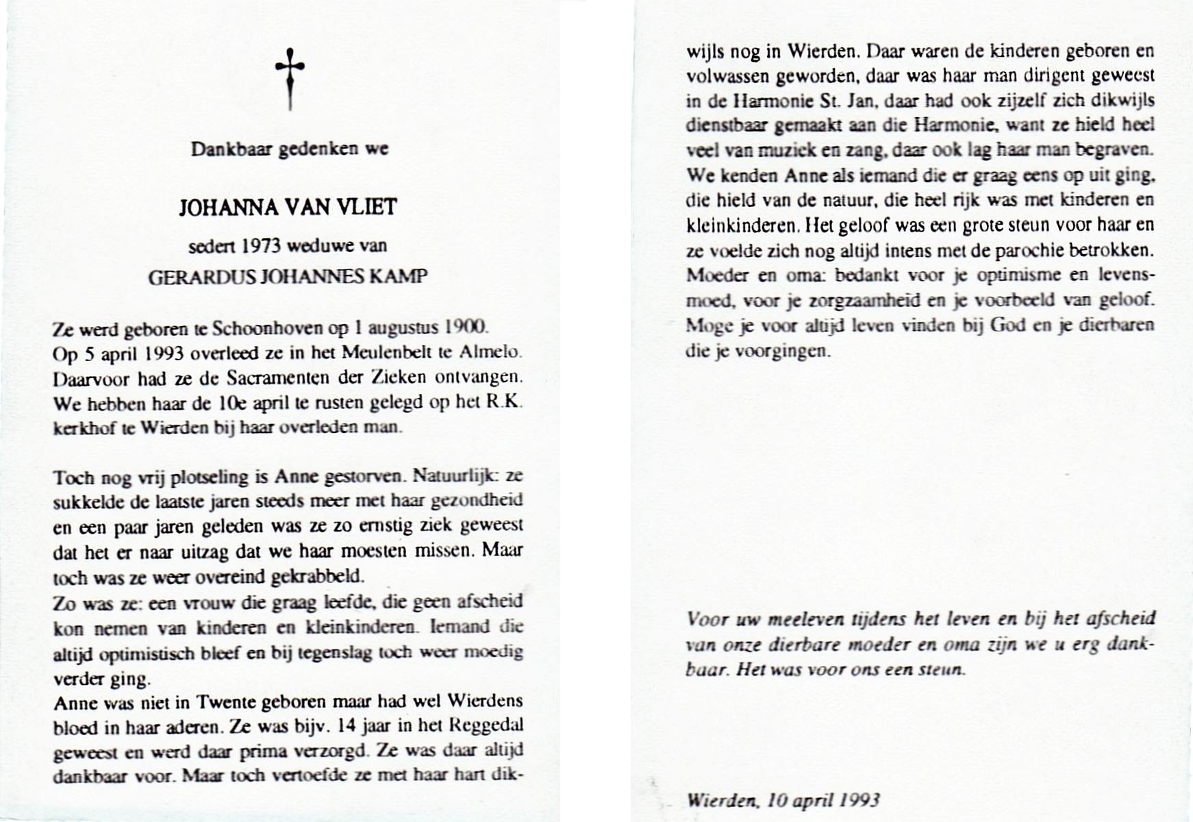VLIET, van, Johanna, geboren op 1-8-1900 te Schoonhoven, overleden op 5-4-1993 te Almelo op 92-jarige leeftijd, begraven op 10-4-1993 te Wierden.