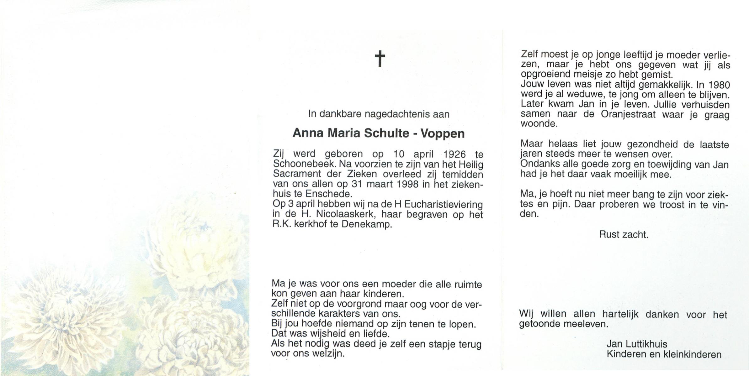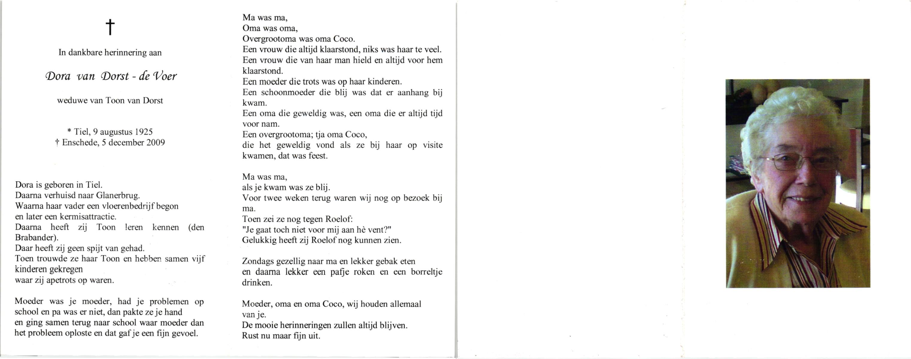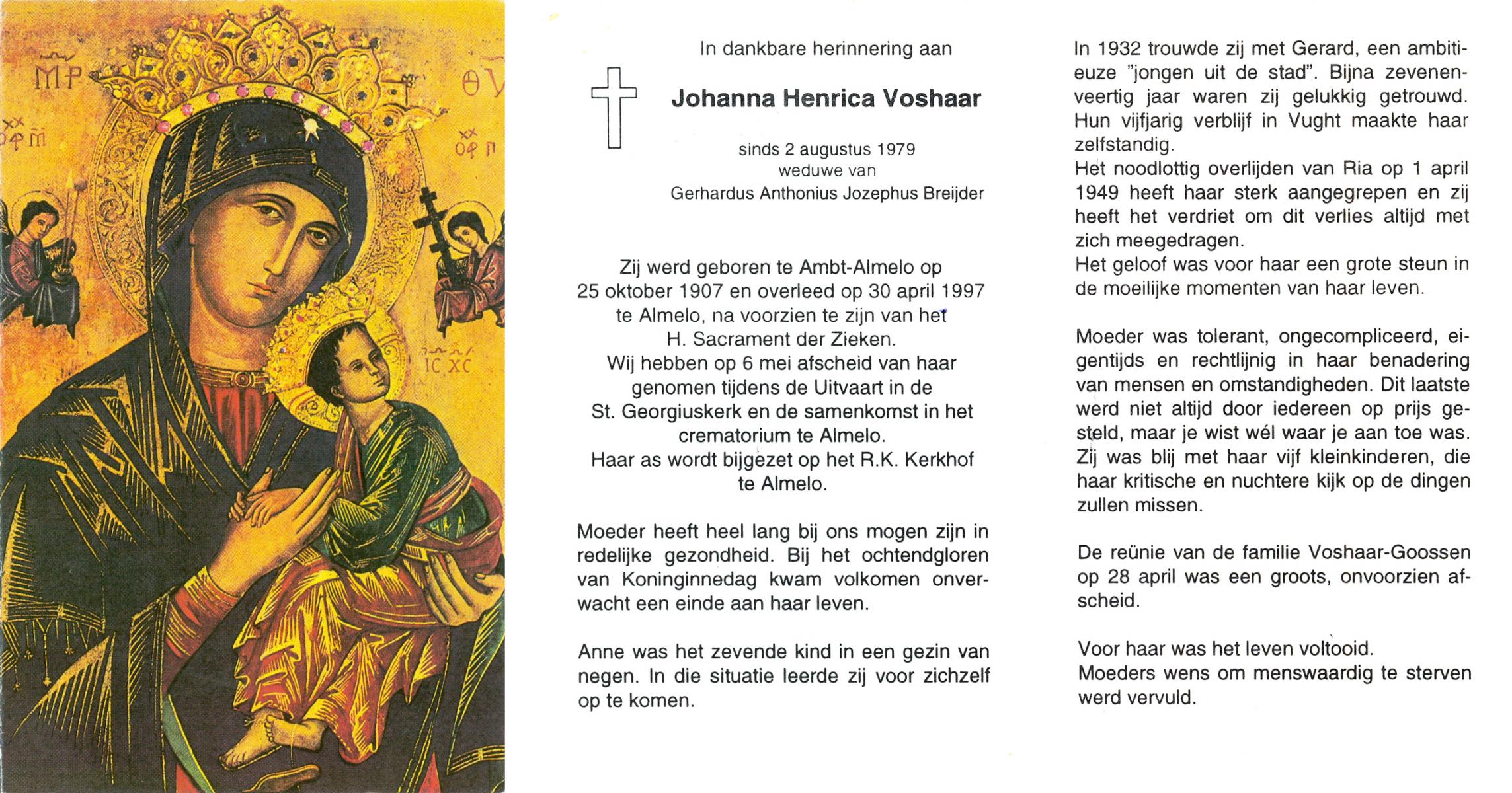 VLIET, van, Johanna, geboren op 1-8-1900 te Schoonhoven, overleden op 5-4-1993 te Almelo op 92-jarige leeftijd, begraven op 10-4-1993 te Wierden.