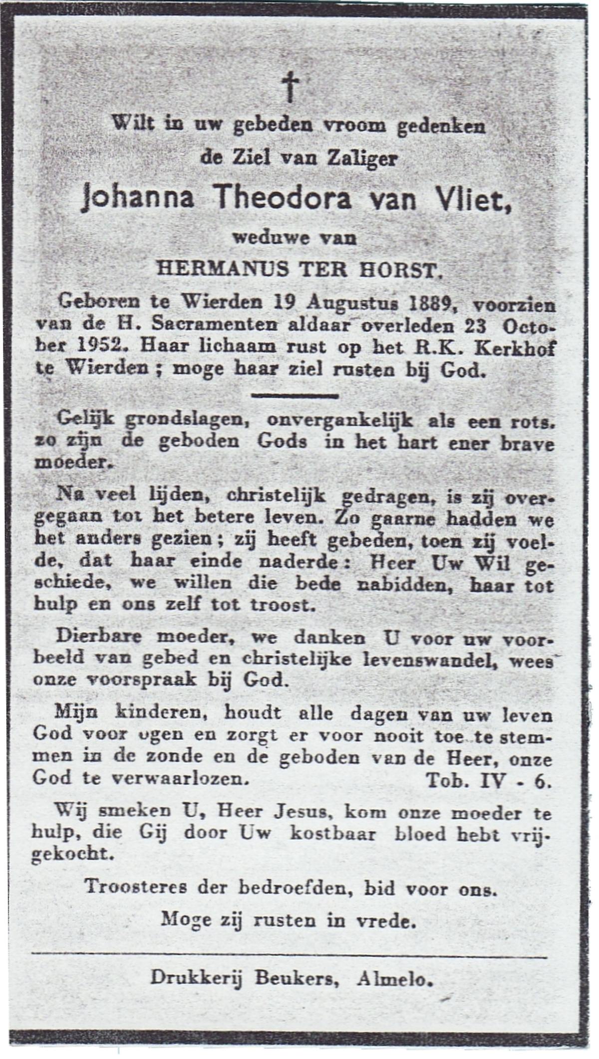 VLIET, van, Johanna Theodora, geboren op 19-08-1889 te Wierden, overleden op 23-10-1952 op 63-jarige leeftijd, begraven te Wierden.
