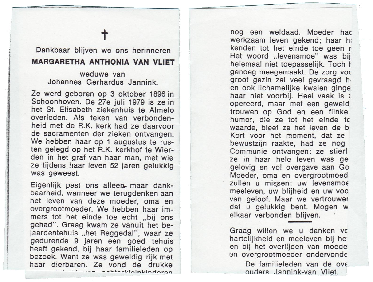 VLIET, Van, Margaretha Anthonia, geboren op 03-10-1896 te Schoonhoven, overleden op 27-7-1979 te Almelo op 82-jarige leeftijd, begraven op 1-8-1979 te Wierden.