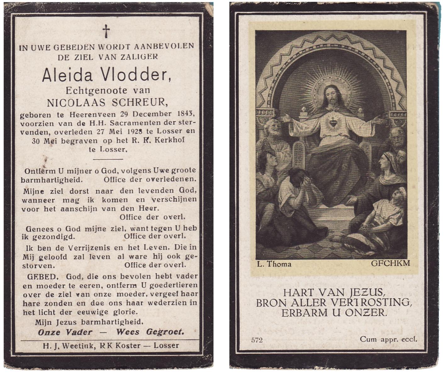 VLODDER, Aleida, geboren op 29-12-1843 te Heerenveen, overleden op 27-5-1928 te Losser op 80-jarige leeftijd, begraven op 30-5-1928 te Losser.