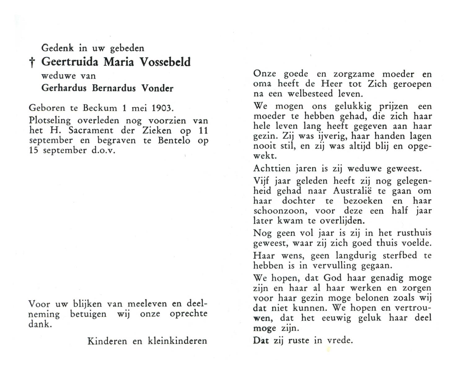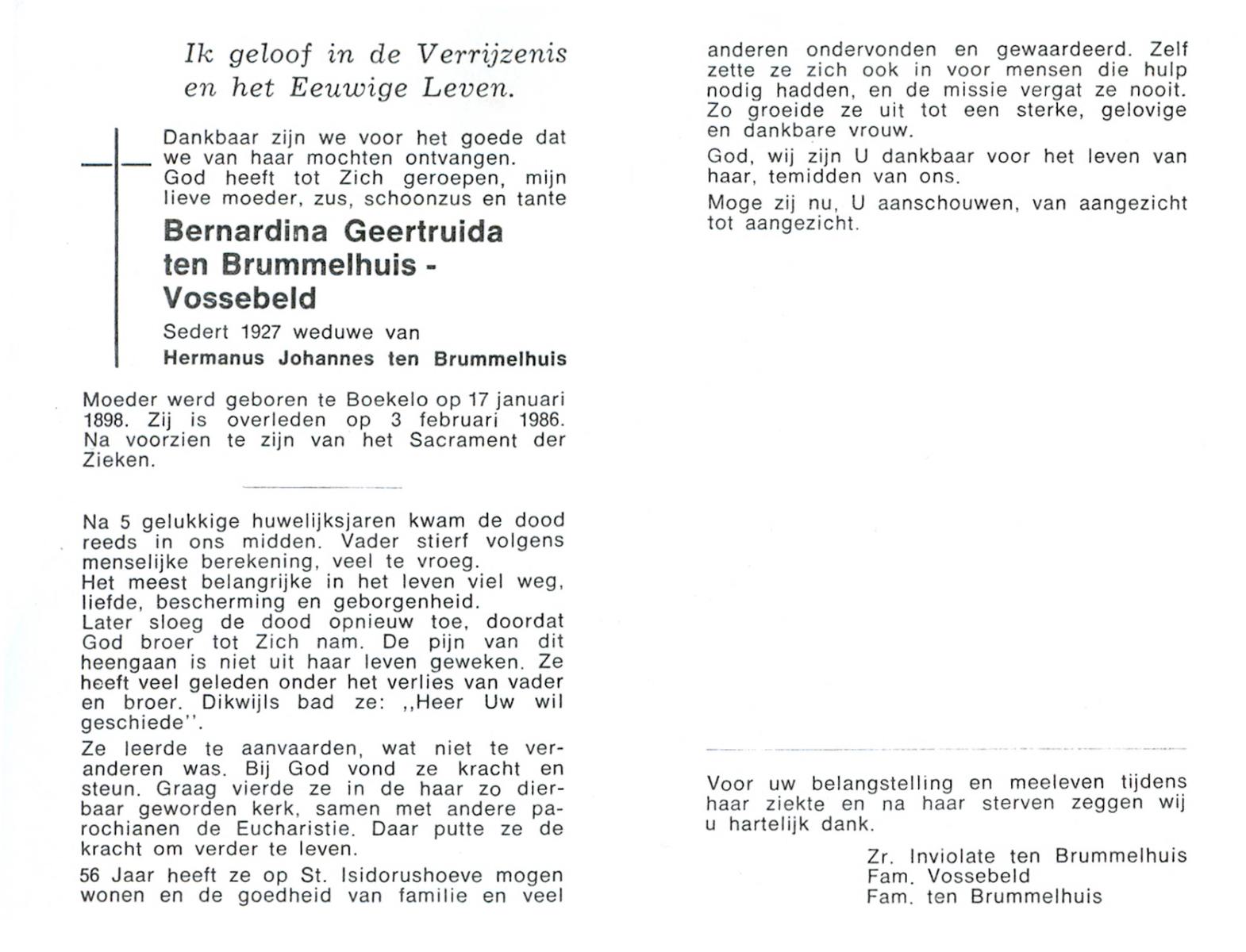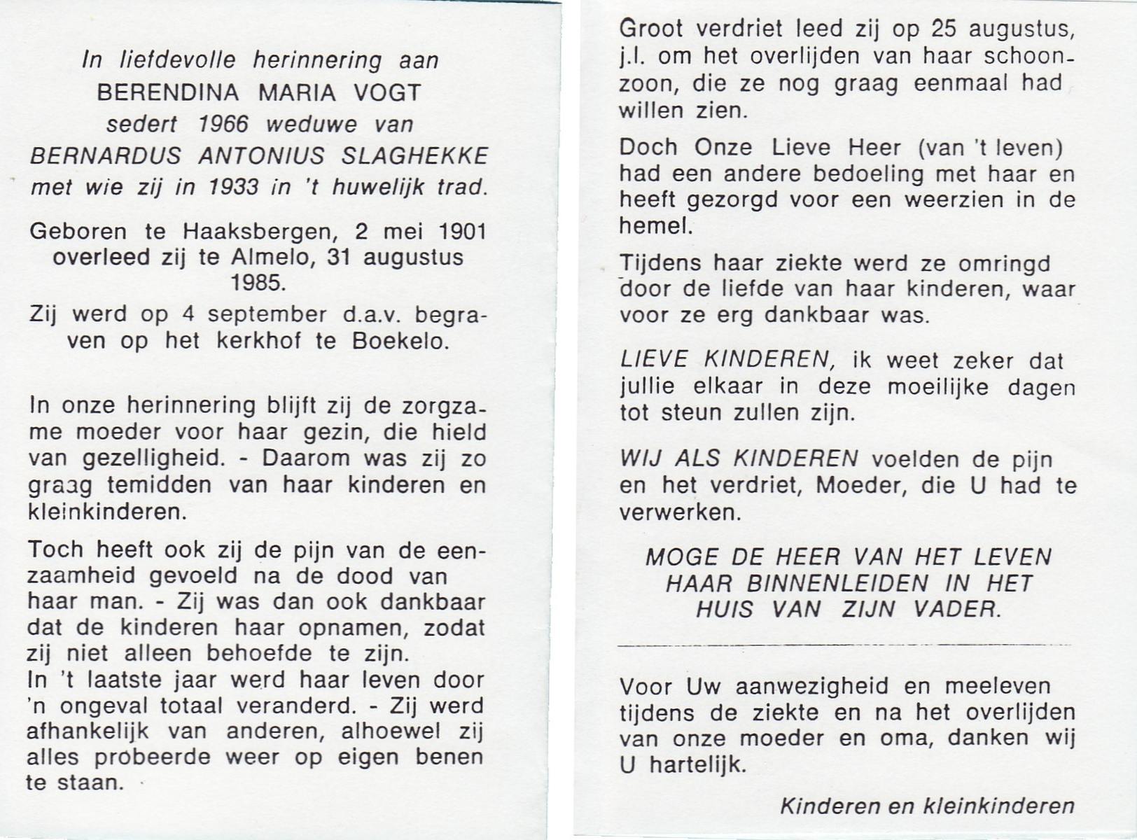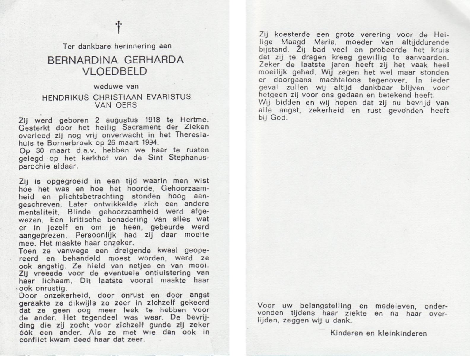 VLOEDBELD, Bernardina Gerharda, geboren op 2-8-1918 te Hertme, overleden op 26-3-1994 te Bornerbroek op 75-jarige leeftijd, begraven op 30-3-1994 te Bornerbroek.
