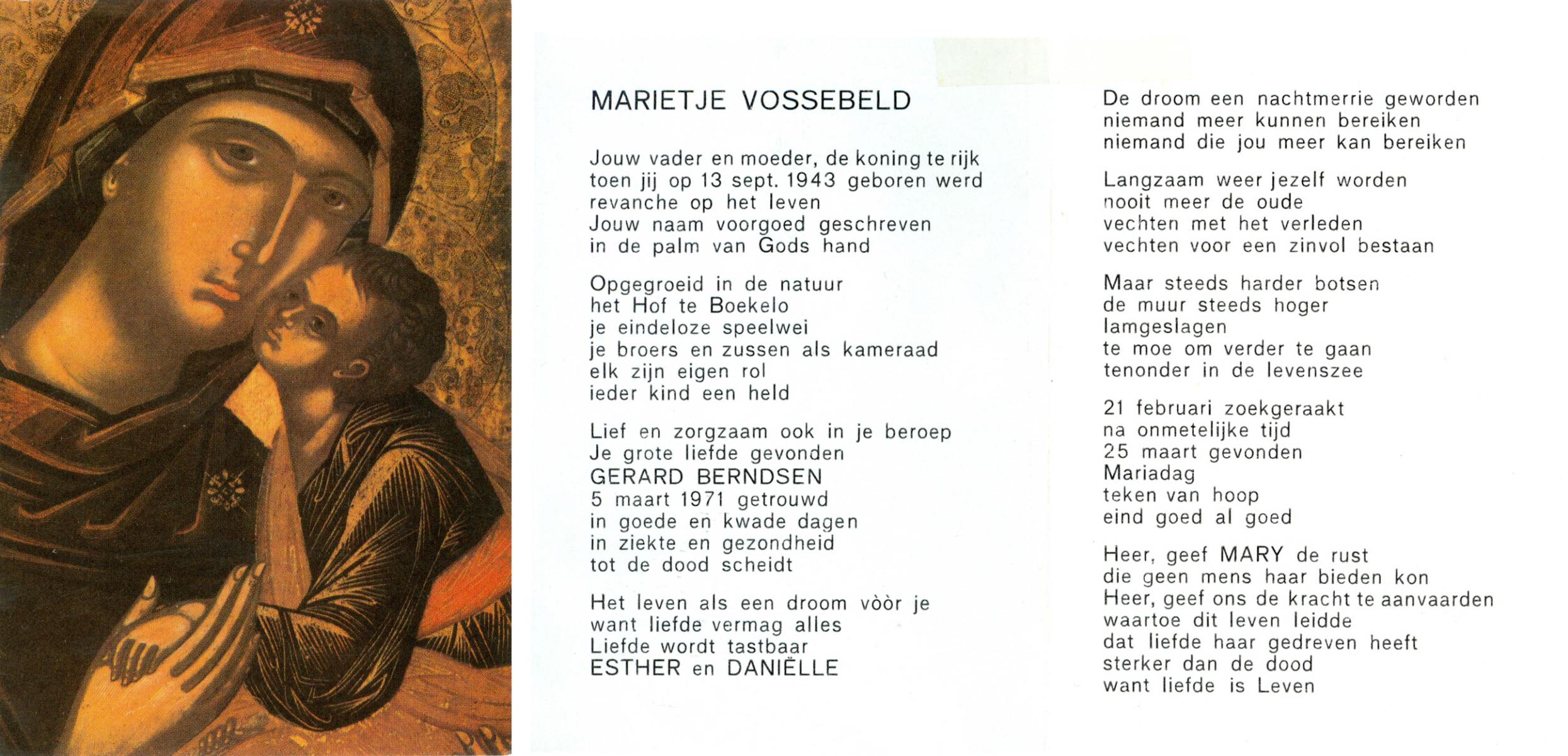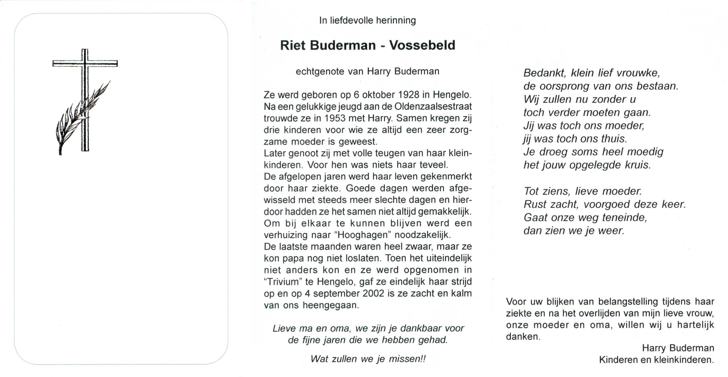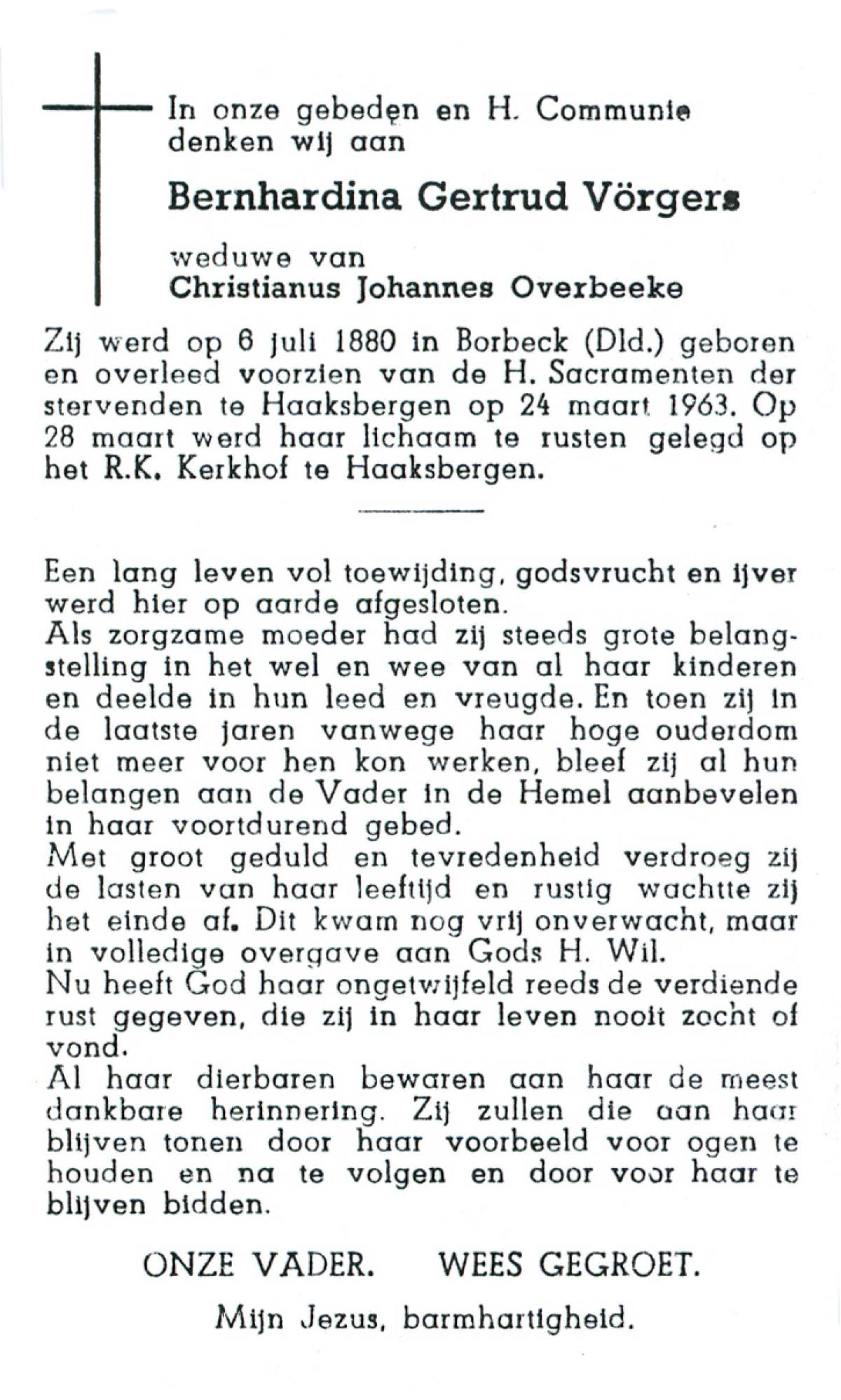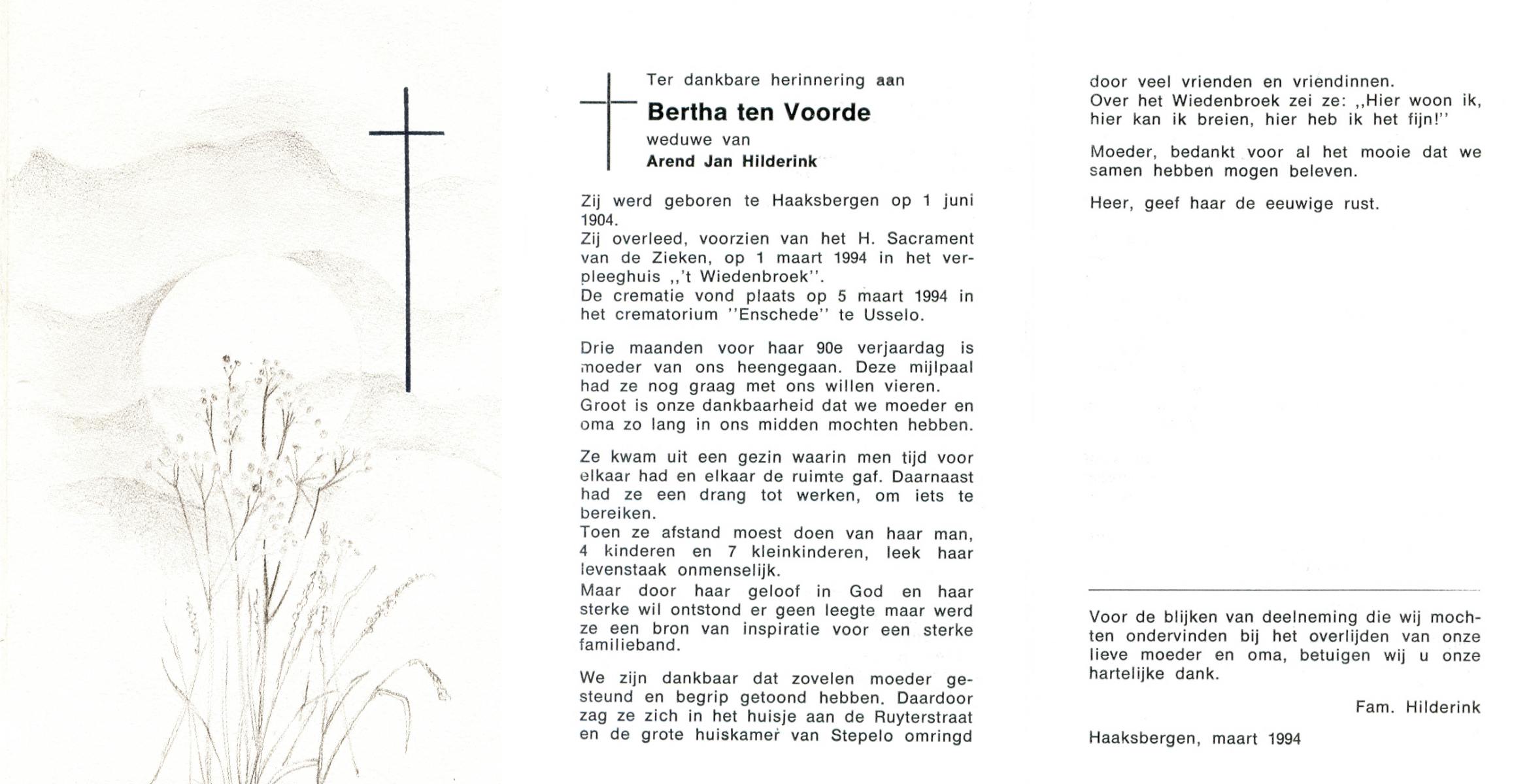 VLOEDBELD, Bernardina Gerharda, geboren op 2-8-1918 te Hertme, overleden op 26-3-1994 te Bornerbroek op 75-jarige leeftijd, begraven op 30-3-1994 te Bornerbroek.