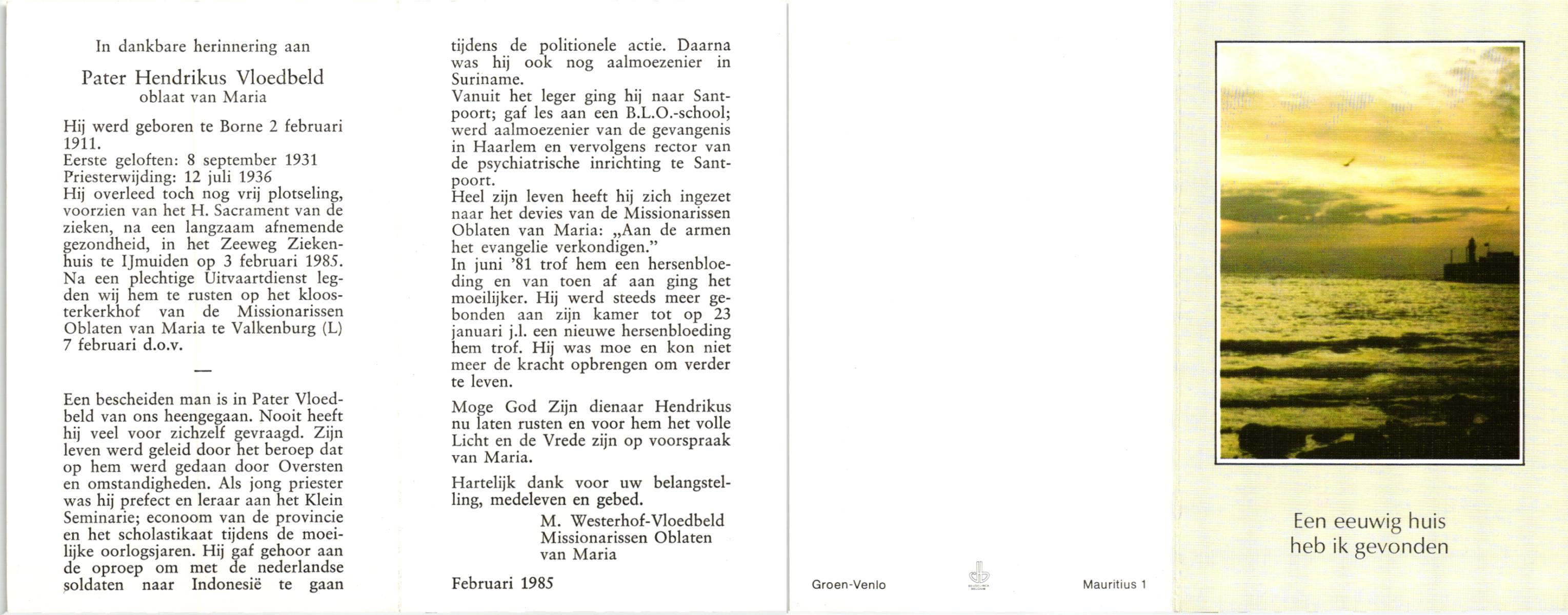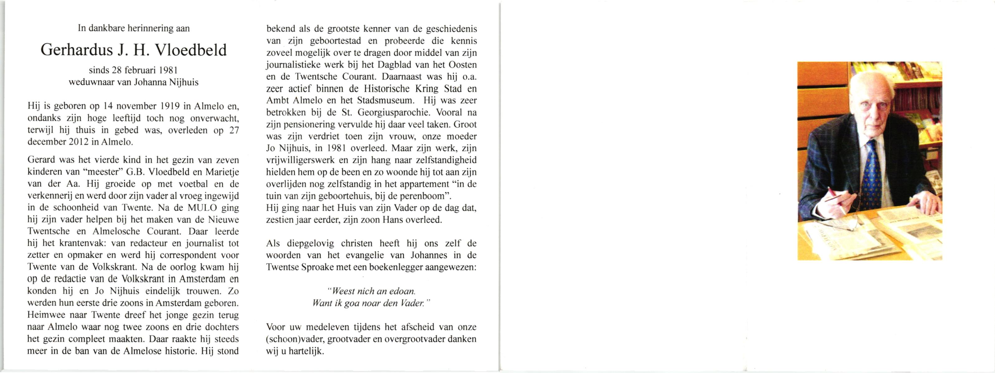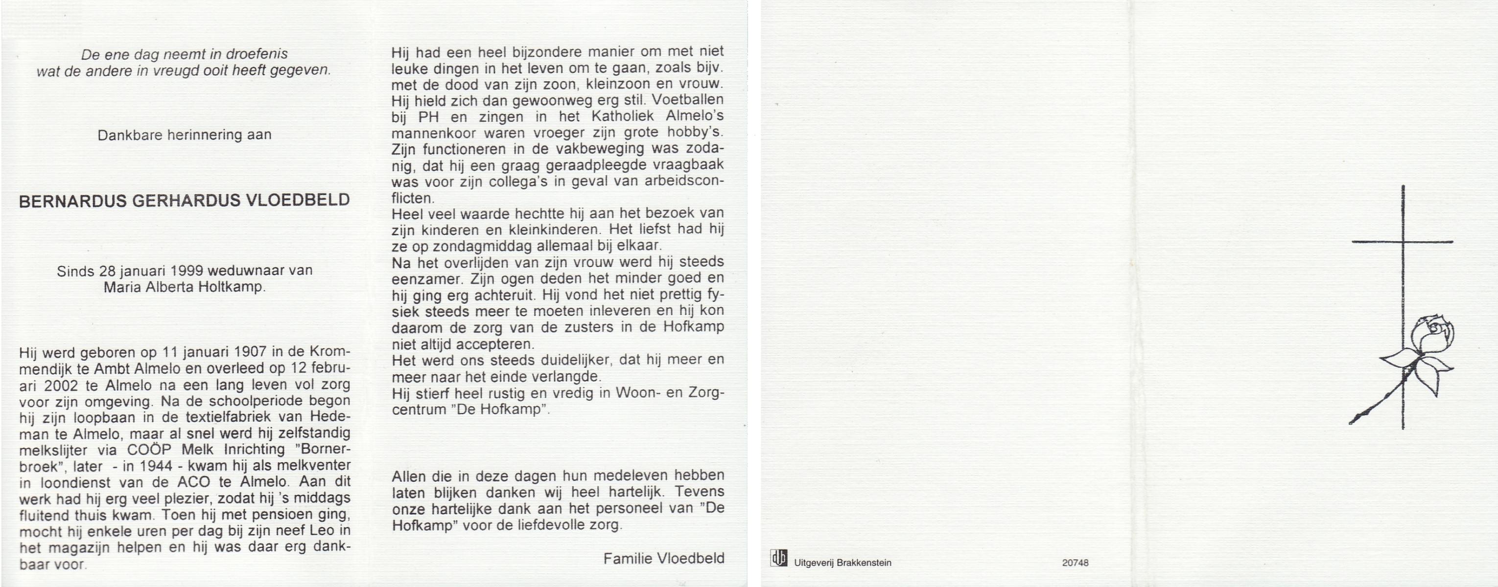 VLOEDBELD, Bernardus Gerhardus, geboren op 11-1-1907 te Almelo, Ambt, overleden op 12-2-2002 te Almelo op 95-jarige leeftijd.