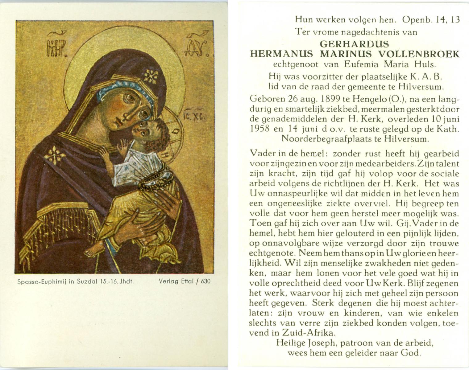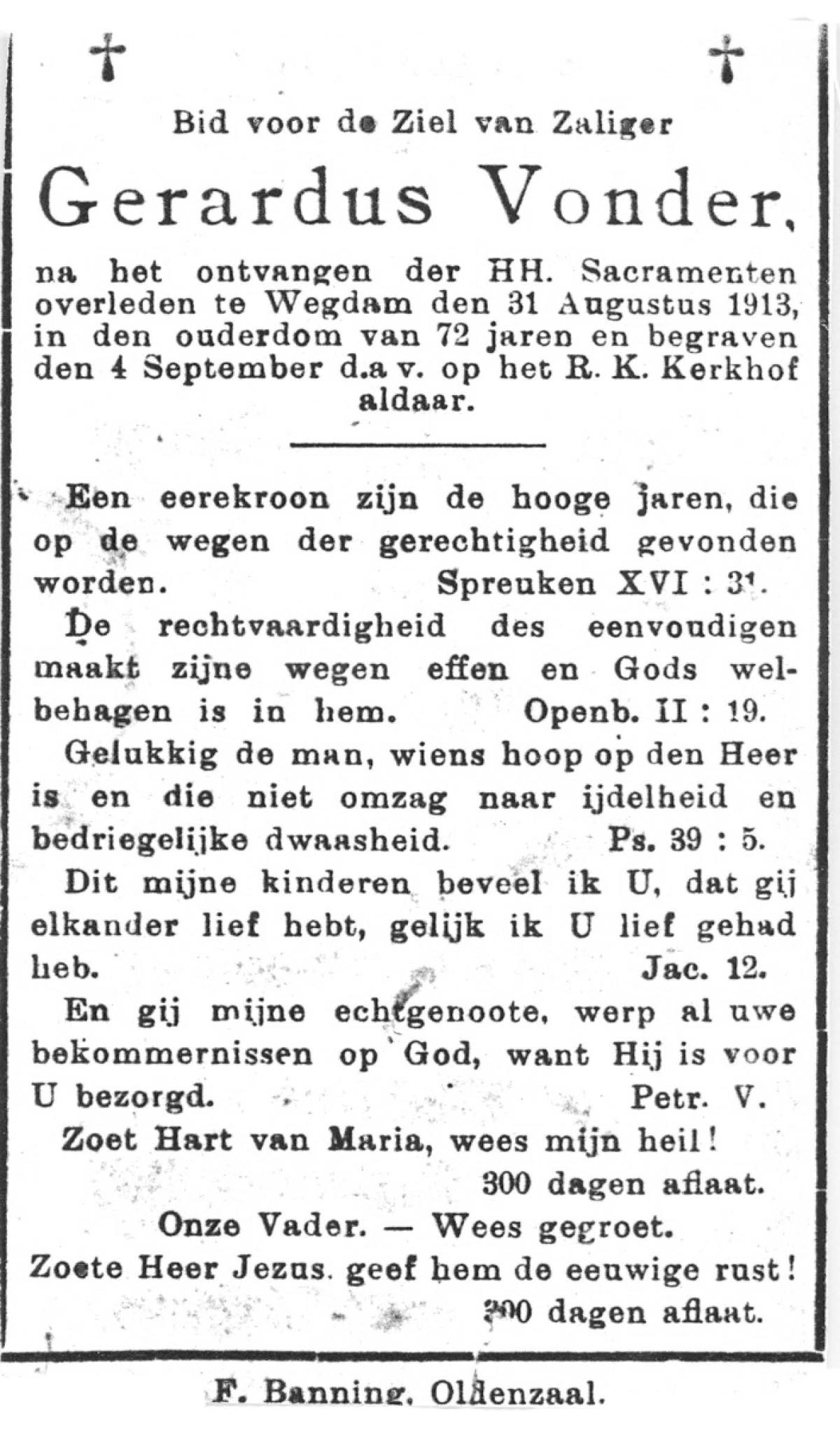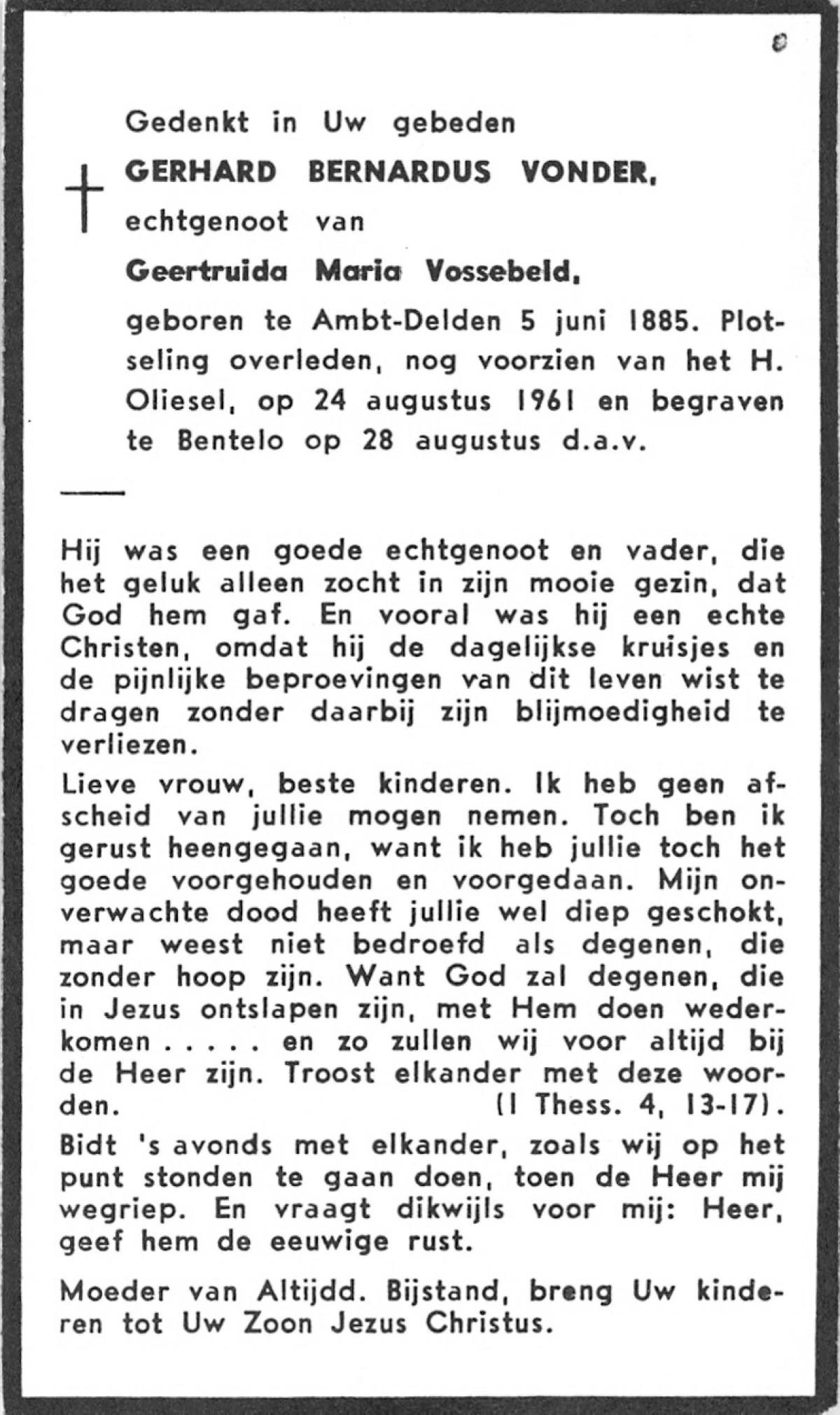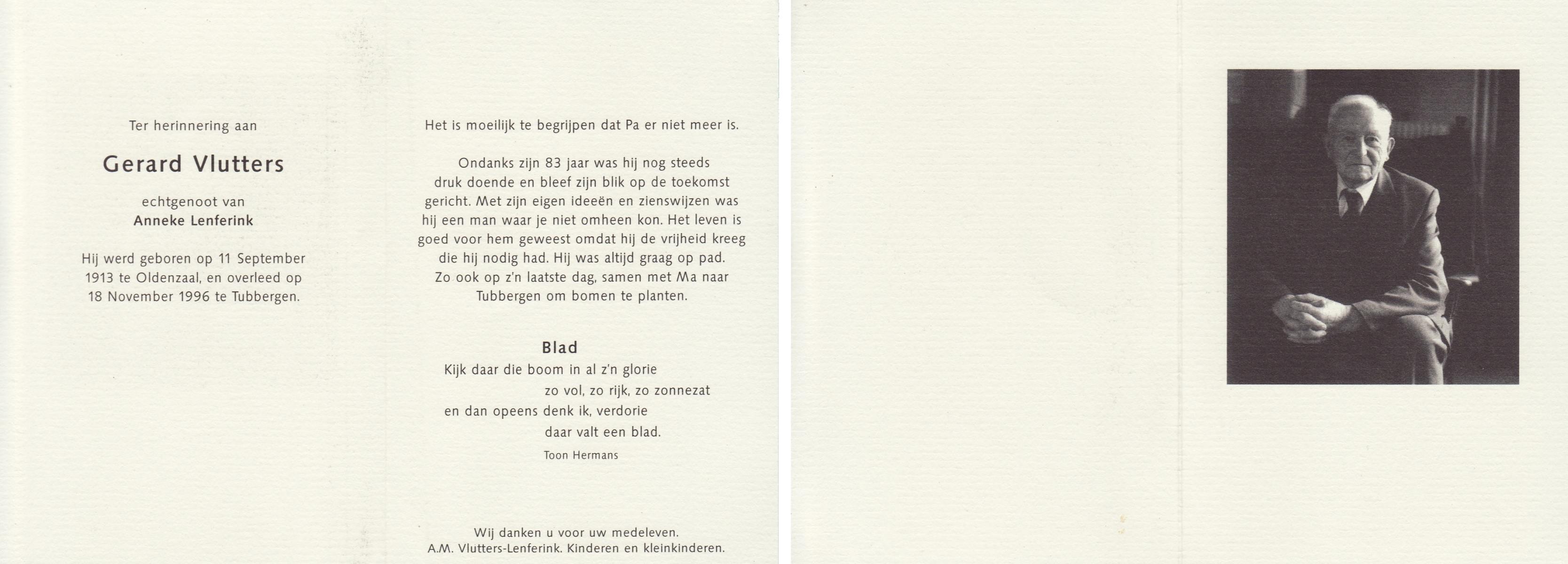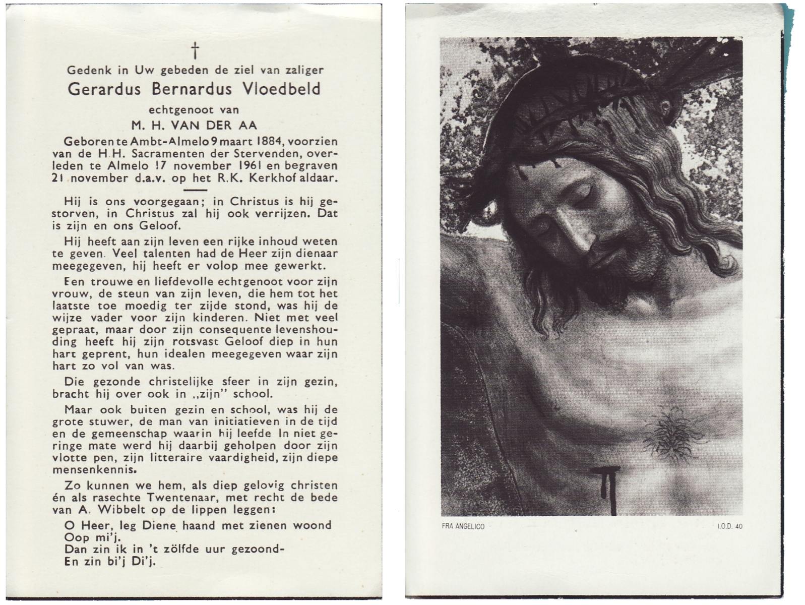VLOEDBELD, Gerardus Bernardus, geboren op 09-03-1884 te Almelo, Ambt, overleden op 17-11-1961 te Almelo op 77-jarige leeftijd, begraven op 21-11-1961 te Almelo.