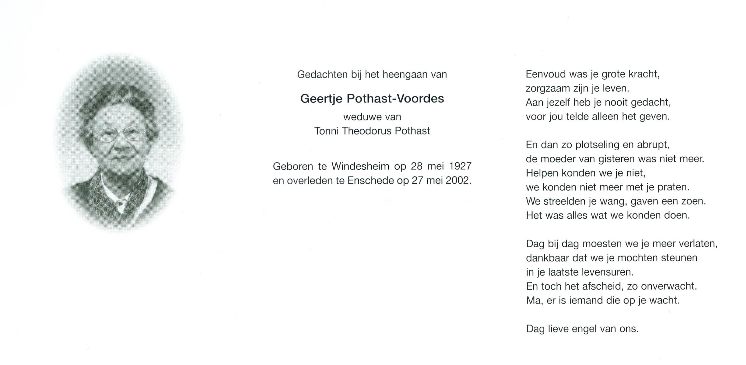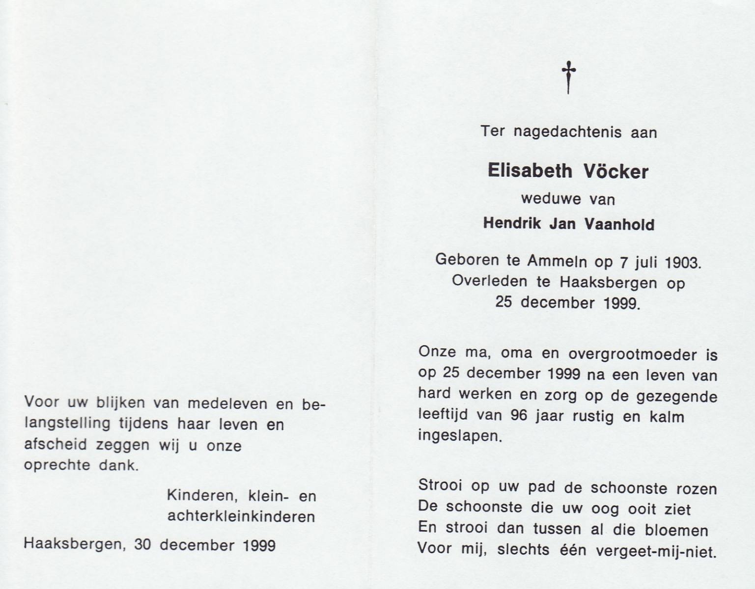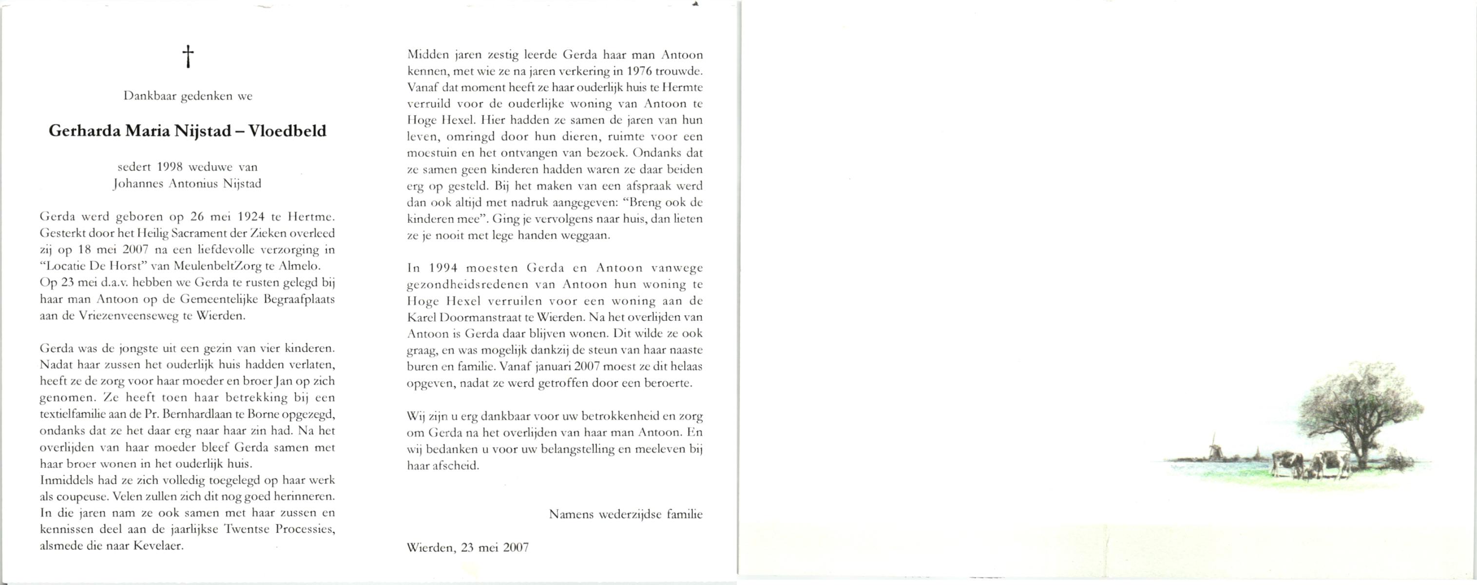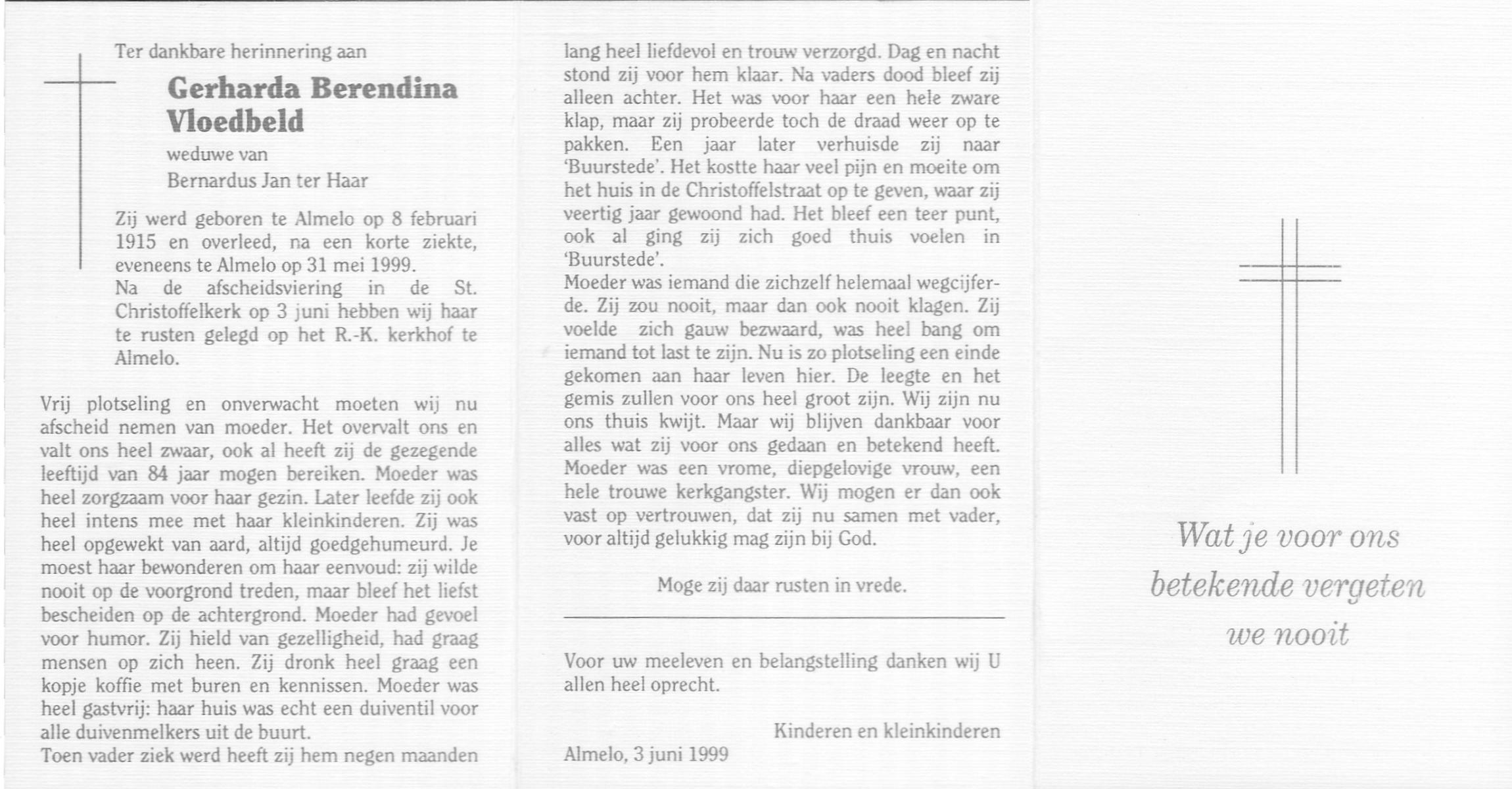 VLOEDBELD, Gerharda Berendina, geboren op 8-2-1915 te Almelo, overleden op 31-5-1999 te Almelo op 84-jarige leeftijd, begraven op 3-6-1999 te Almelo R.K.Kerkhof.
