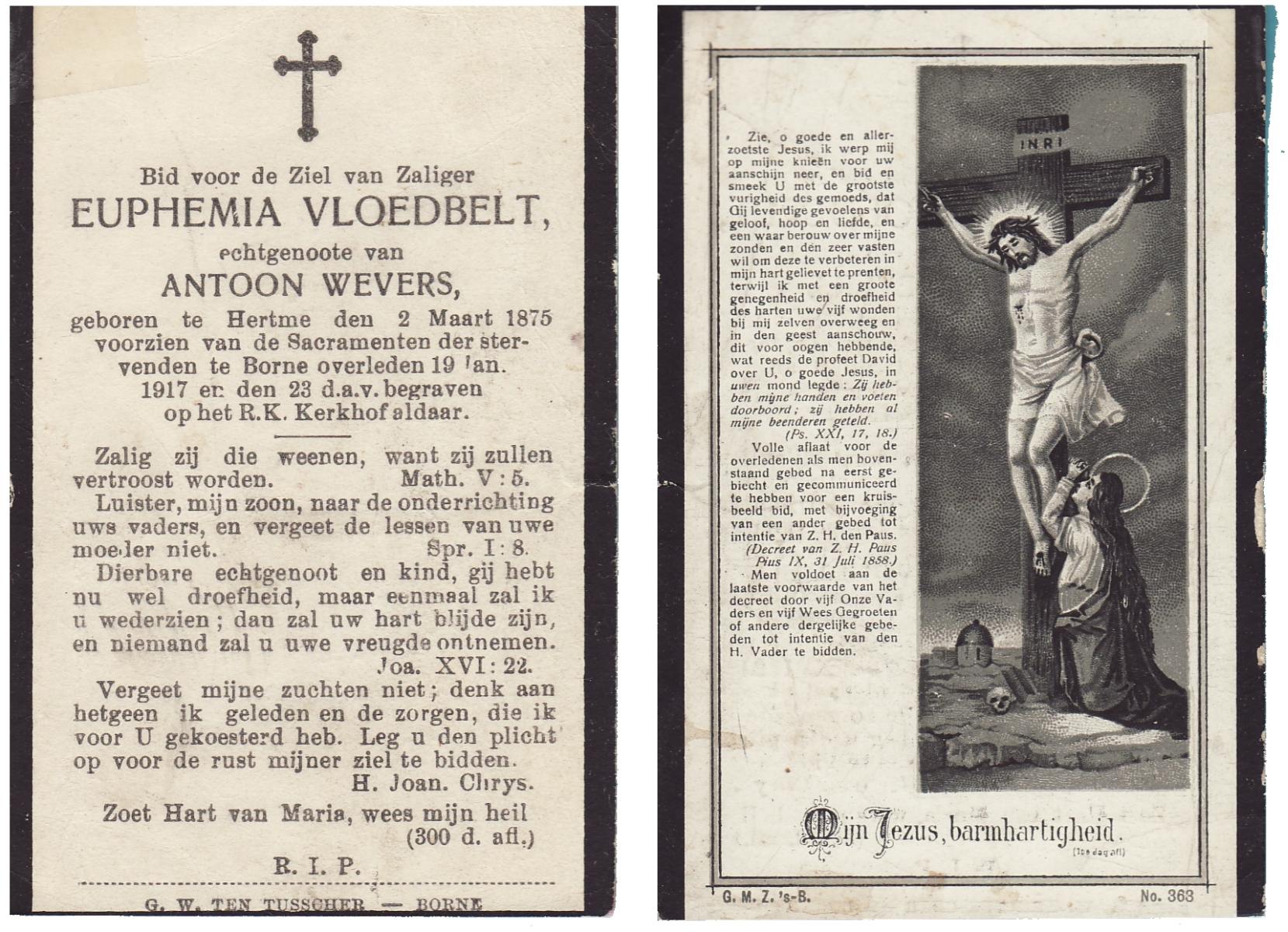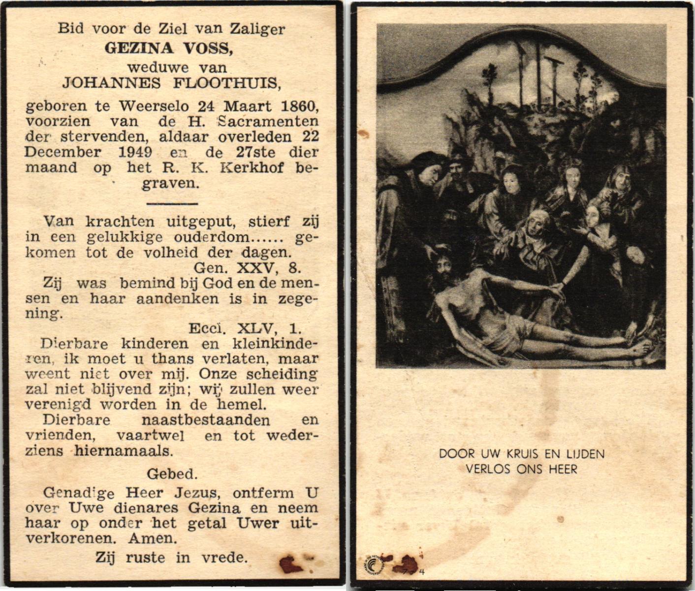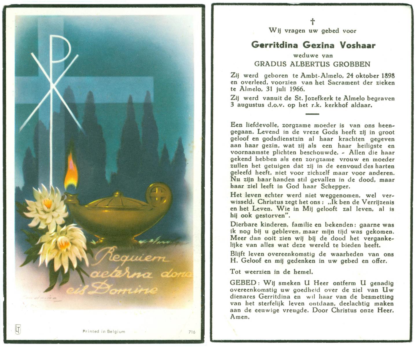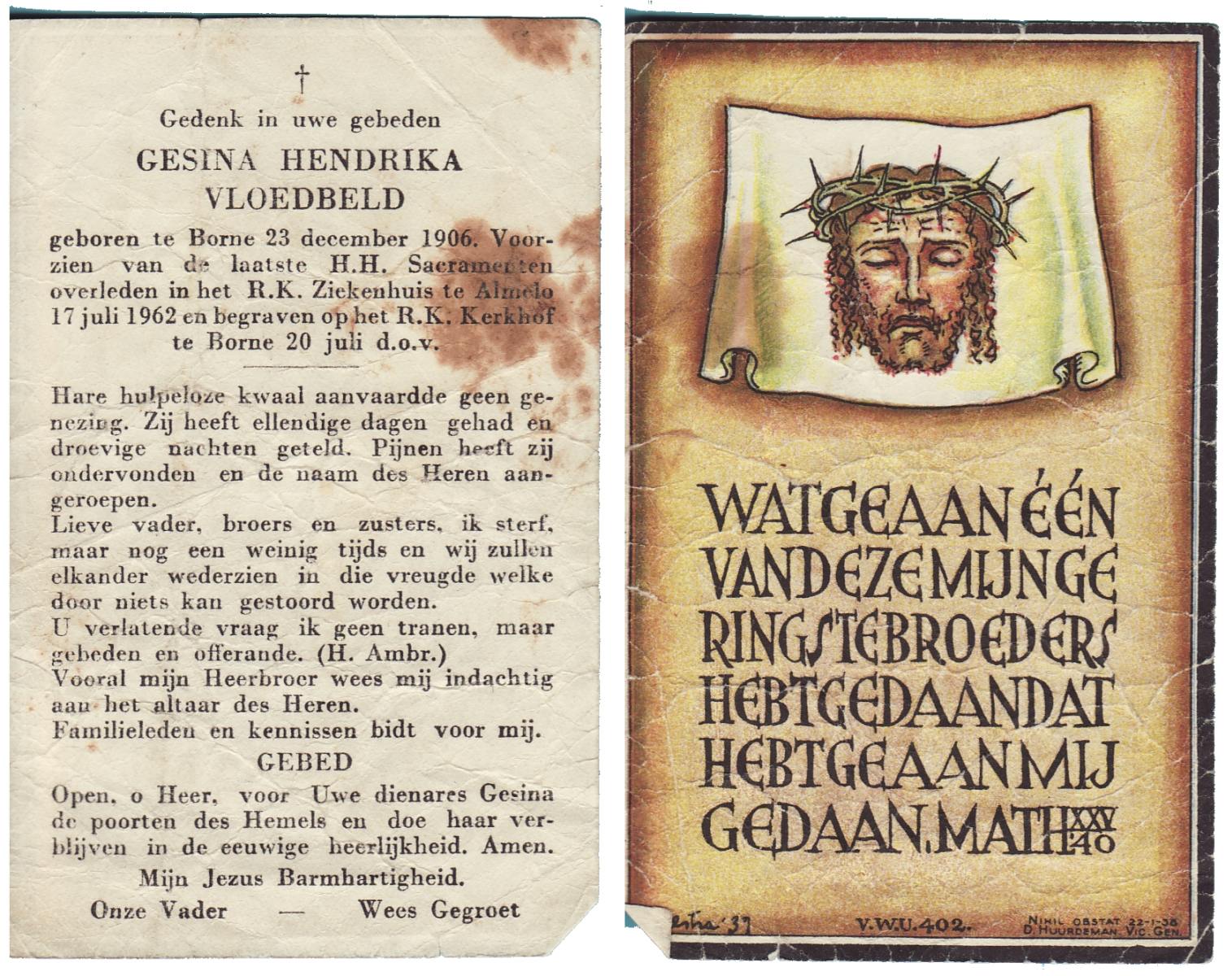 VLOEDBELD, Gesina Hendrika, geboren op 23-12-1906 te Borne, overleden op 17-7-1962 te Almelo op 55-jarige leeftijd, begraven op 20-7-1962 te Borne.