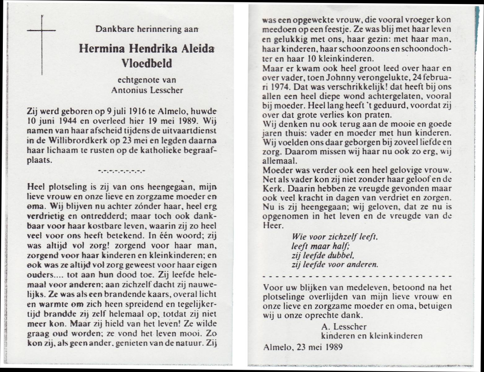 VLOEDBELD, Hermina Hendrika Aleida, geboren op 9-7-1916 te Almelo, overleden op 19-5-1989 te Almelo op 72-jarige leeftijd, begraven op 23-5-1989 te Almelo.