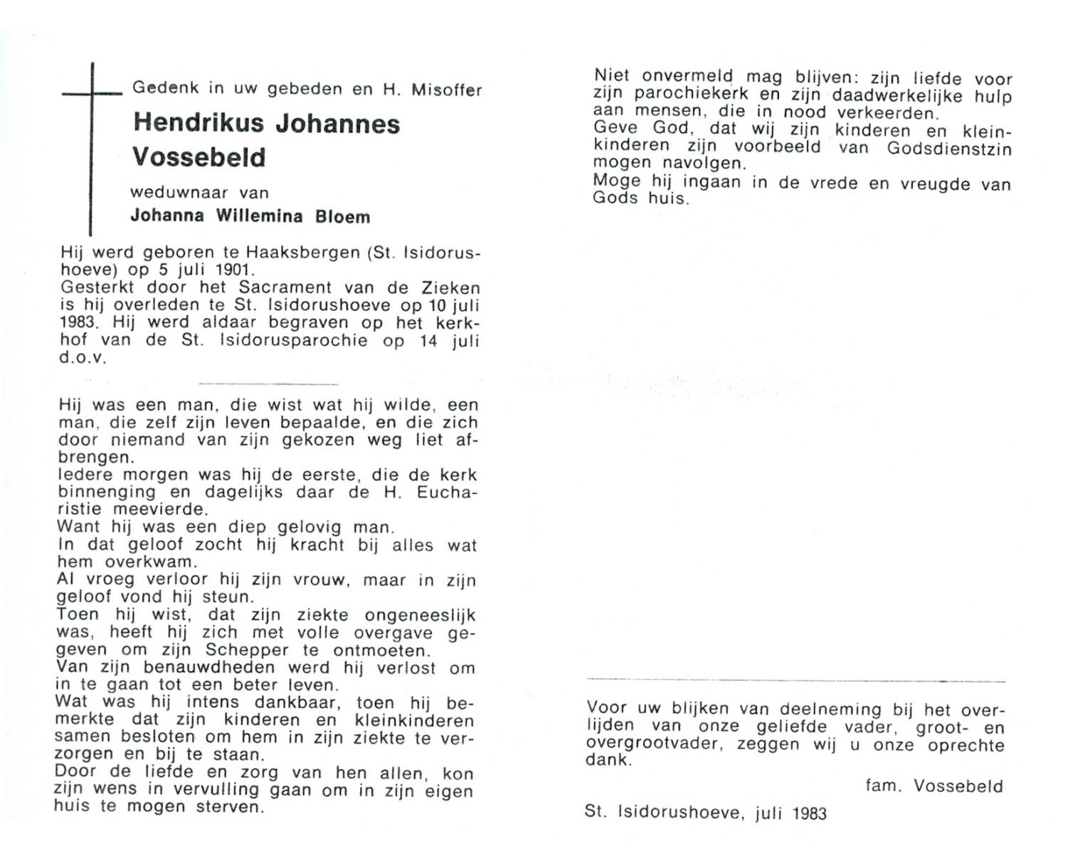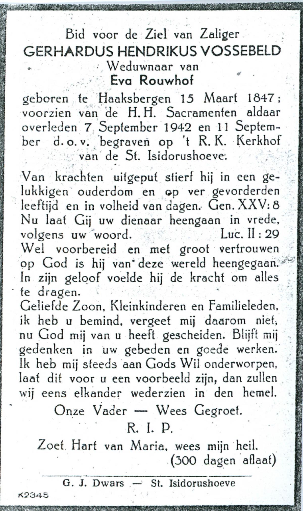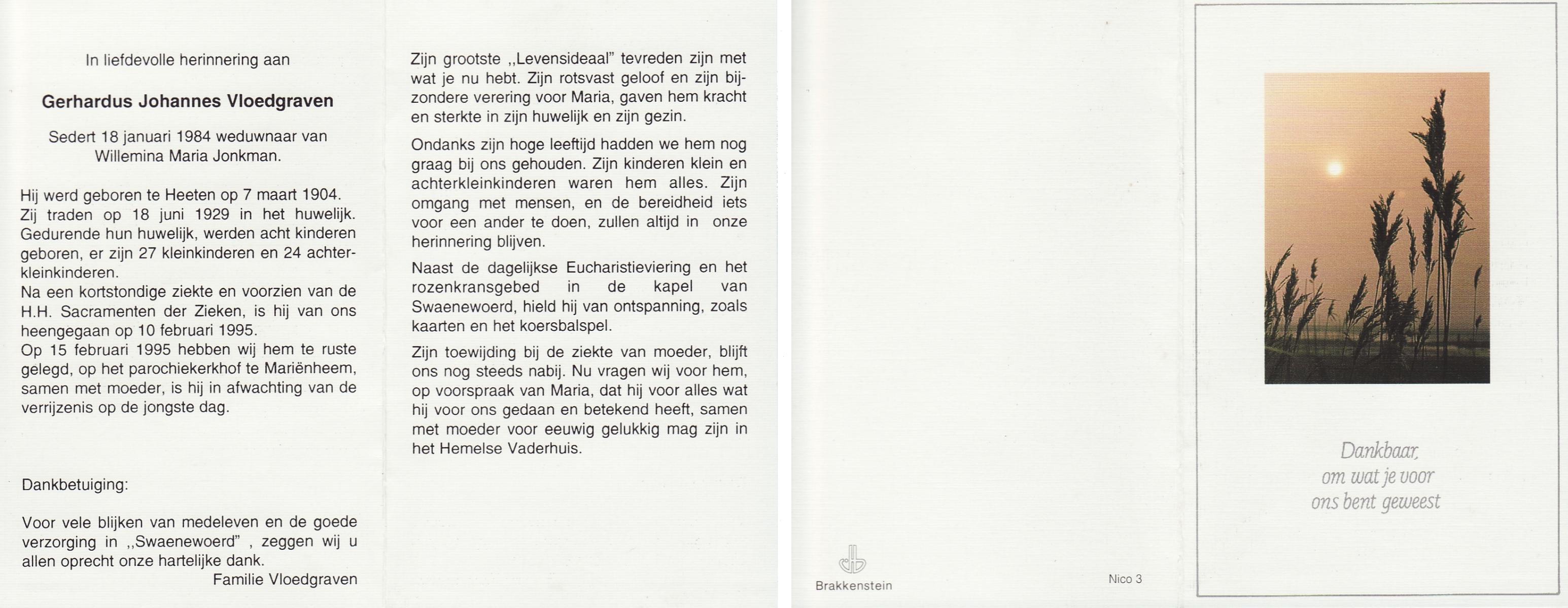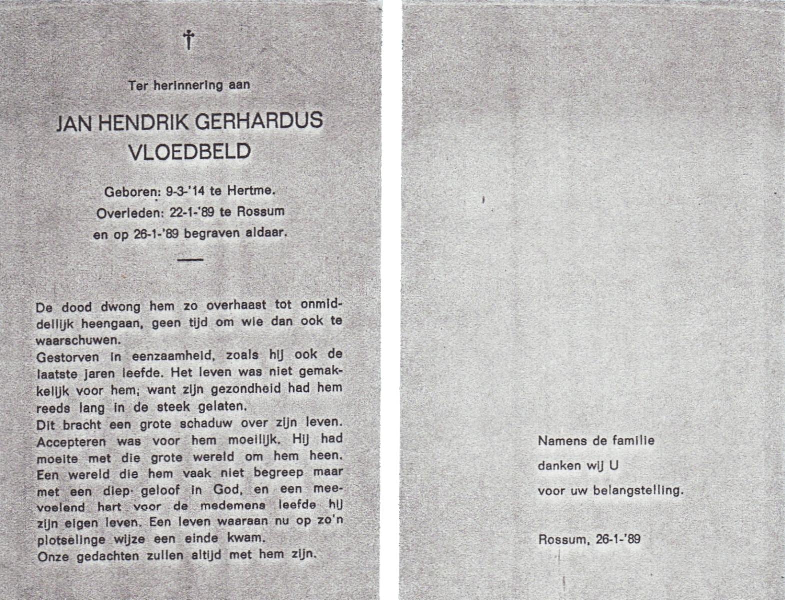 VLOEDBELD, Jan Hendrik Gerhardus, geboren op 9-3-1914 te Hertme, overleden op 22-1-1989 te Rossum op 74-jarige leeftijd, begraven op 26-1-1989 te Rossum.