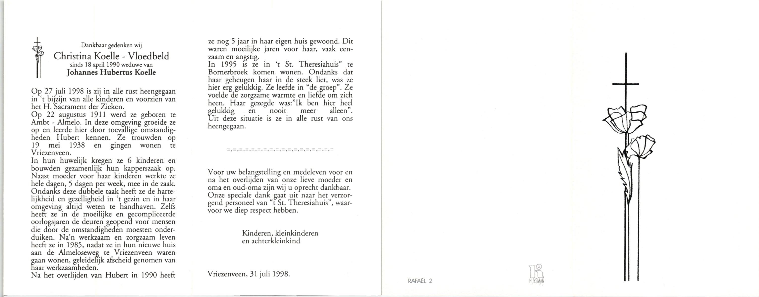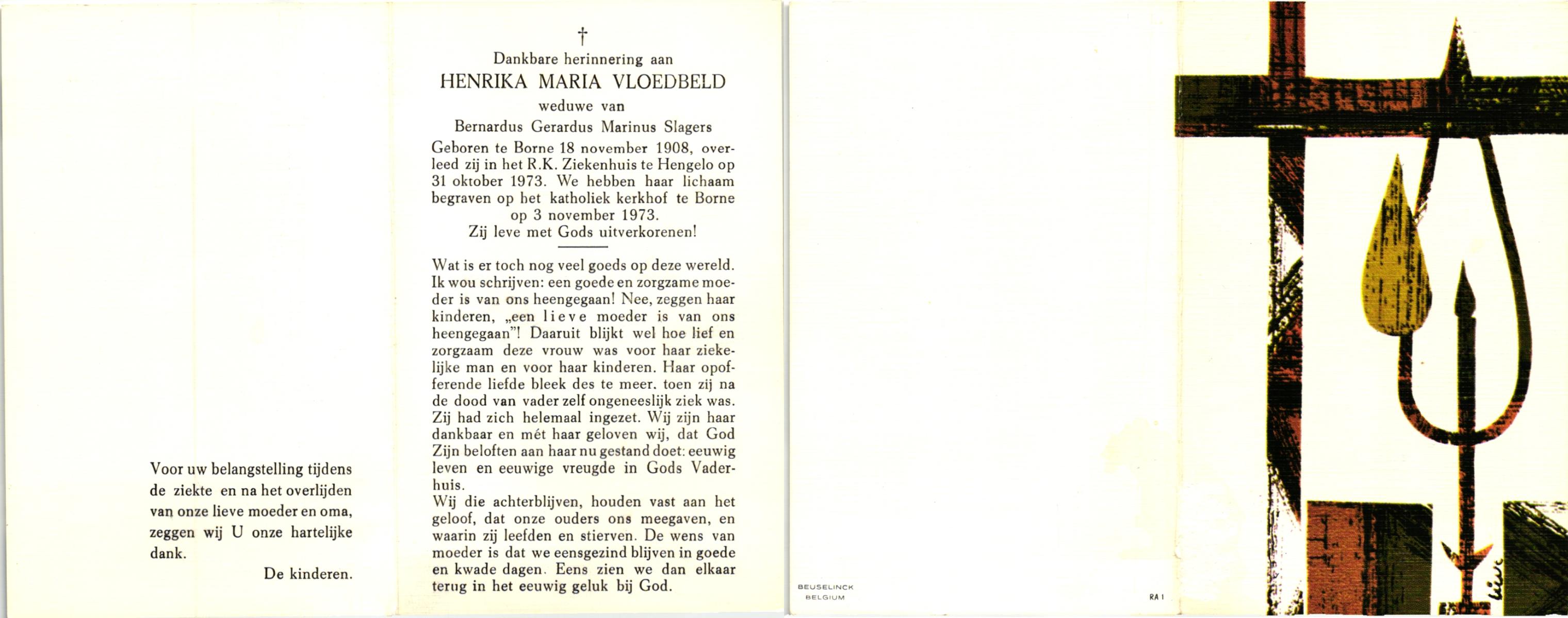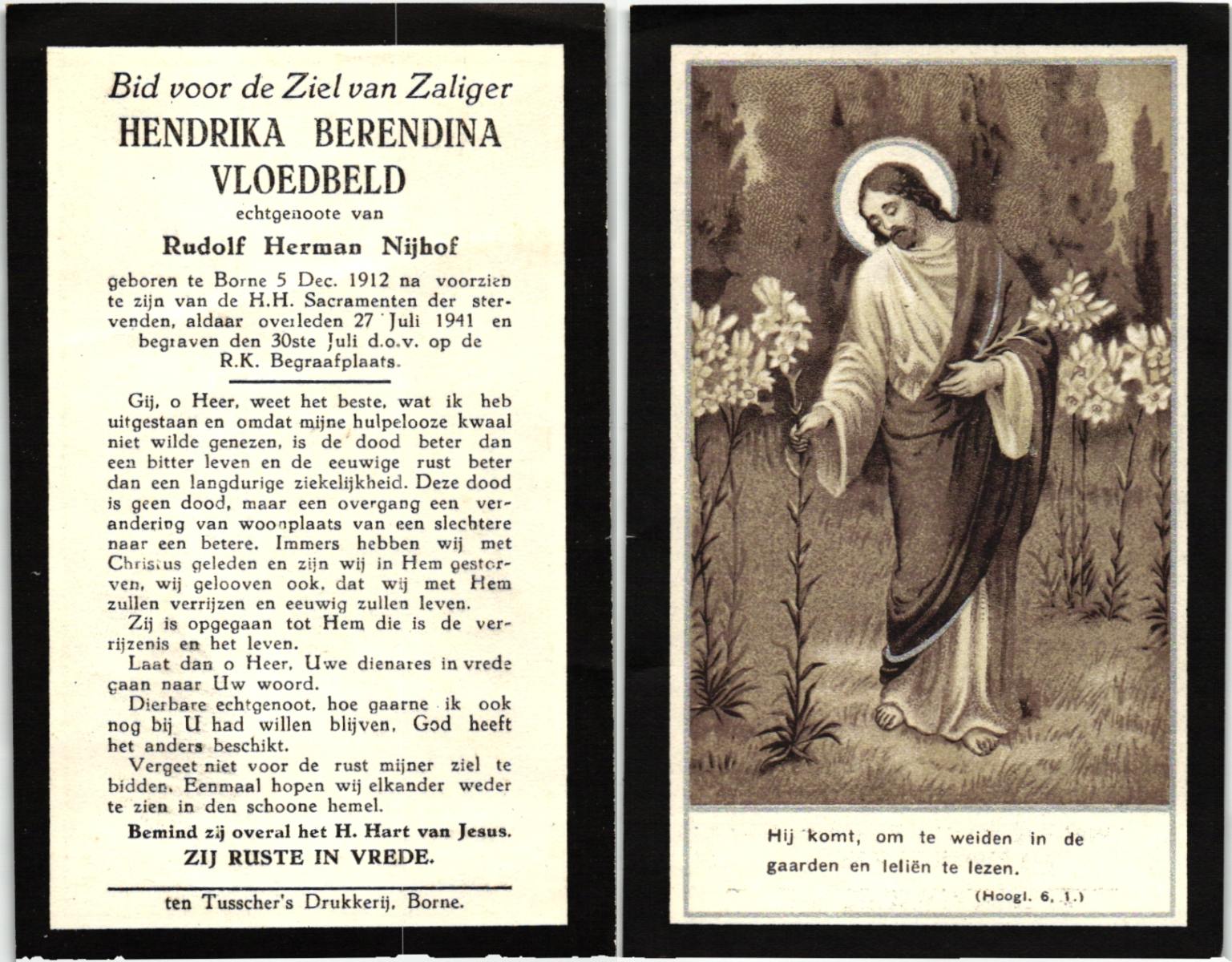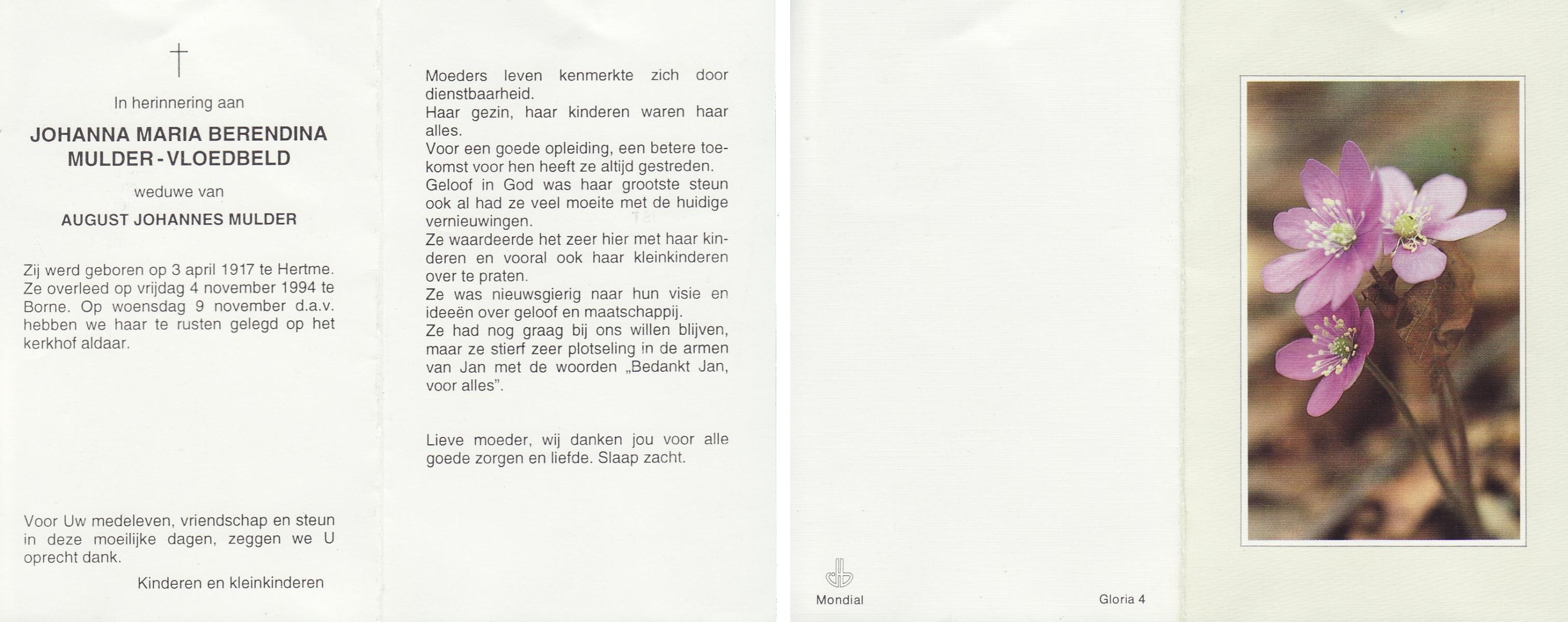 VLOEDBELD, Johanna Maria Berendina, geboren op 3-4-1917 te Hertme, overleden op 4-11-1994 te Borne op 77-jarige leeftijd, begraven op 9-11-1994 te Borne.