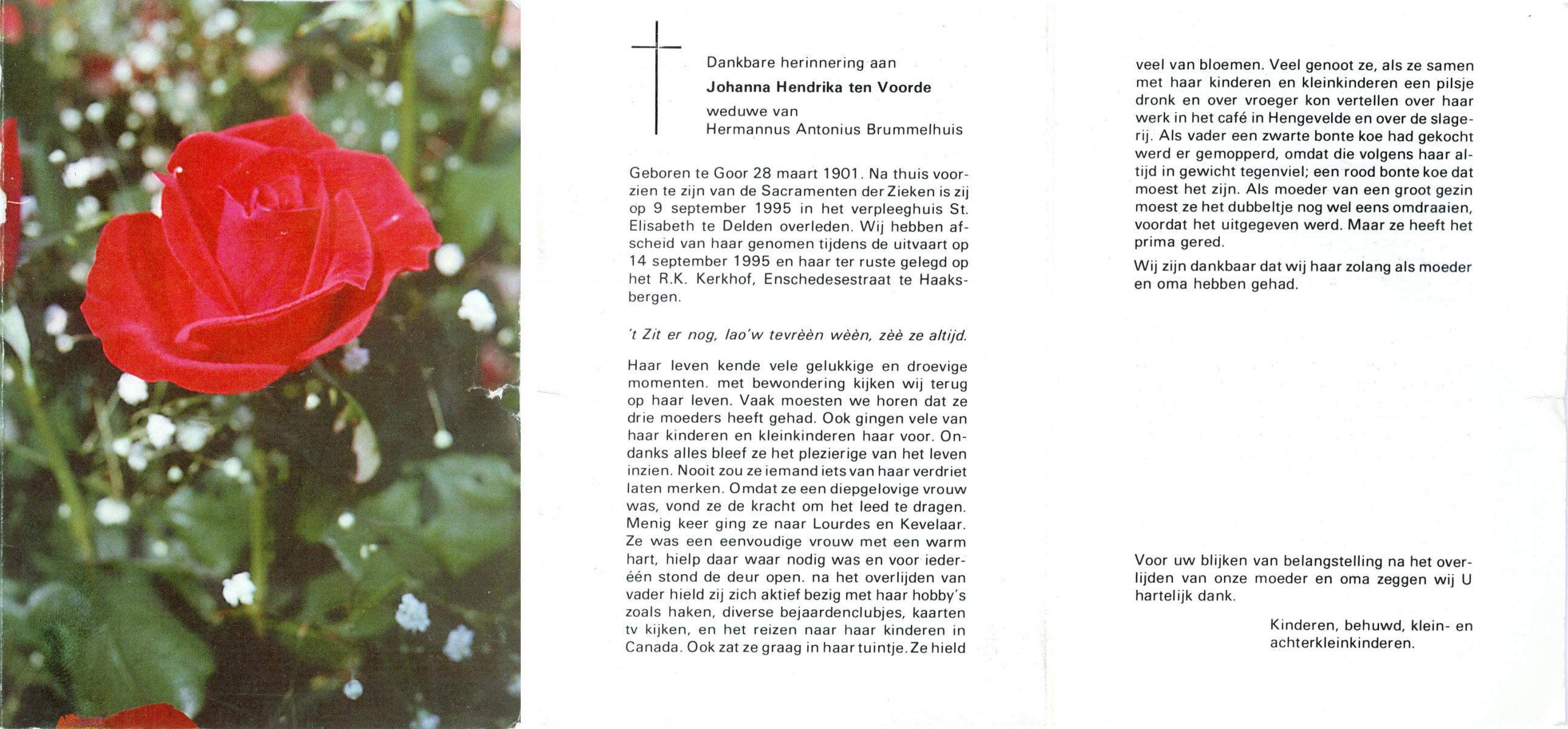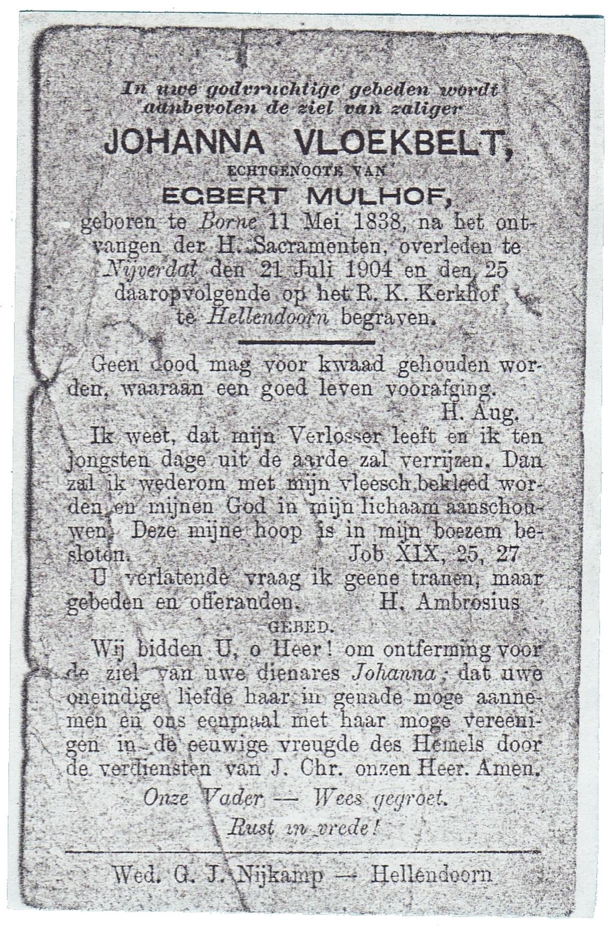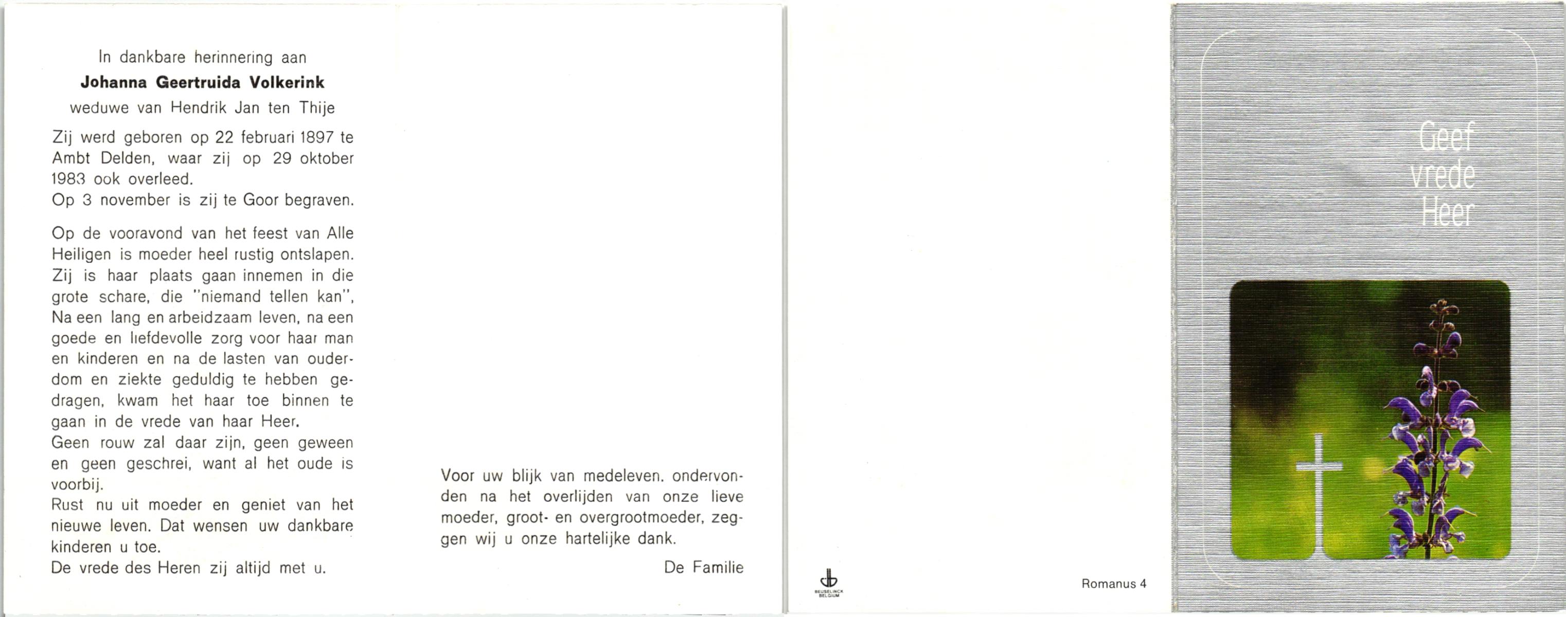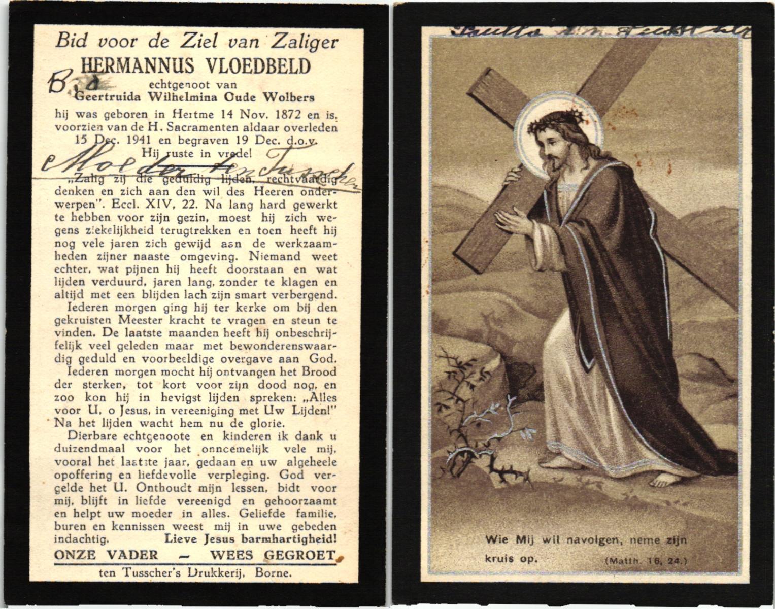 VLOEDBELD, Johanna Maria Berendina, geboren op 3-4-1917 te Hertme, overleden op 4-11-1994 te Borne op 77-jarige leeftijd, begraven op 9-11-1994 te Borne.