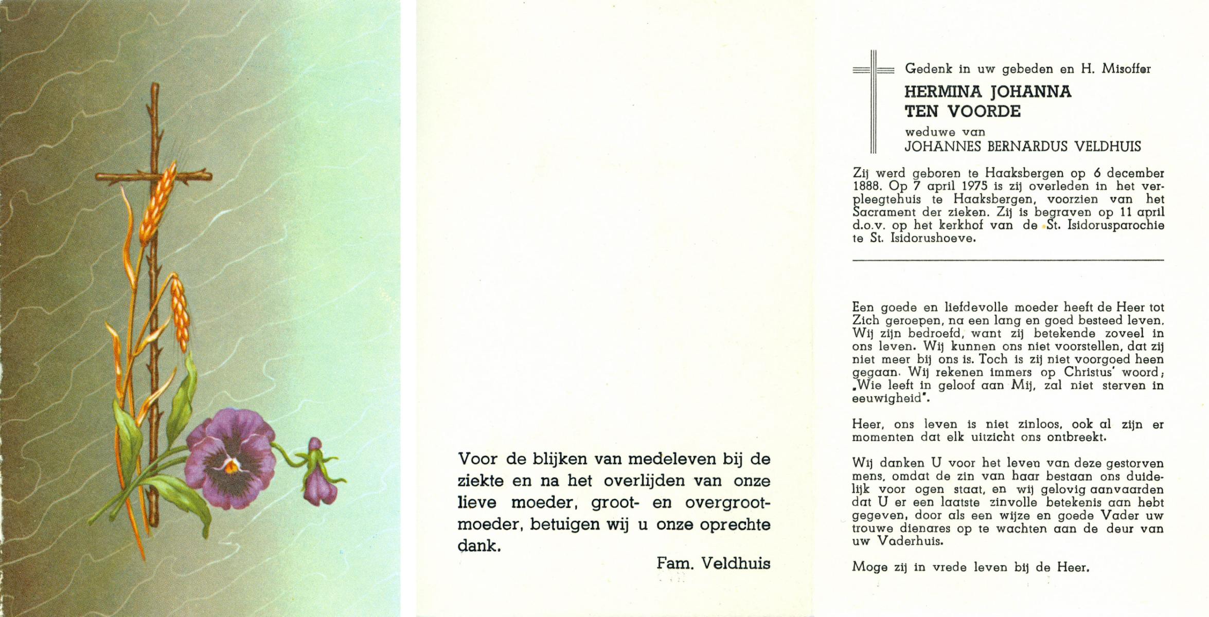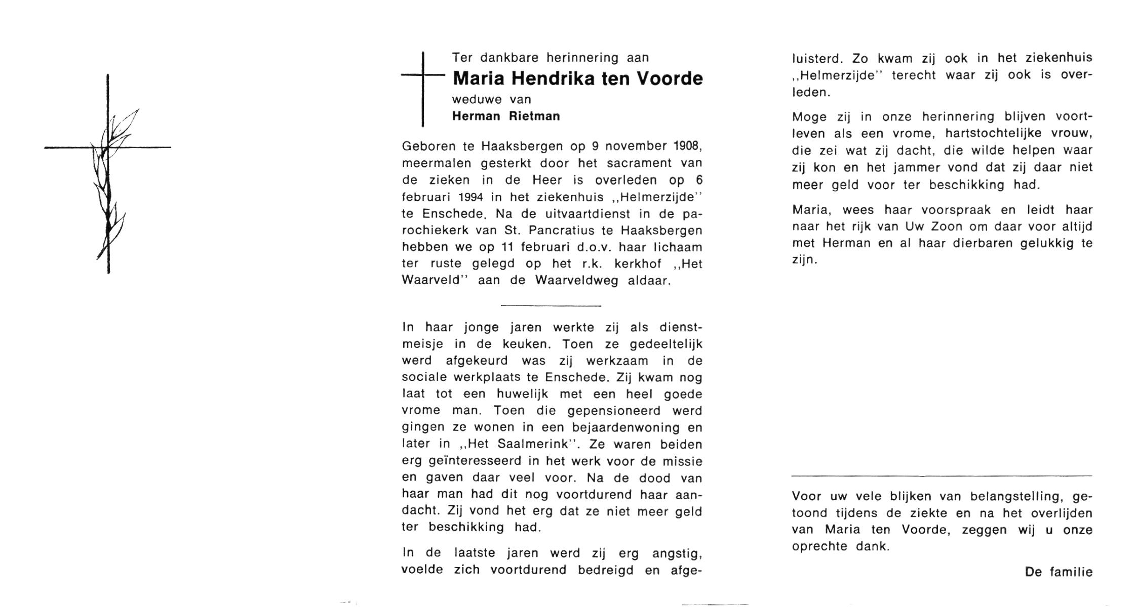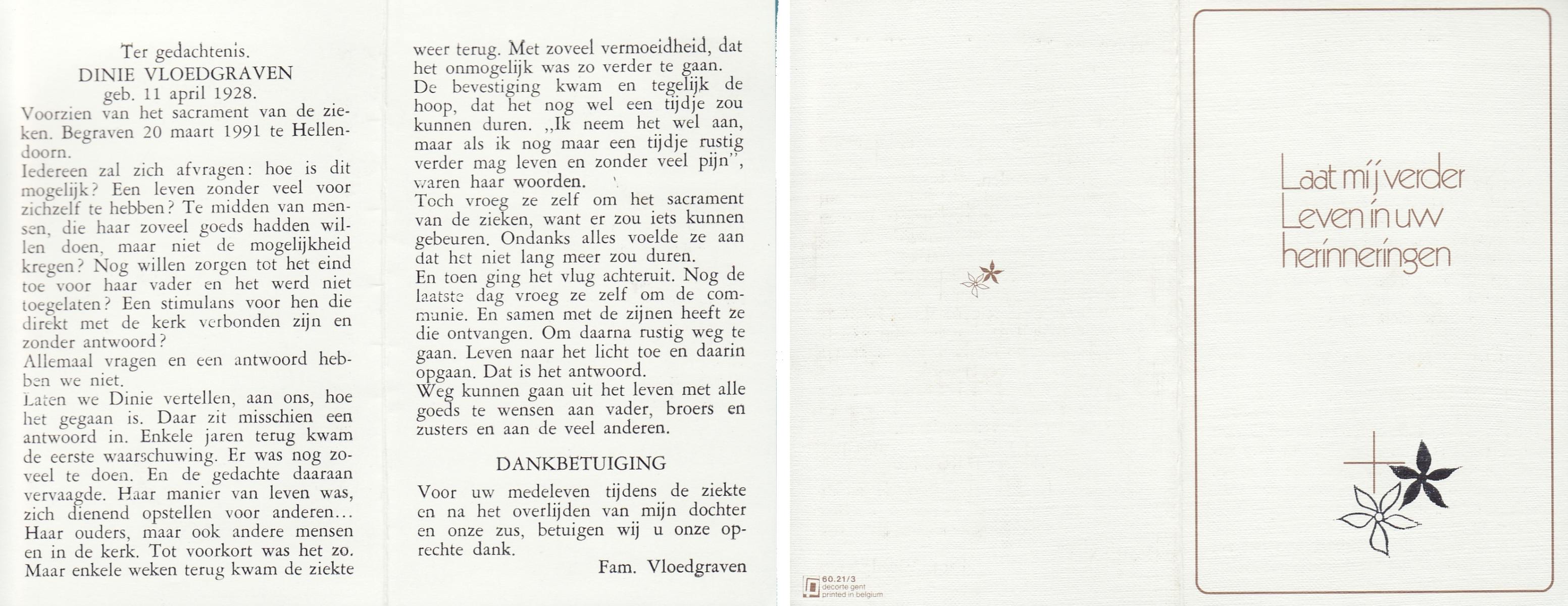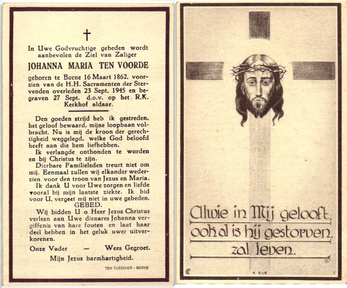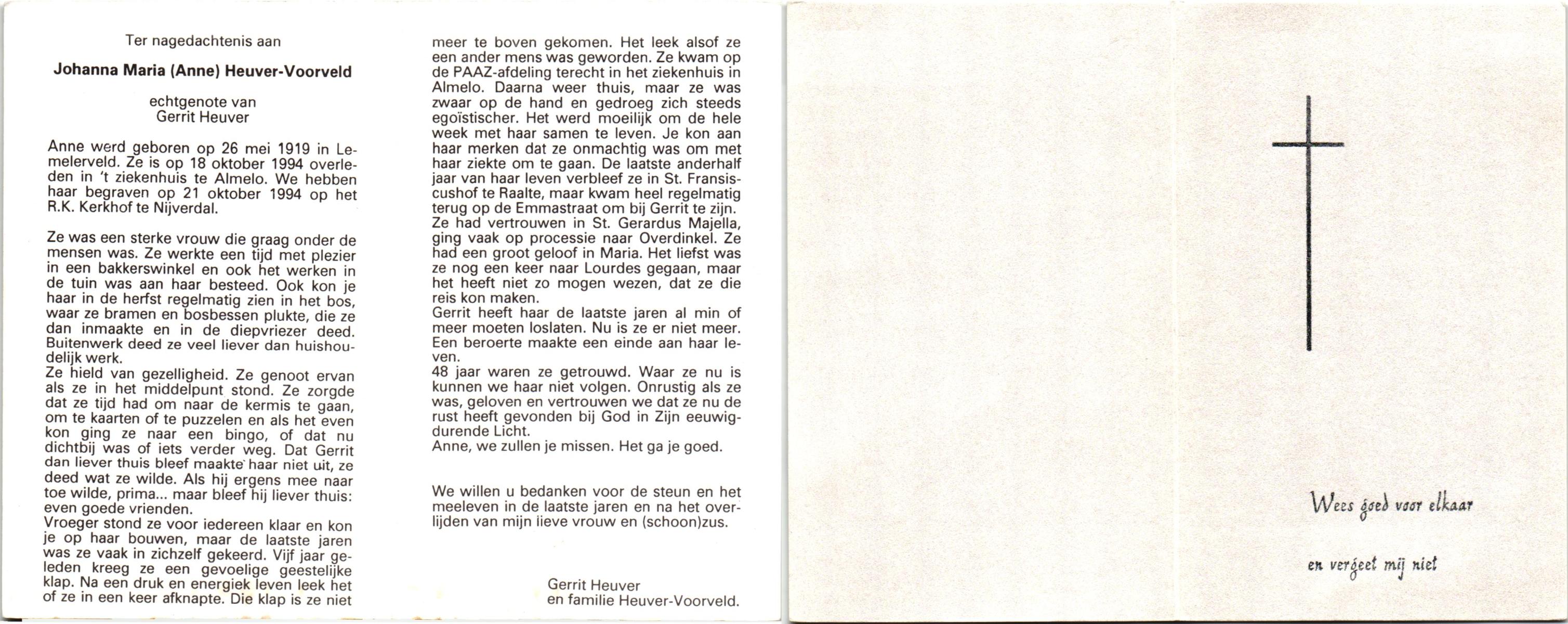 VLOEDBELD, Johanna Maria Berendina, geboren op 3-4-1917 te Hertme, overleden op 4-11-1994 te Borne op 77-jarige leeftijd, begraven op 9-11-1994 te Borne.