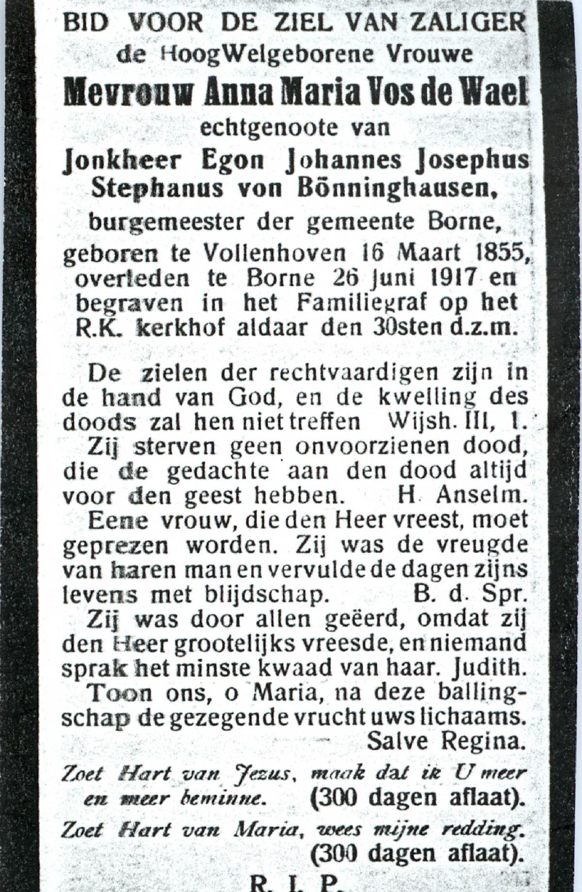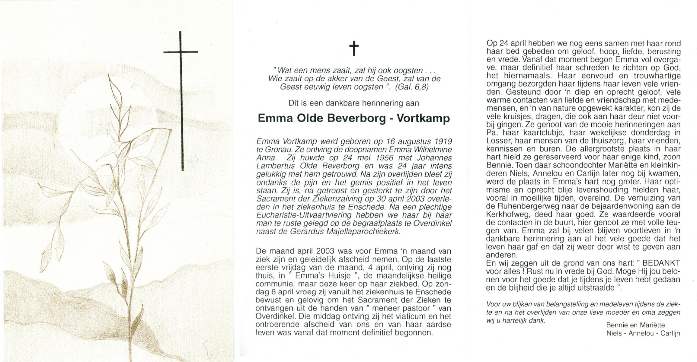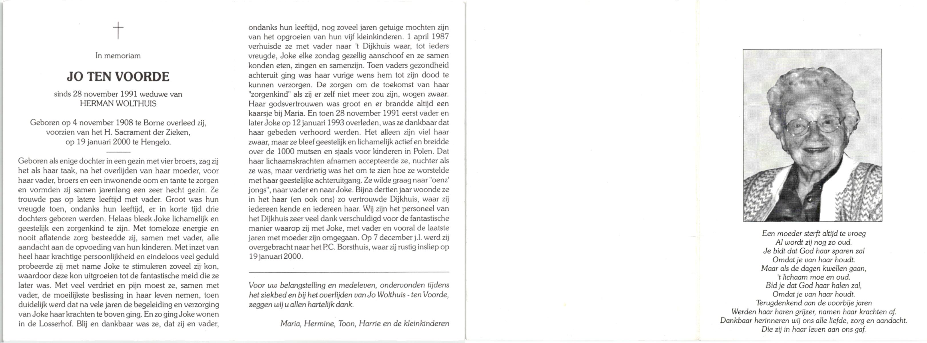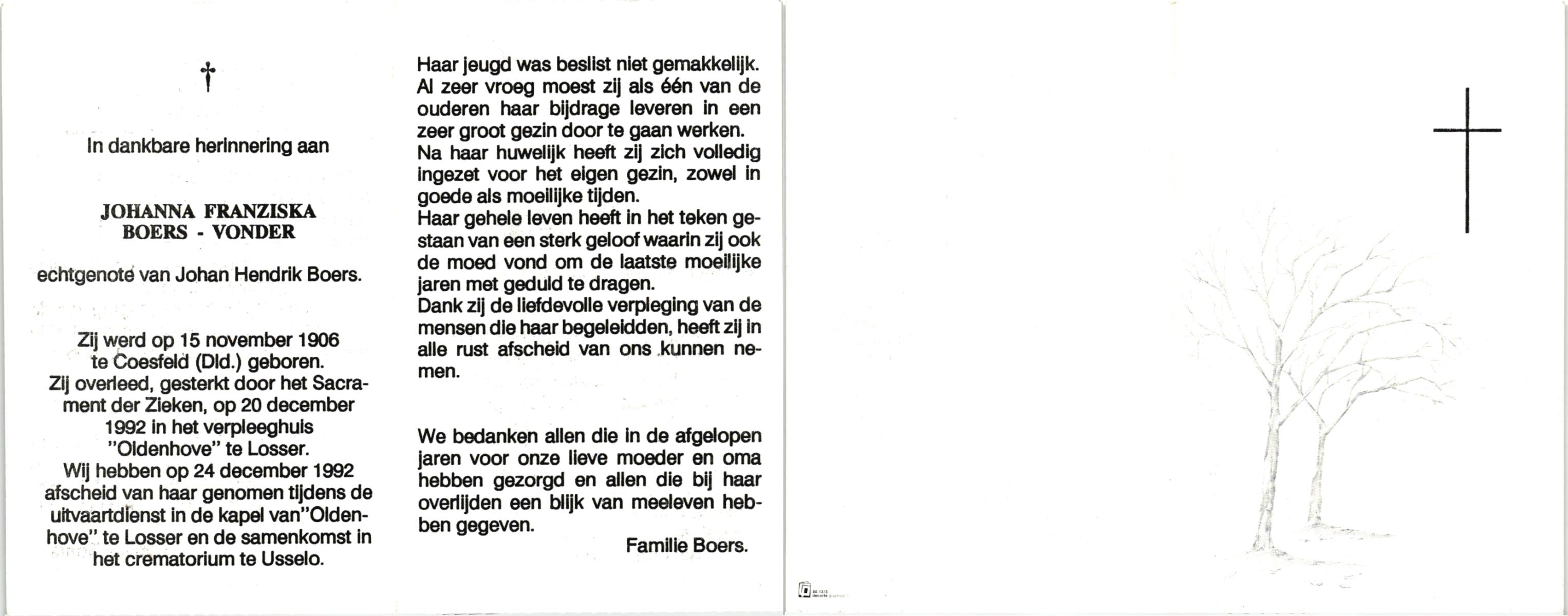 VLOEDBELD, Johanna Maria Berendina, geboren op 3-4-1917 te Hertme, overleden op 4-11-1994 te Borne op 77-jarige leeftijd, begraven op 9-11-1994 te Borne.