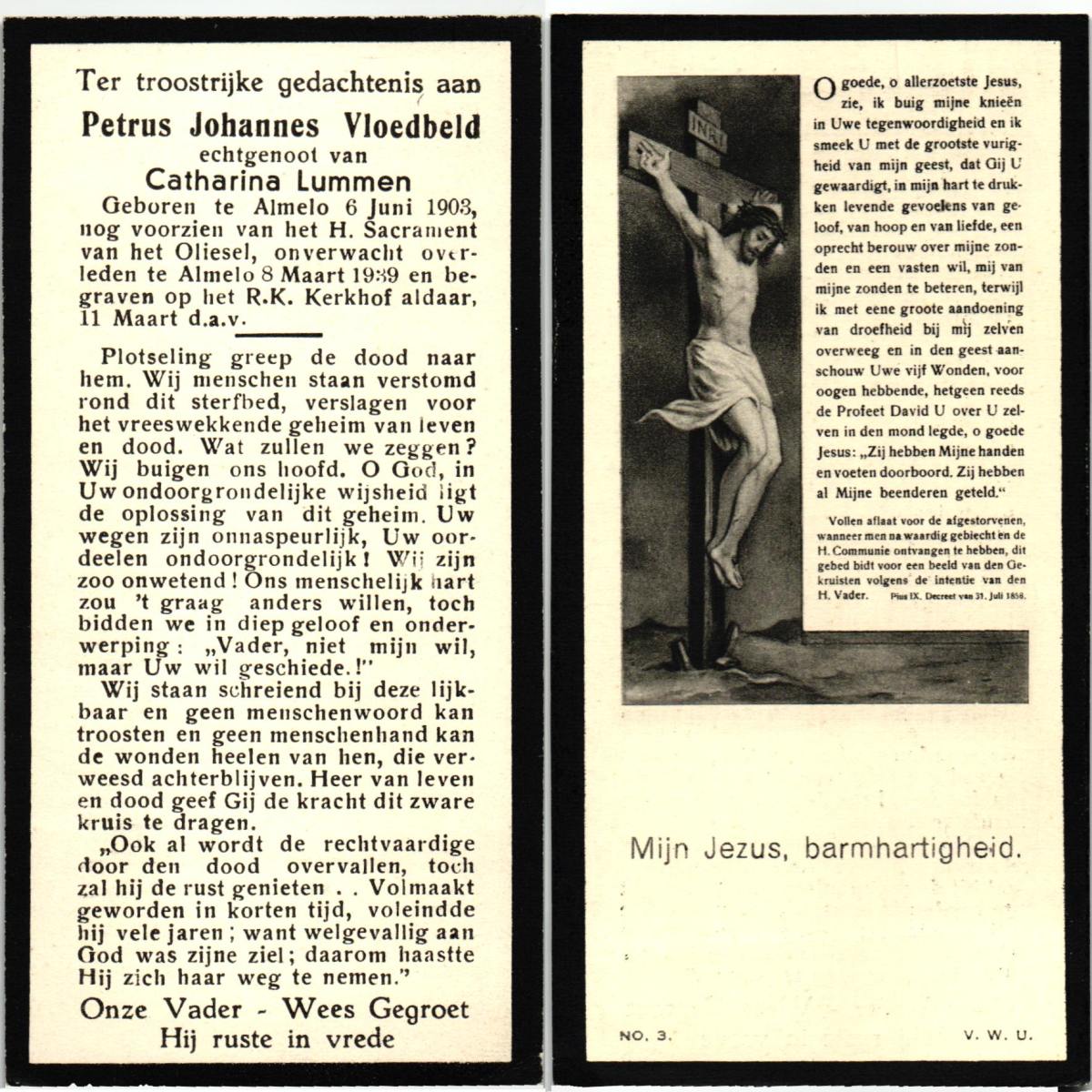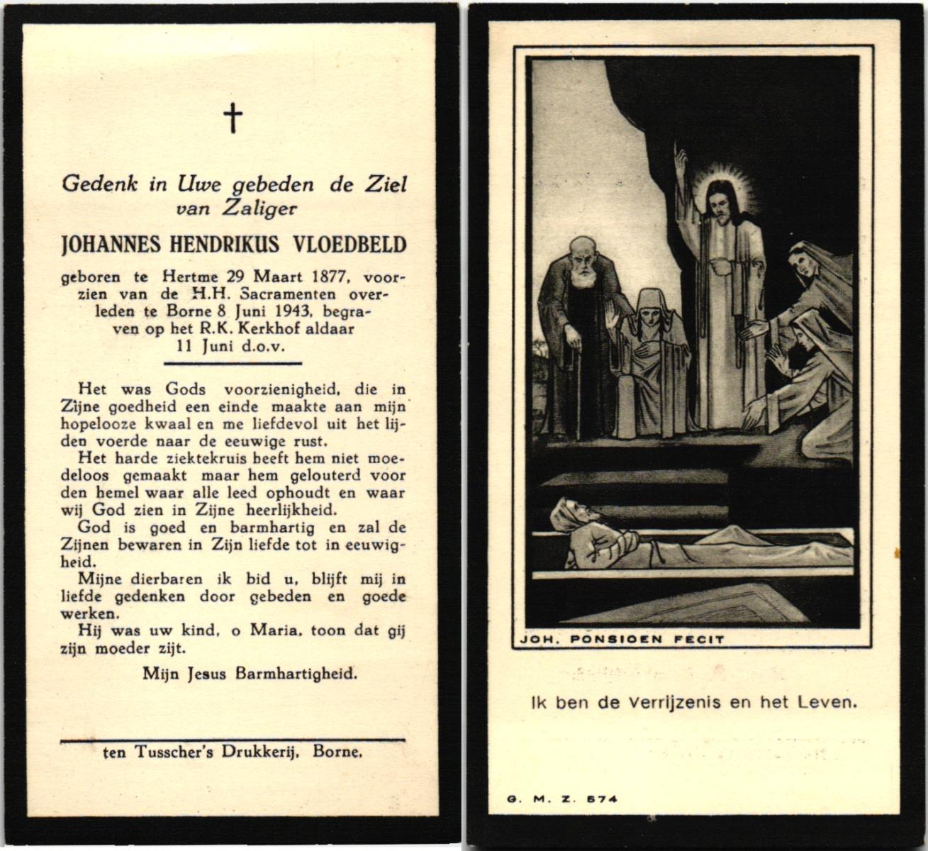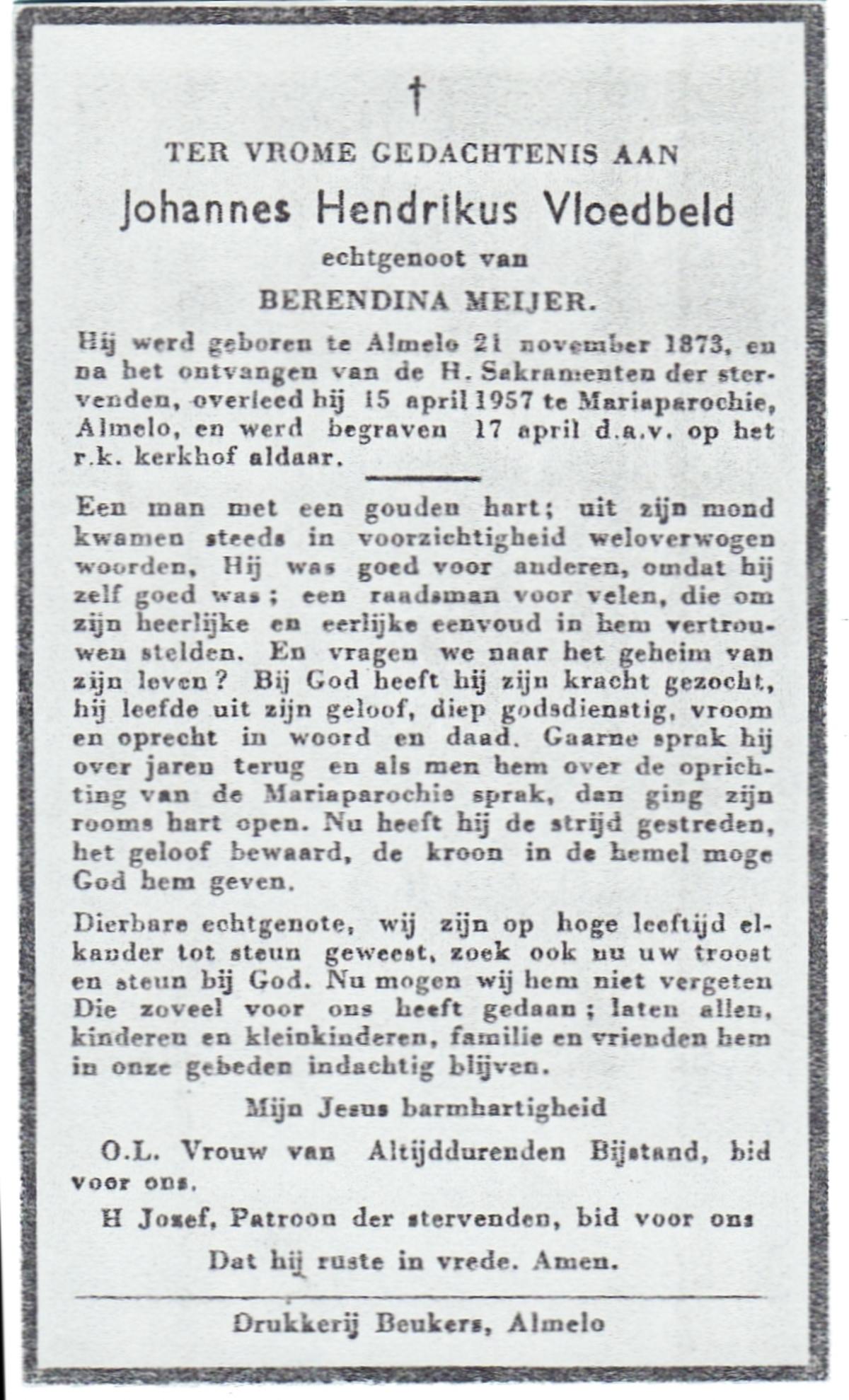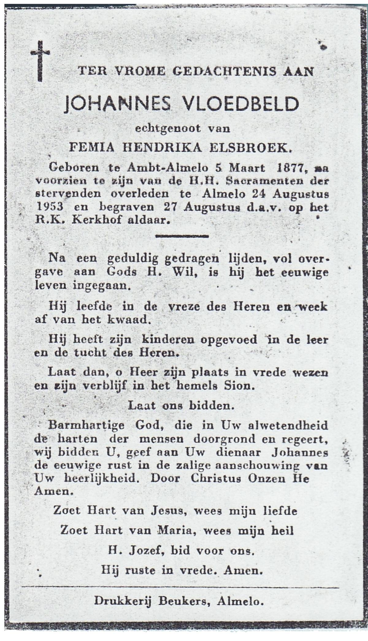 VLOEDBELD, Johannes, geboren op 05-03-1877 te Almelo, Ambt, overleden op 24-8-1953 te Almelo op 76-jarige leeftijd, begraven op 27-8-1953 te Almelo.