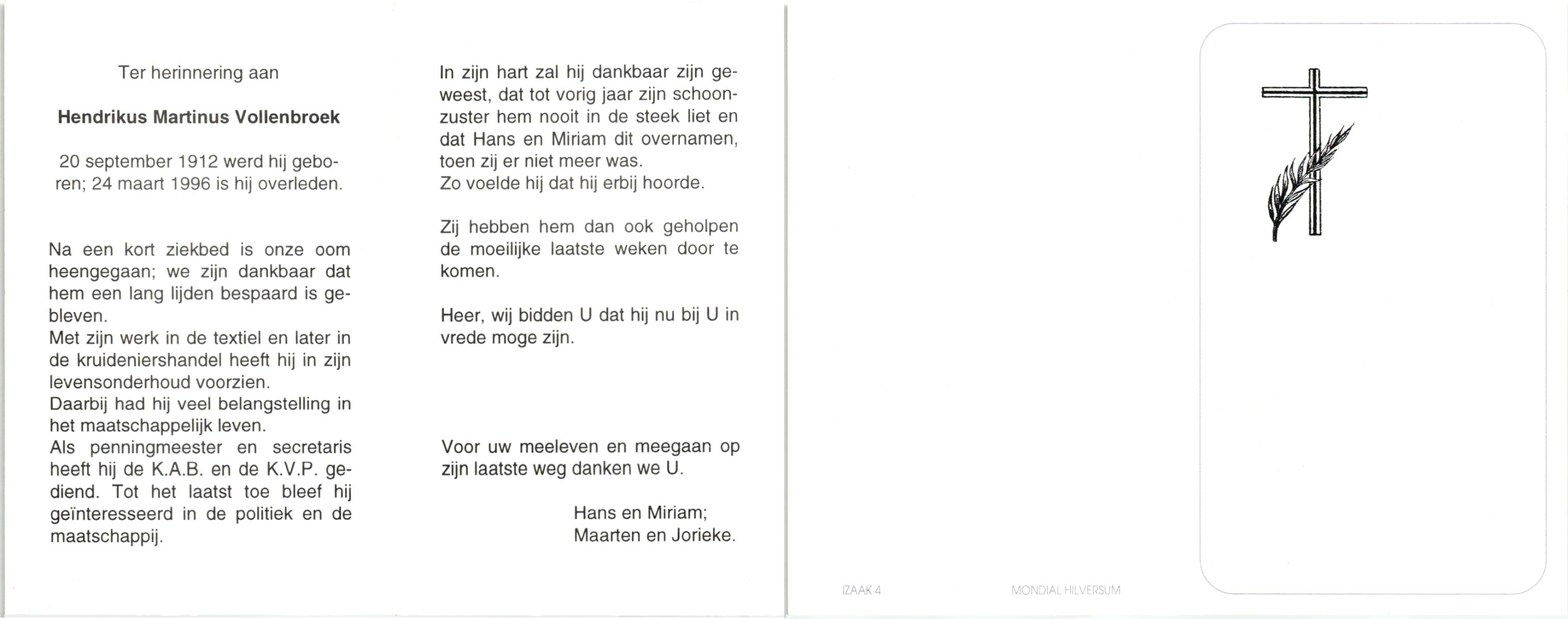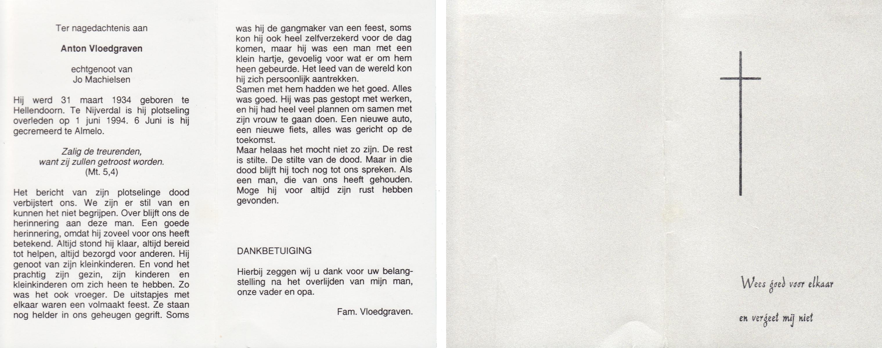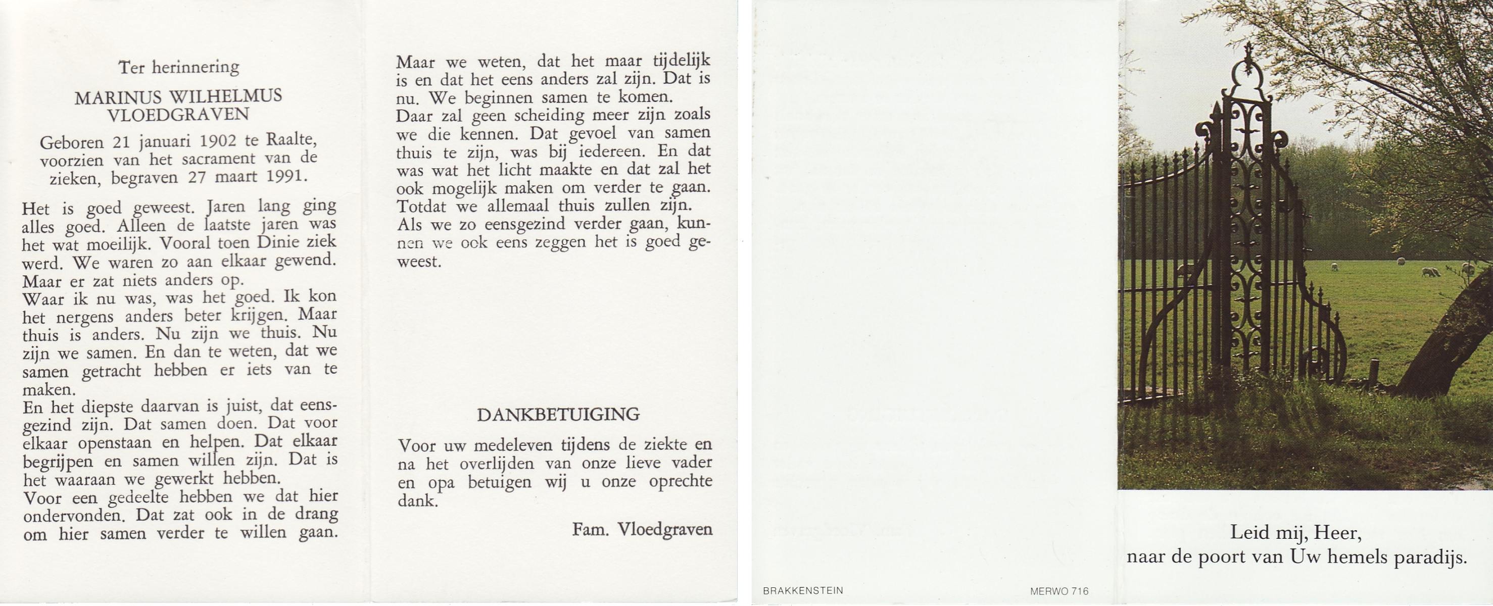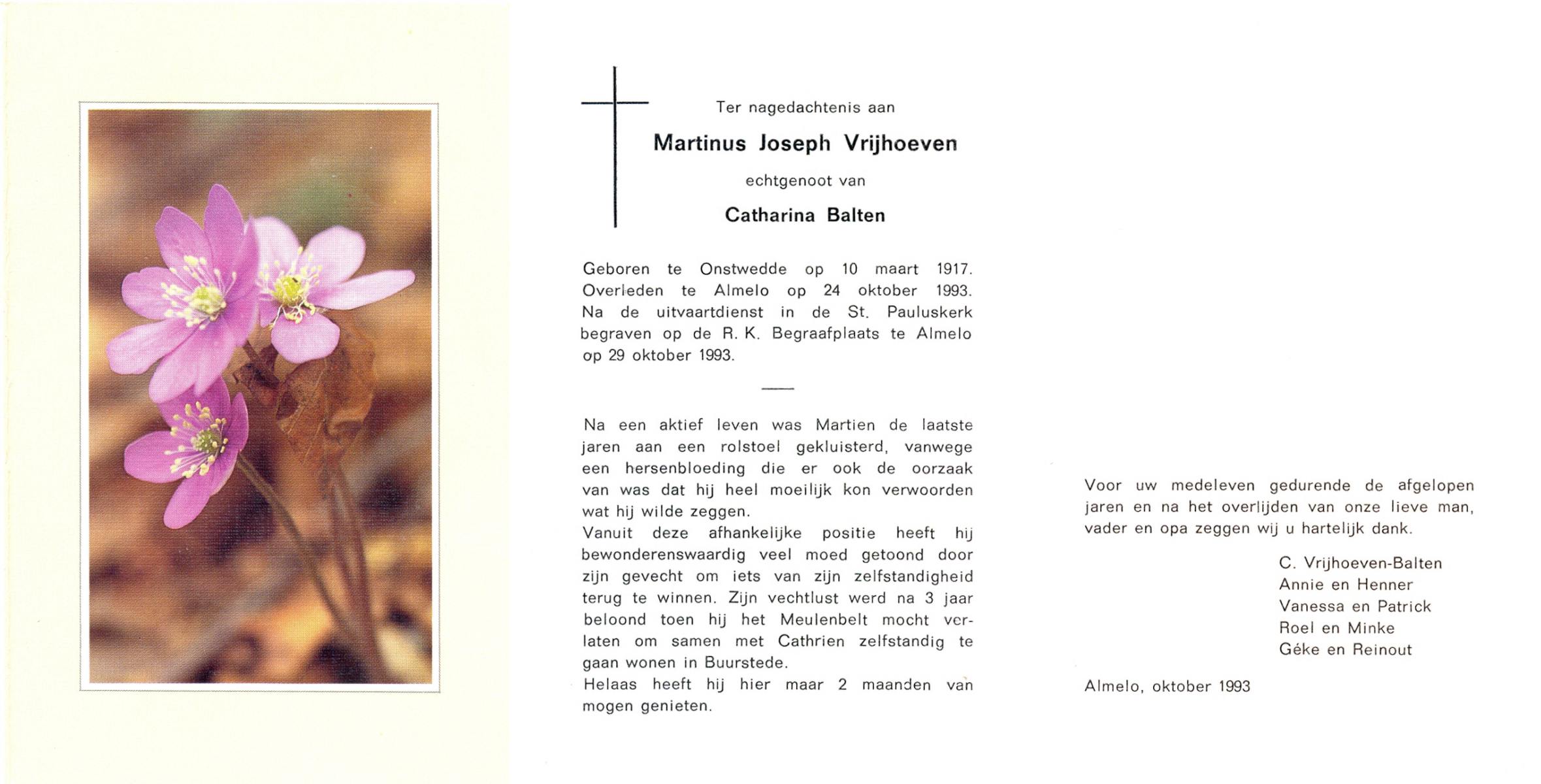 VRIJHOEVEN, Martinus Joseph, geboren op 10-3-1917 te Onstwedde, overleden op 24-10-1993 te Almelo op 76-jarige leeftijd, begraven op 29-10-1993 te Almelo.