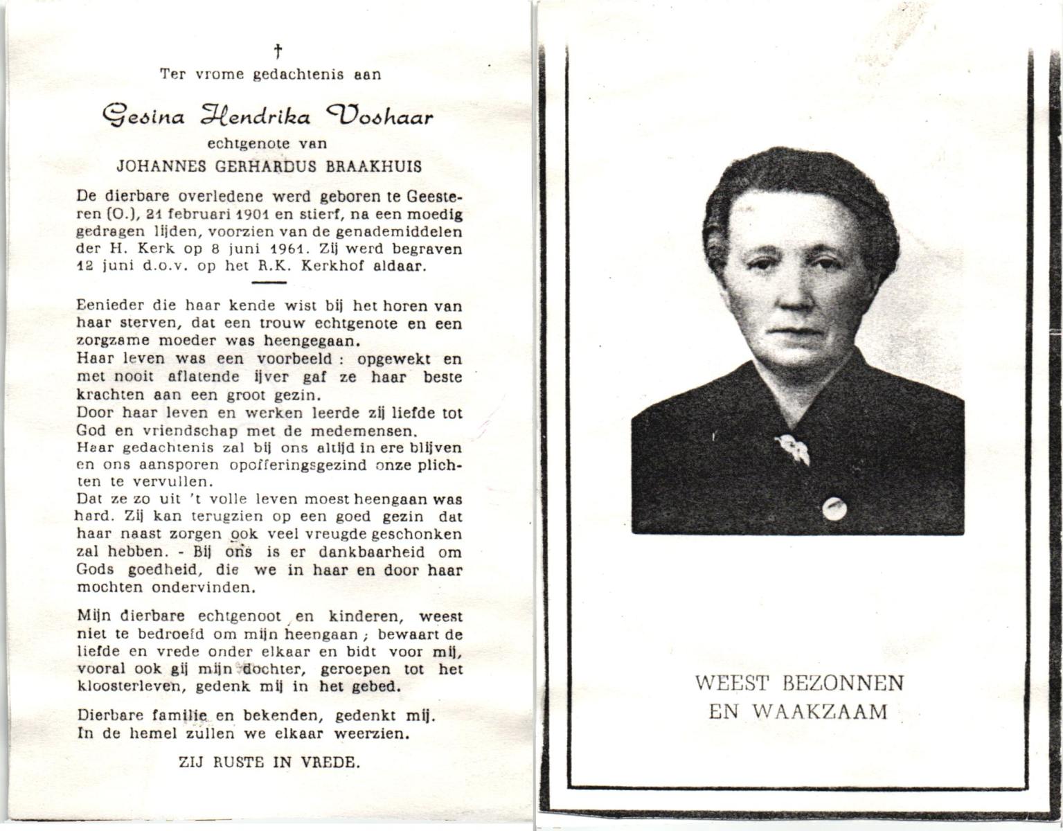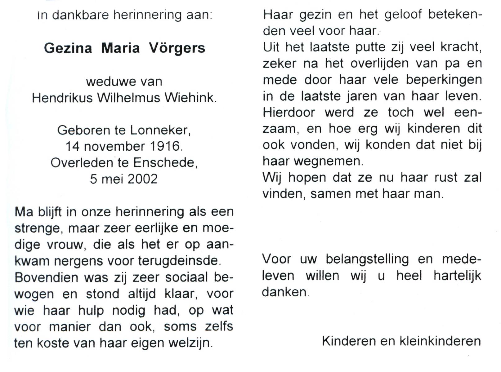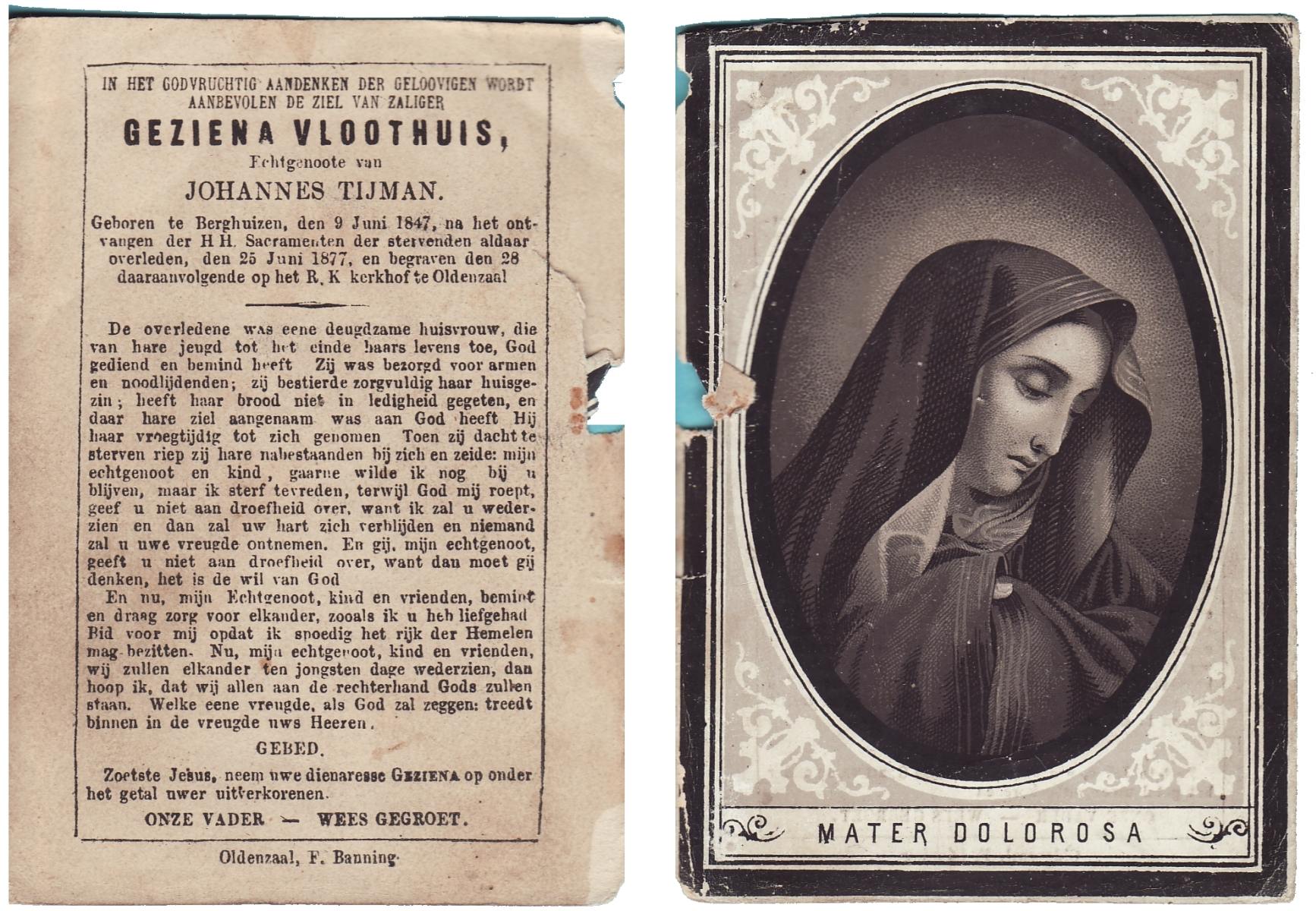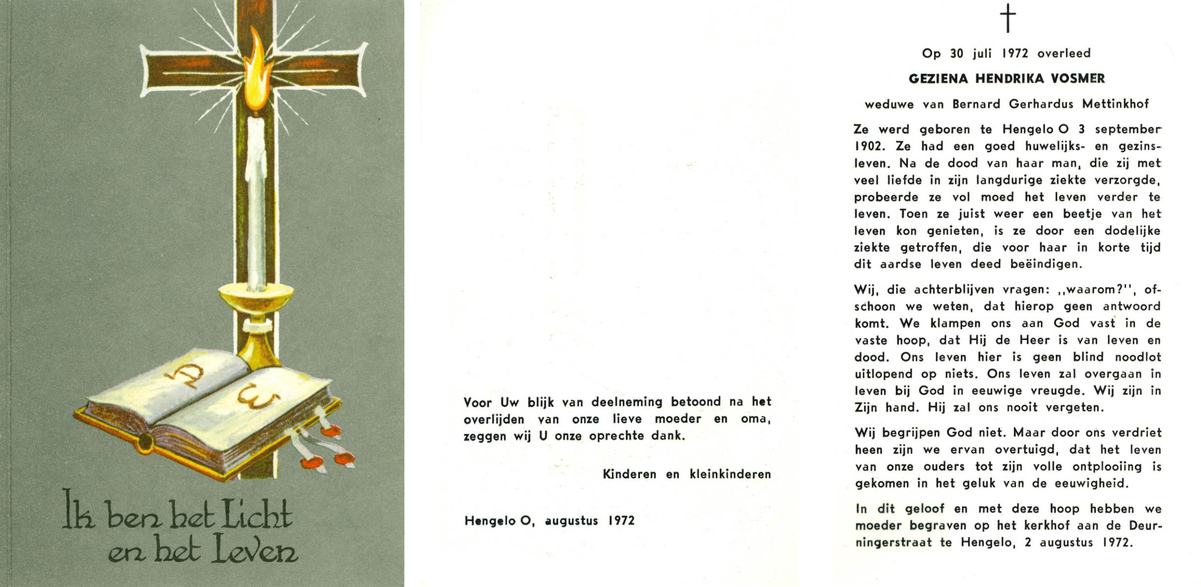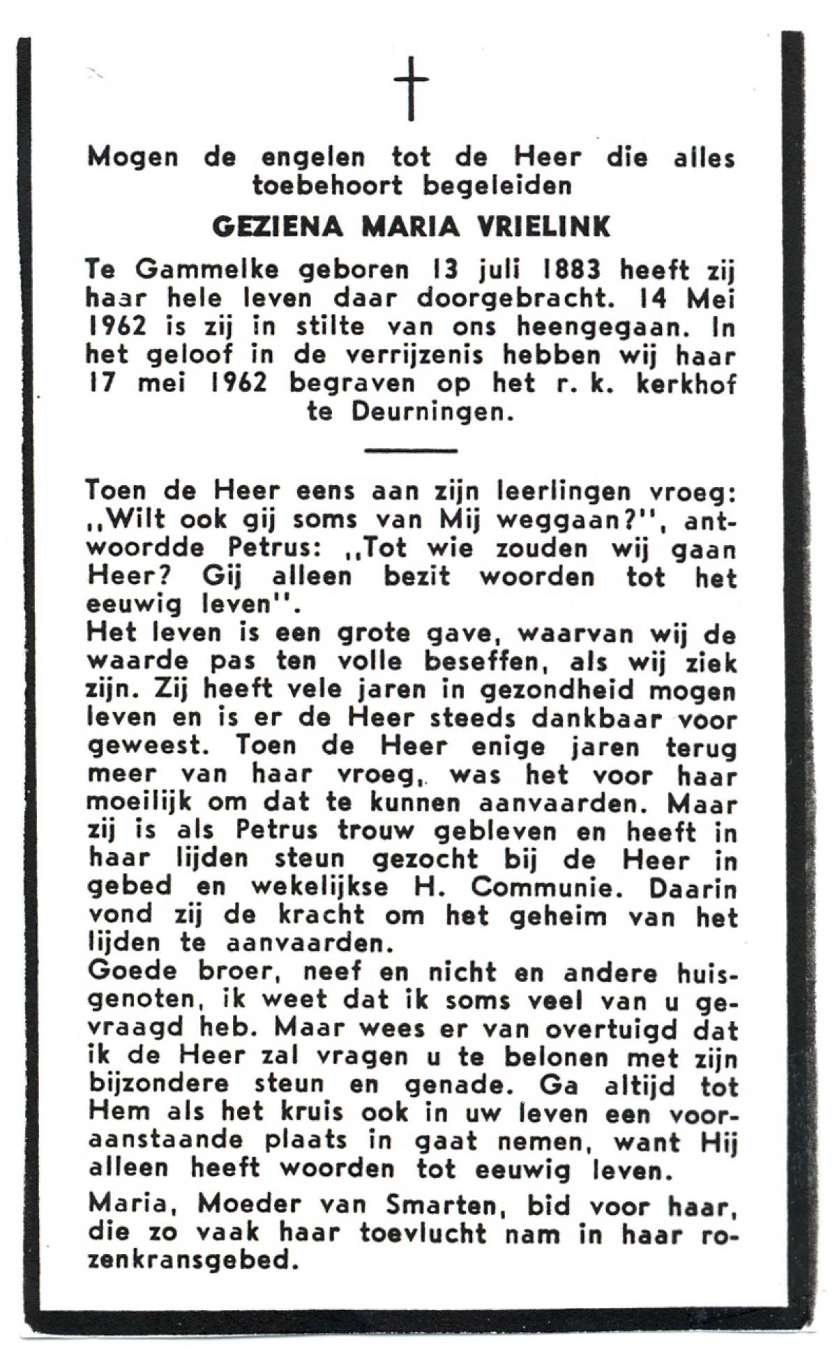 VRIELINK, Geziena Maria, geboren op 13-07-1883 te Gammelke, overleden op 14-5-1962 op 78-jarige leeftijd, begraven op 17-5-1962 te Deurningen.