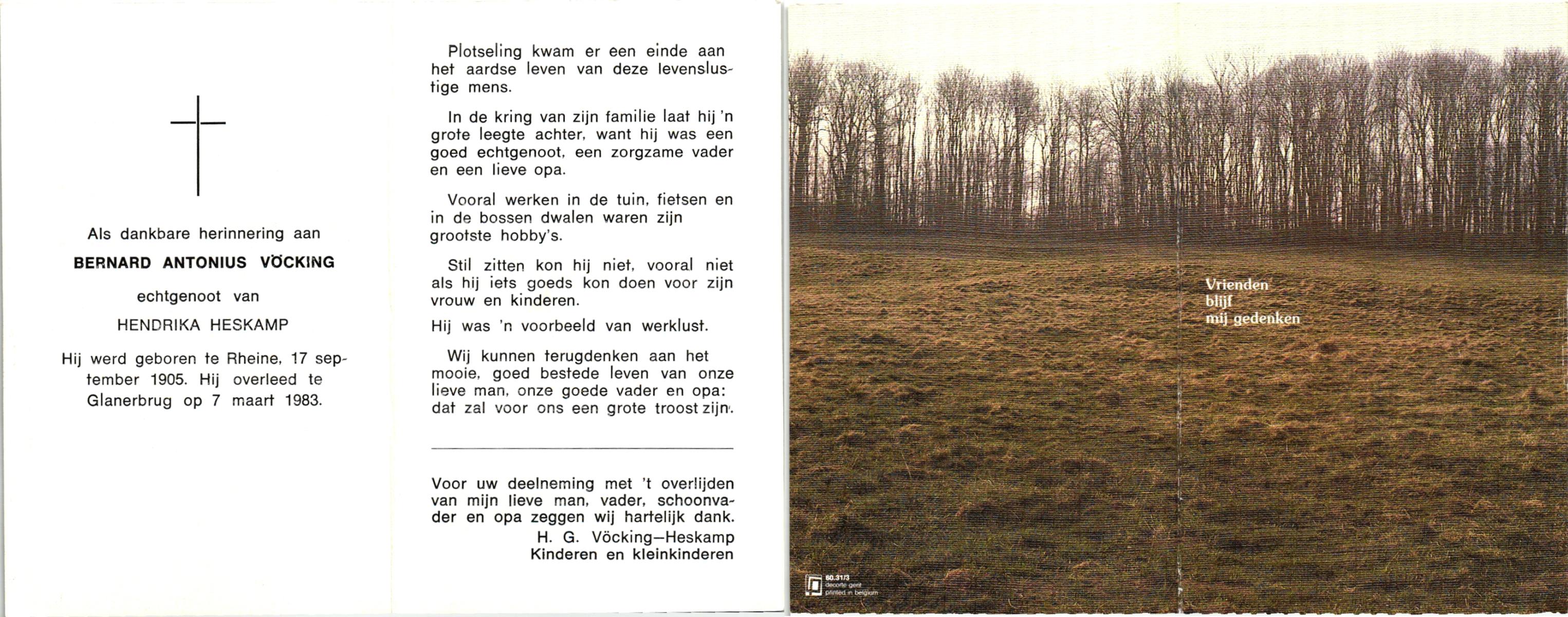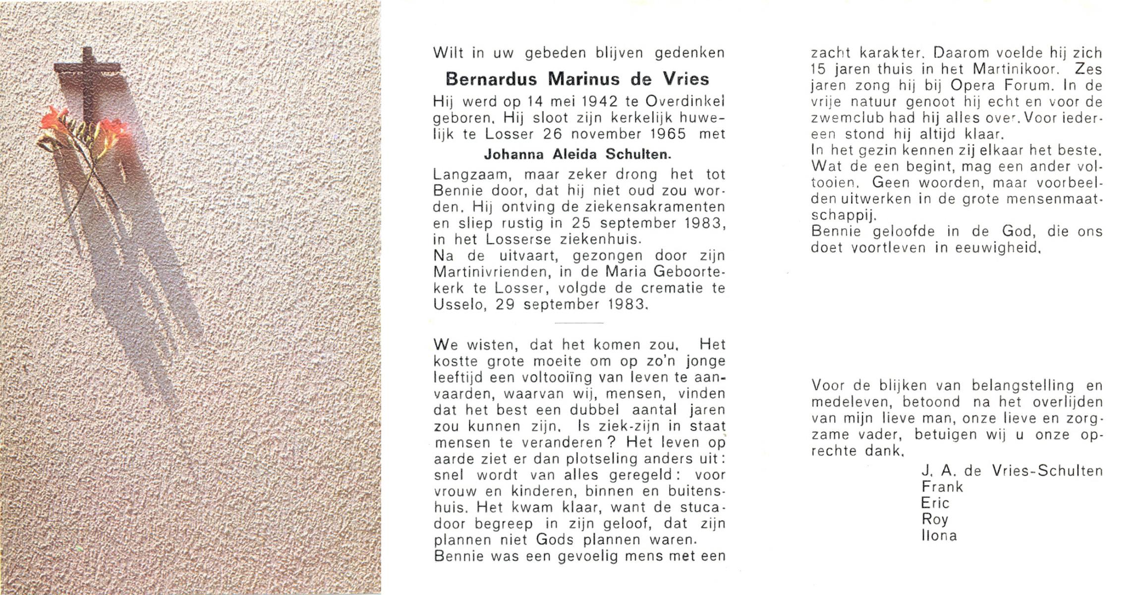 VRIES, de, Bernardus Marinus, geboren op 14-5-1942 te Overdinkel, overleden op 25-9-1983 te Losser op 41-jarige leeftijd, gecremeerd op 29-9-1983 te Usselo.