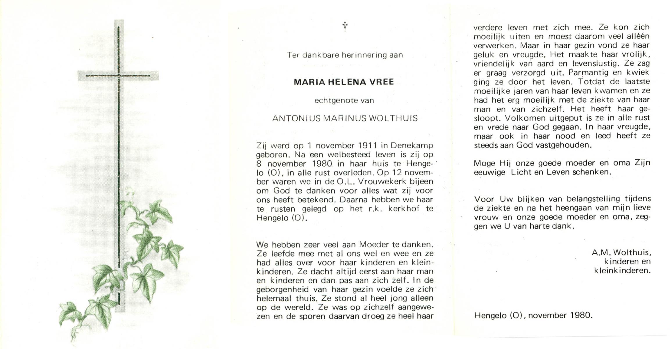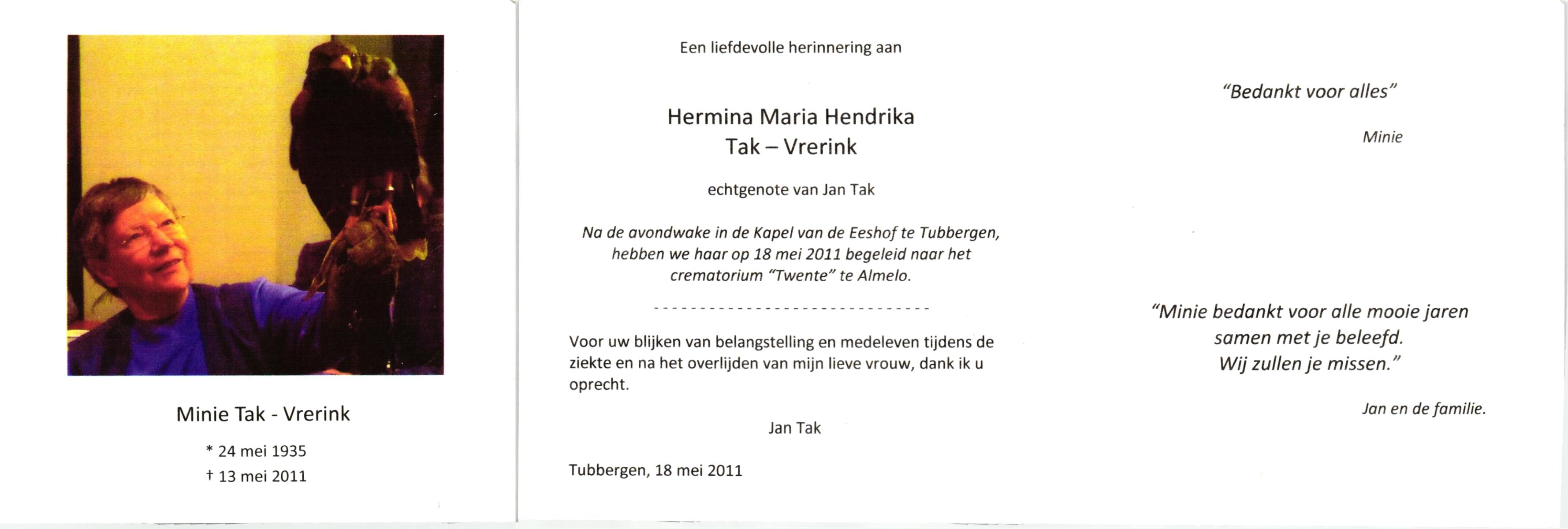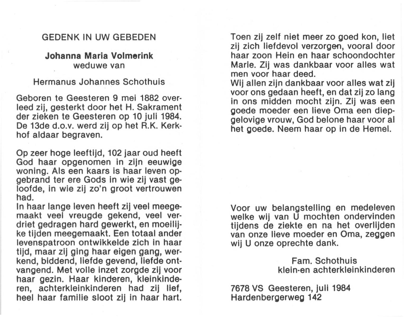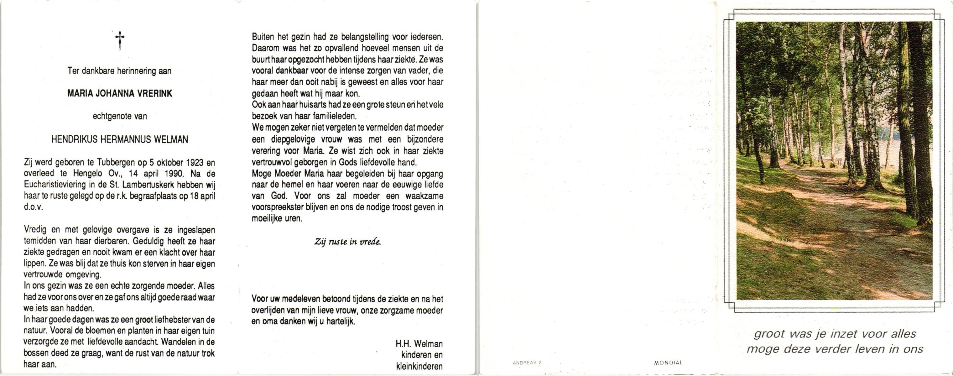 VRERINK, Maria Johanna, geboren op 5-10-1923 te Tubbergen, overleden op 14-4-1990 te Hengelo op 66-jarige leeftijd, begraven op 18-4-1990 te Hengelo.