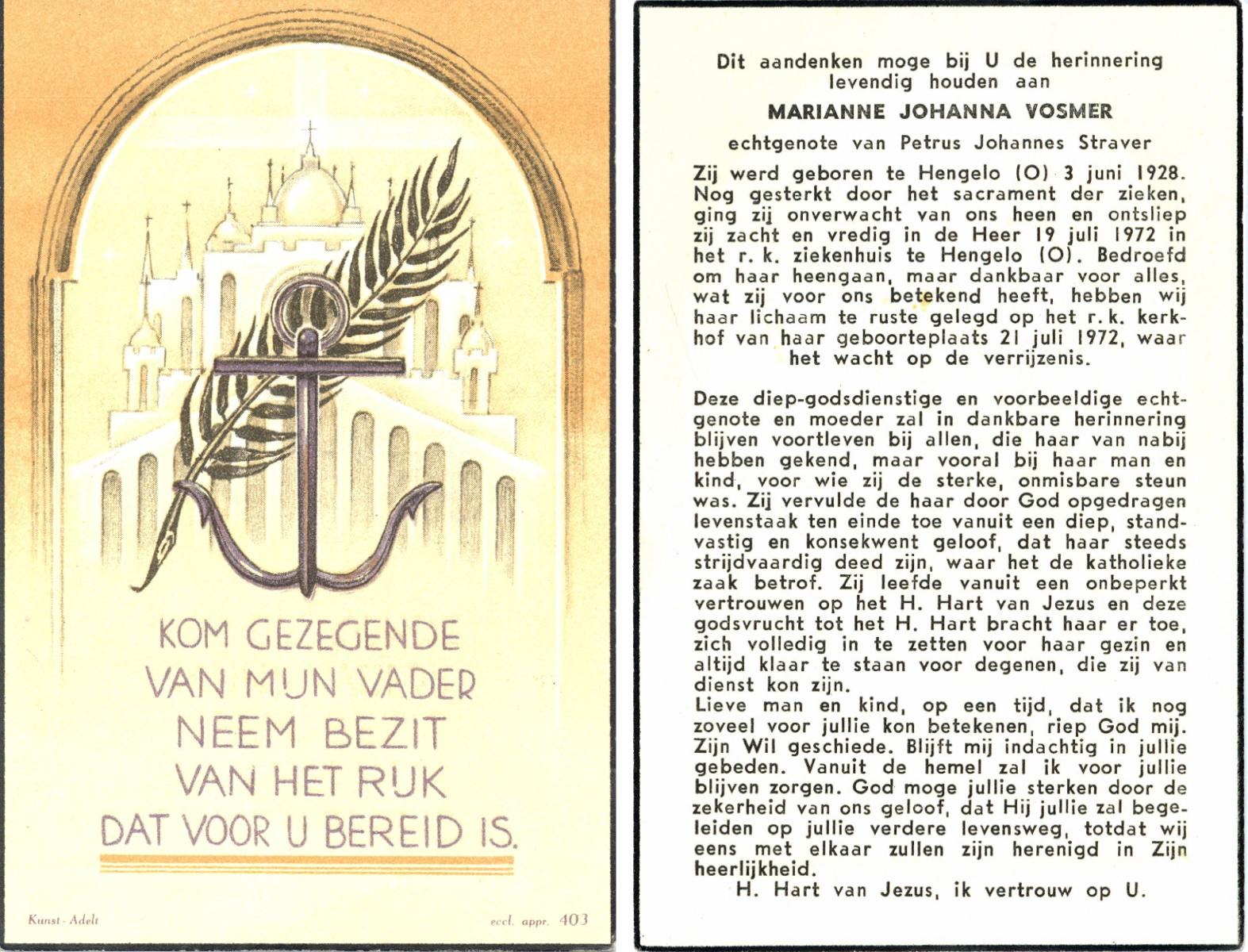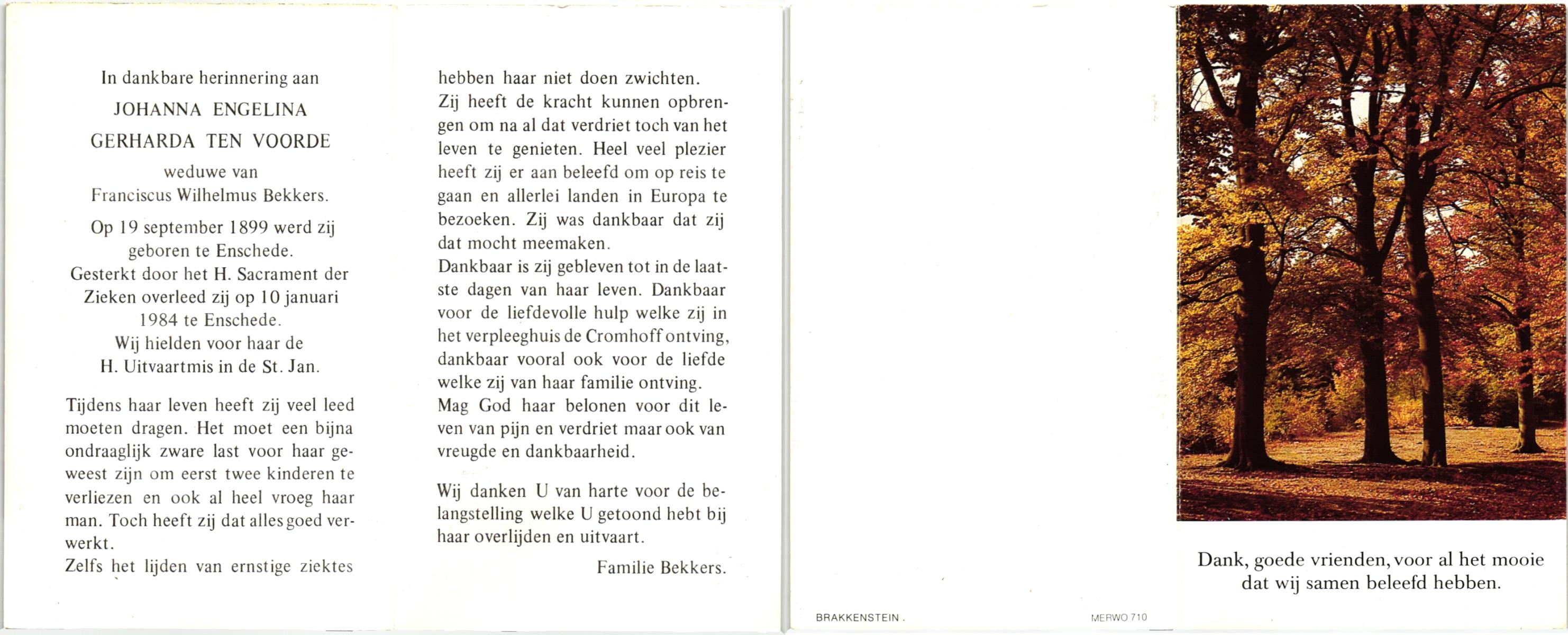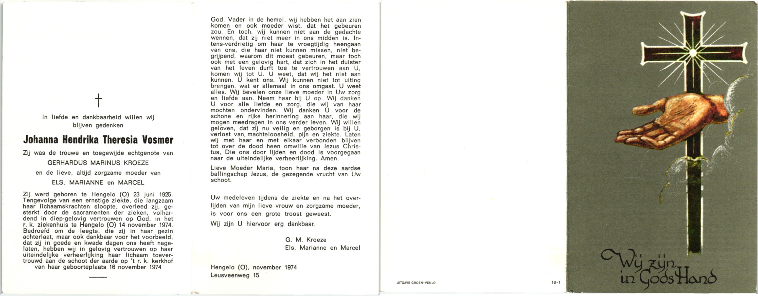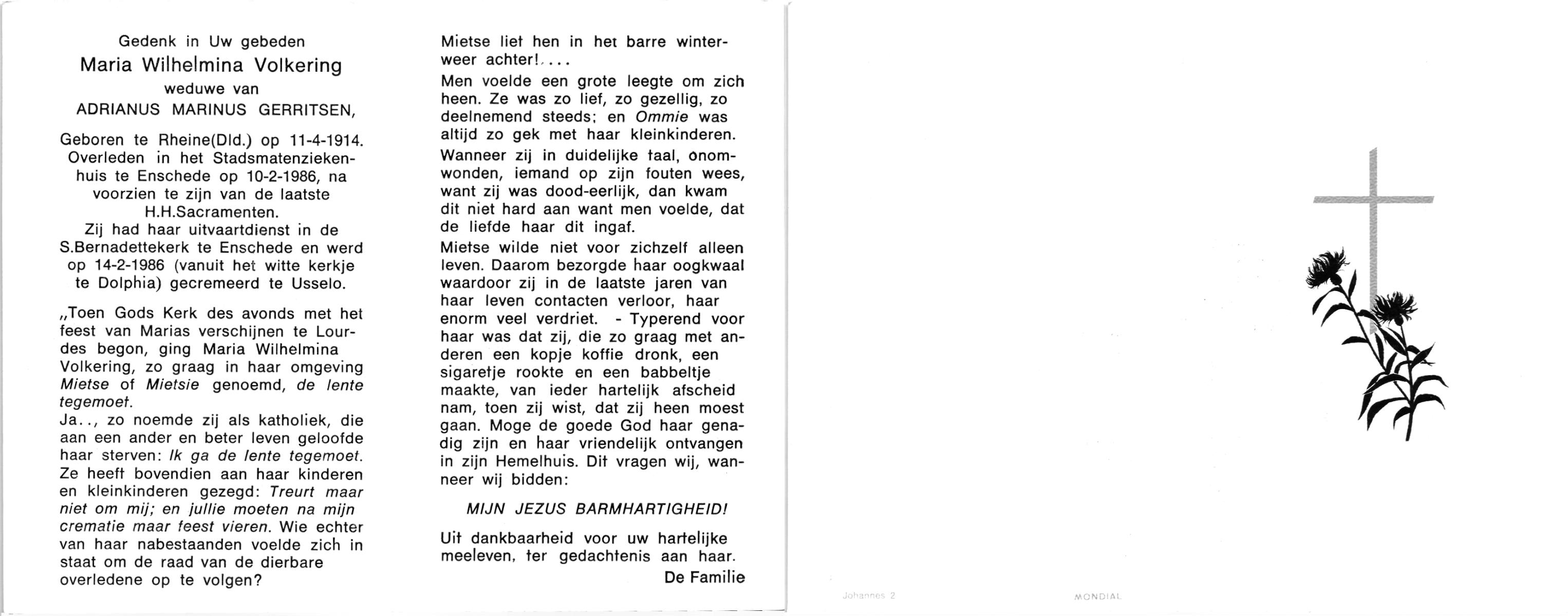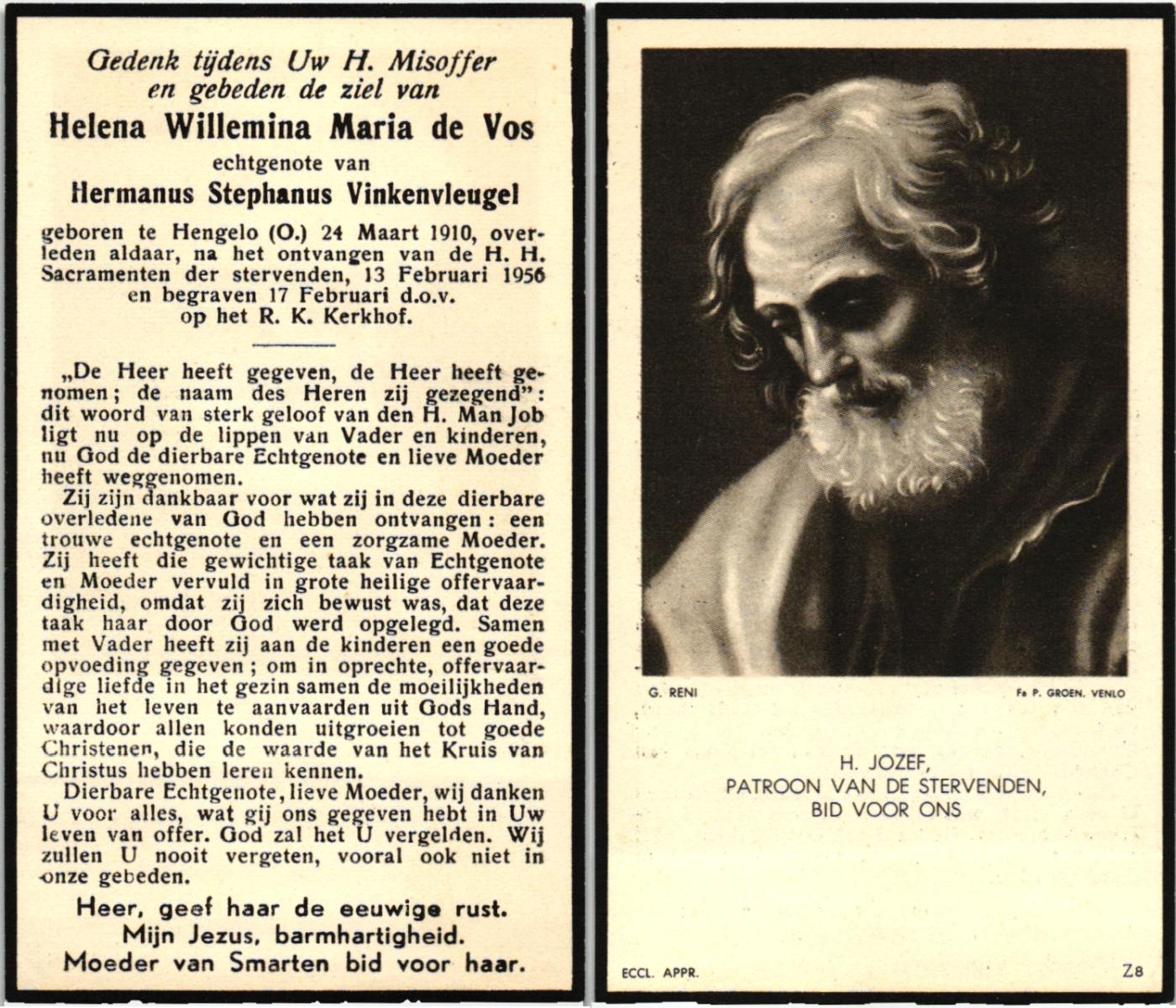 VRERINK, Maria Johanna, geboren op 5-10-1923 te Tubbergen, overleden op 14-4-1990 te Hengelo op 66-jarige leeftijd, begraven op 18-4-1990 te Hengelo.