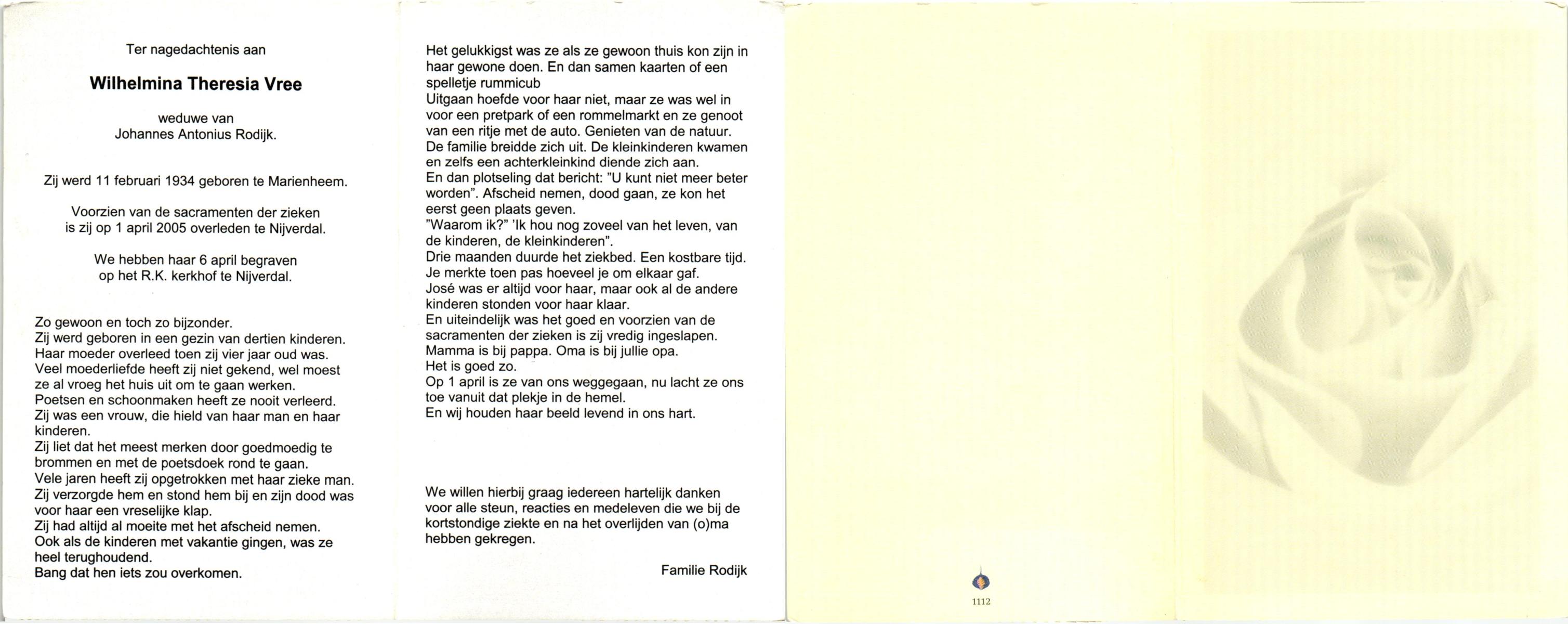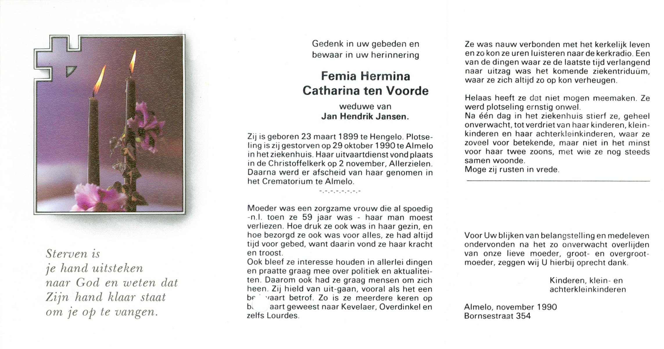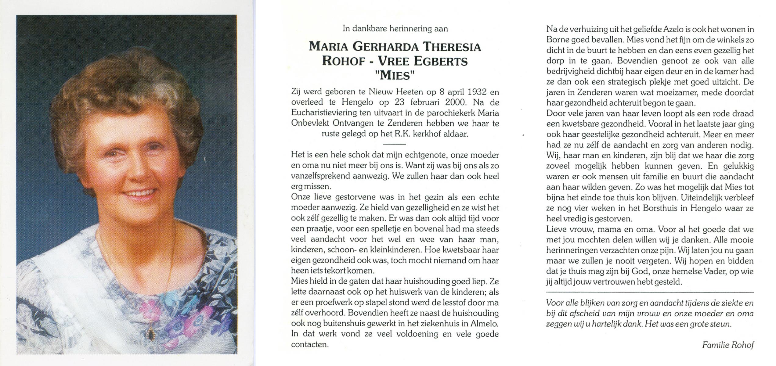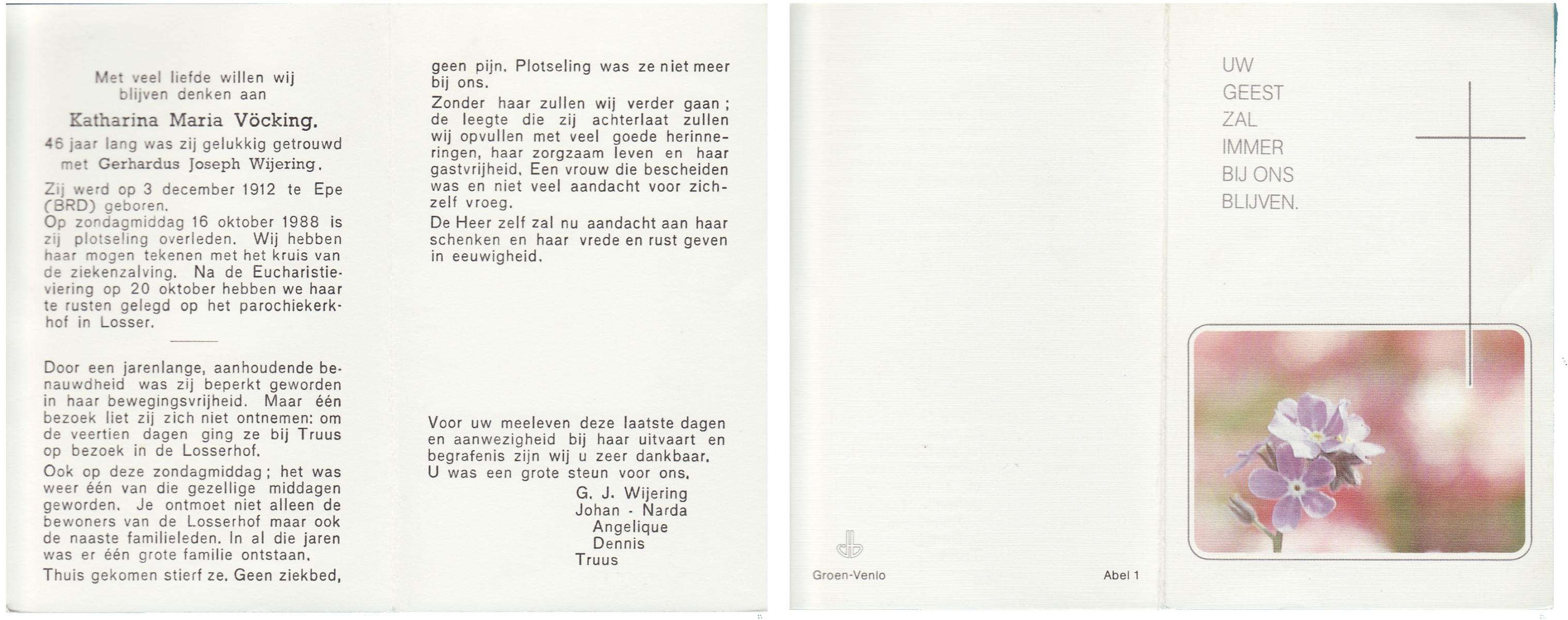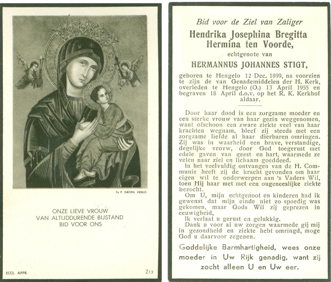 VRERINK, Maria Johanna, geboren op 5-10-1923 te Tubbergen, overleden op 14-4-1990 te Hengelo op 66-jarige leeftijd, begraven op 18-4-1990 te Hengelo.