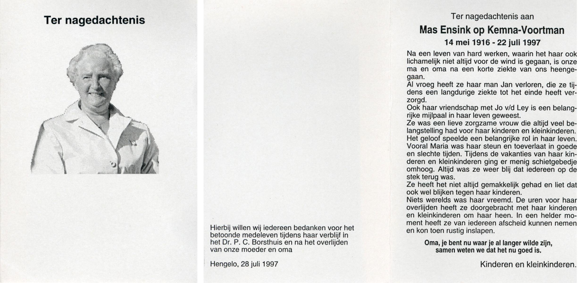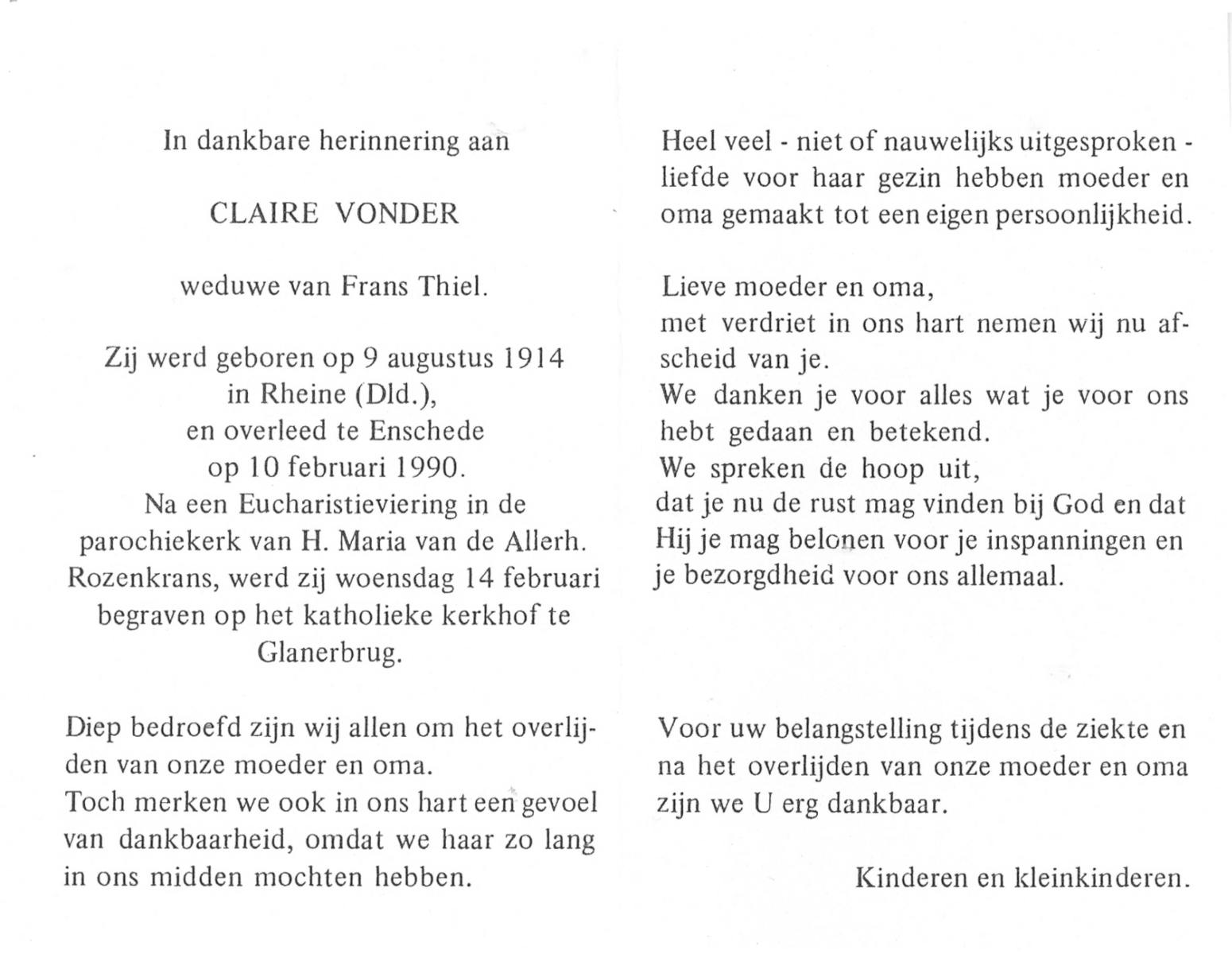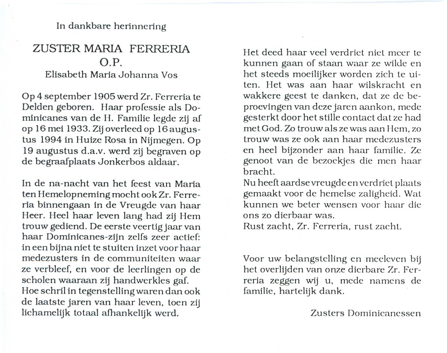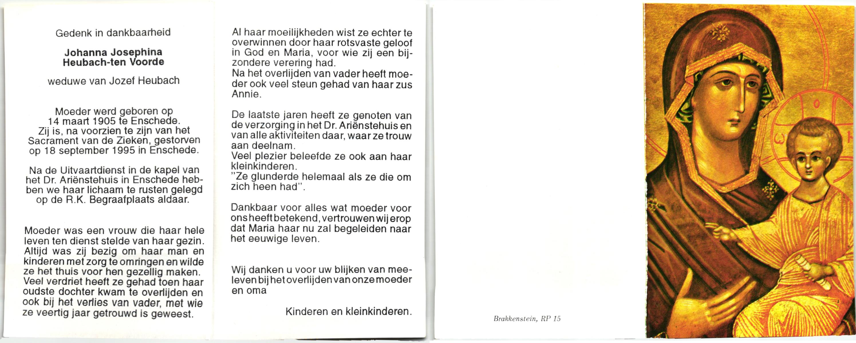 VRERINK, Maria Johanna, geboren op 5-10-1923 te Tubbergen, overleden op 14-4-1990 te Hengelo op 66-jarige leeftijd, begraven op 18-4-1990 te Hengelo.