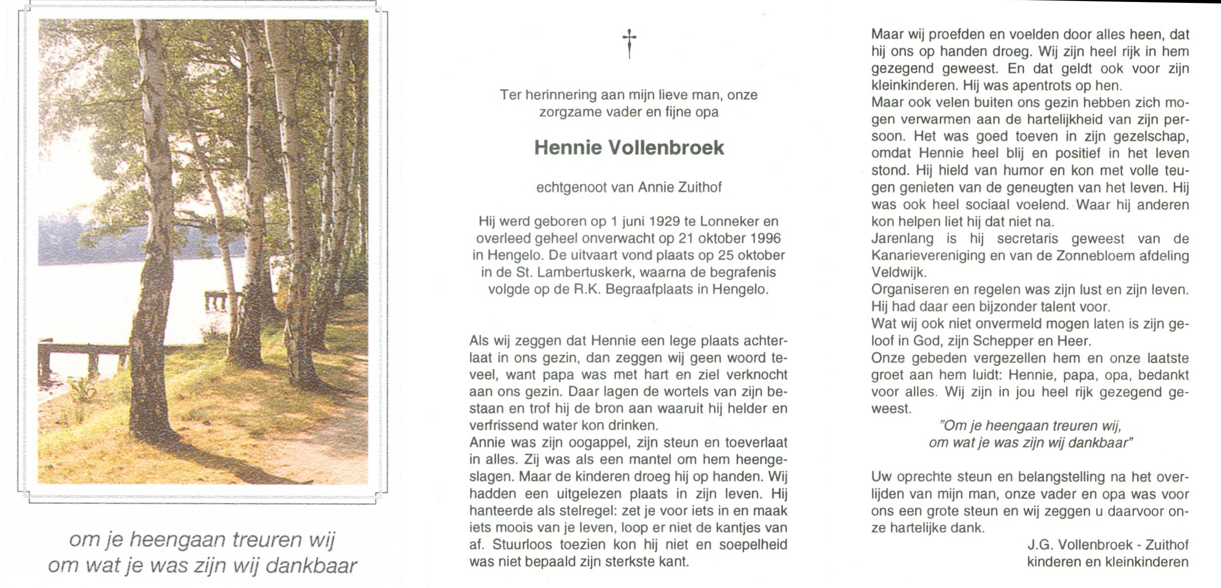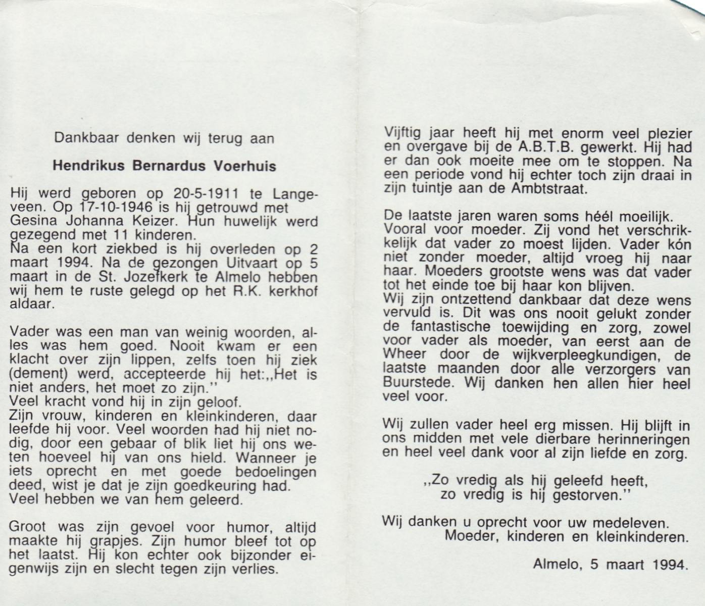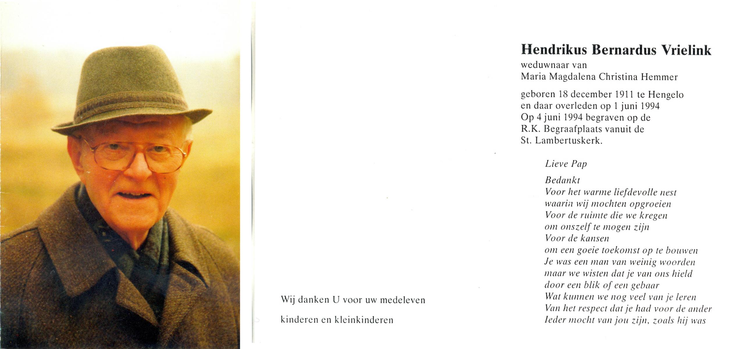 VRIELINK, Hendrikus Bernardus, geboren op 18-12-1911 te Hengelo (O), overleden op 1-6-1994 op 82-jarige leeftijd, begraven op 4-6-1994 te Hengelo (Ov.).