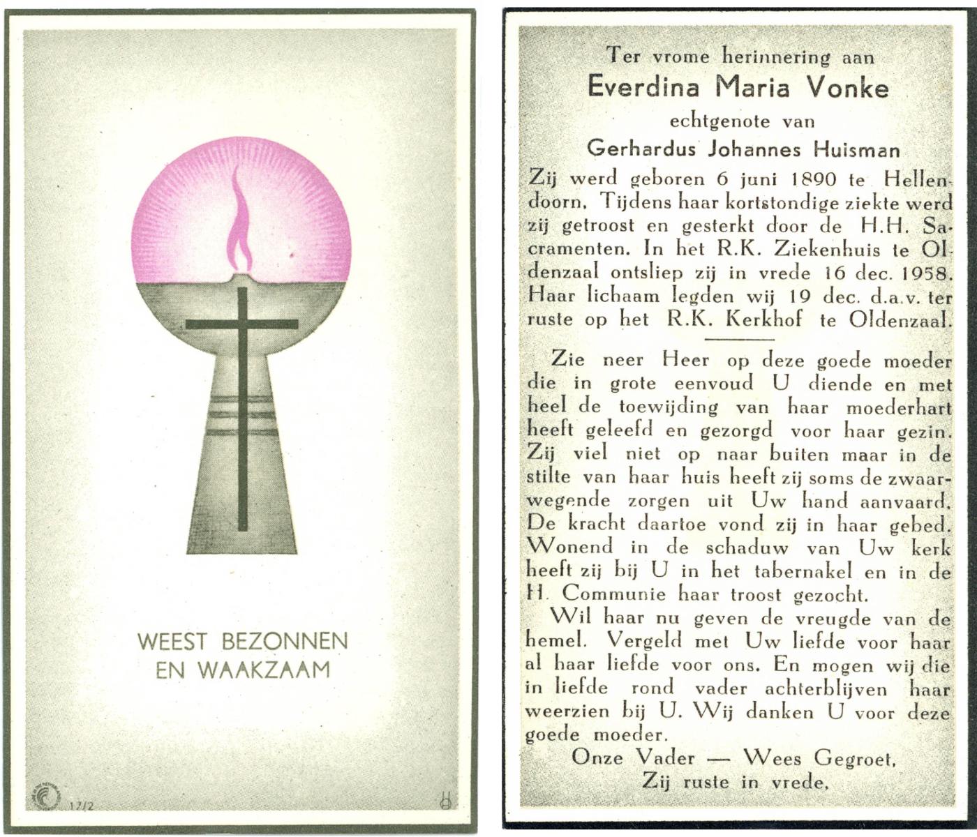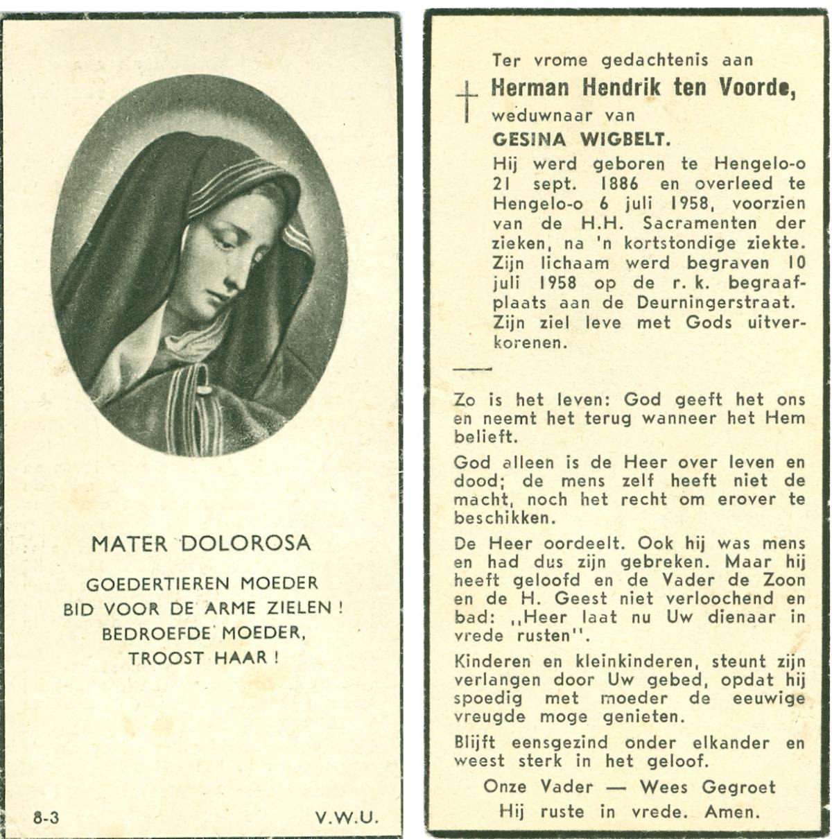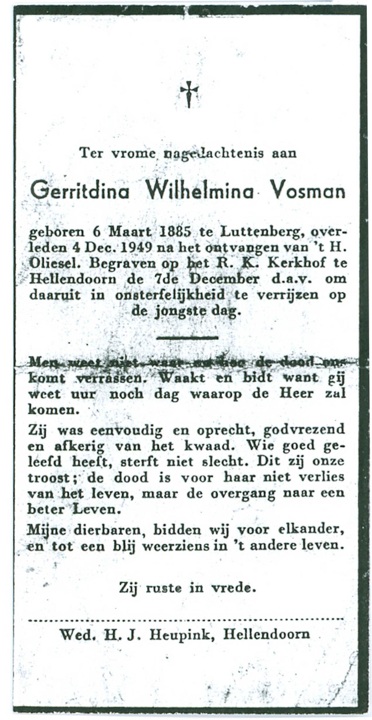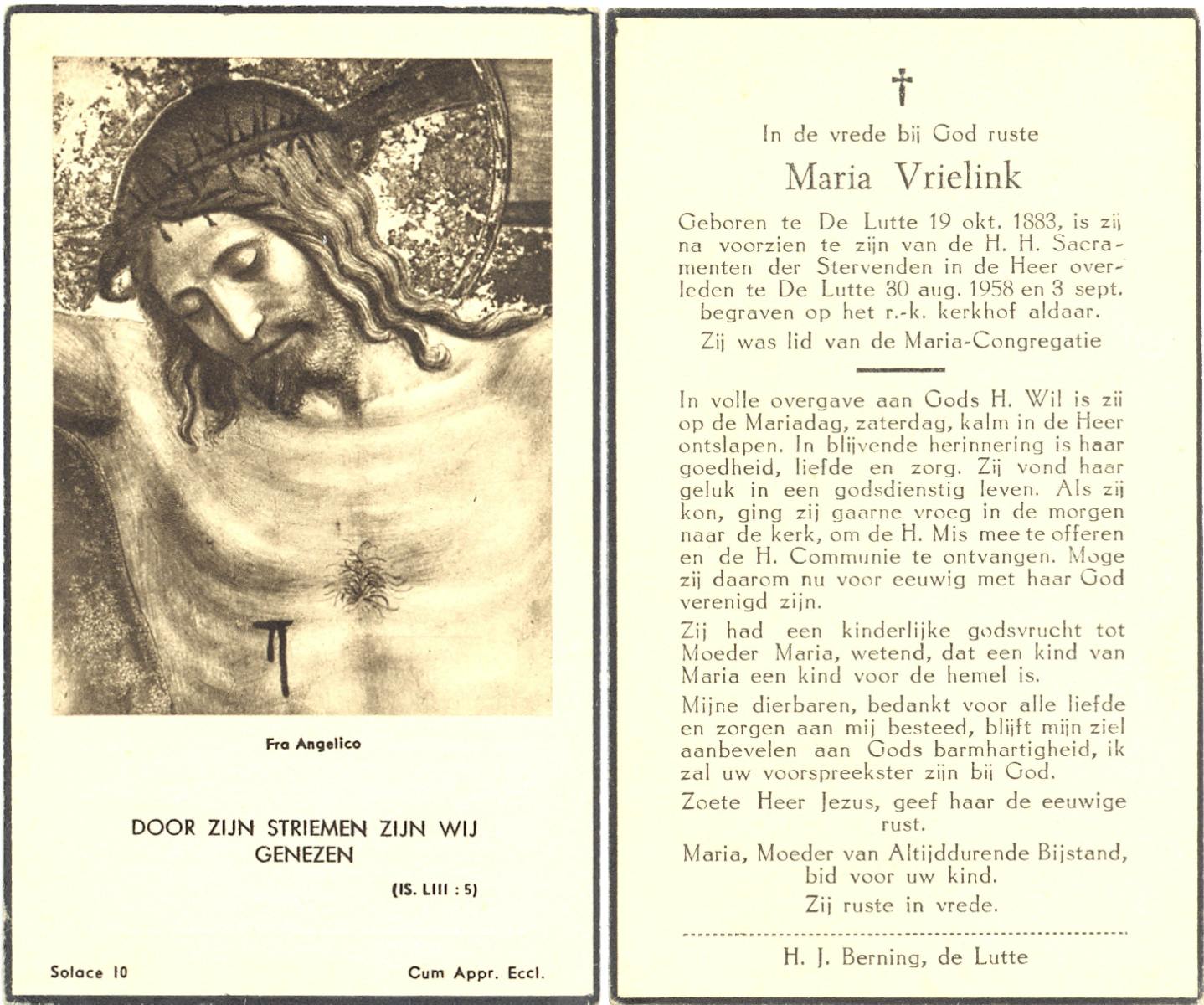VRIELINK, Maria, geboren op 19-10-1883 te De Lutte, overleden op 30-8-1958 te De Lutte op 74-jarige leeftijd, begraven op 3-9-1958 te De Lutte.