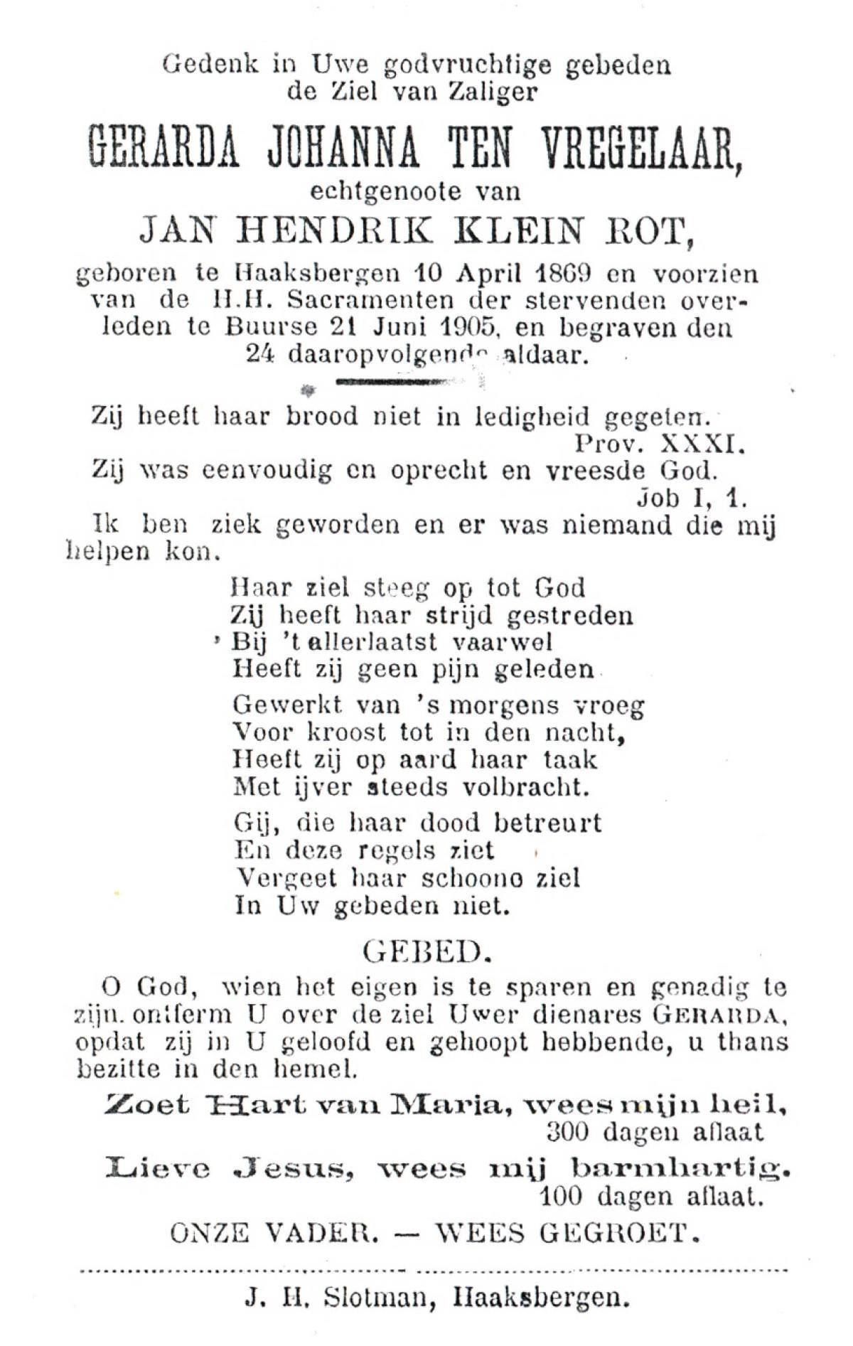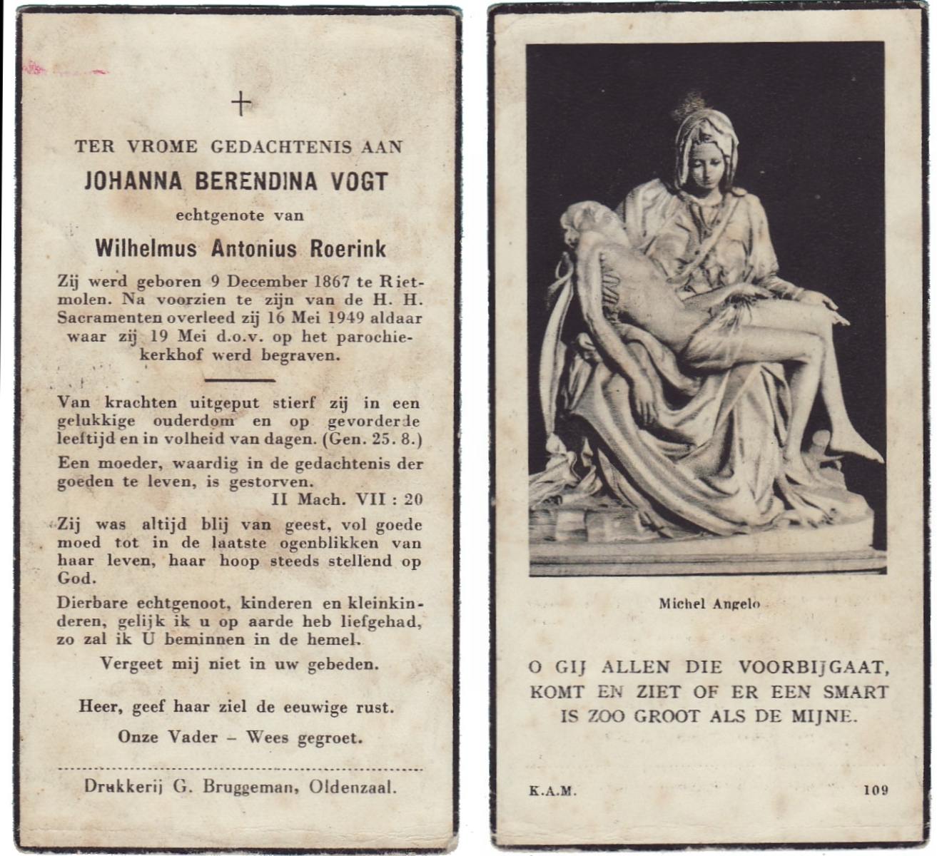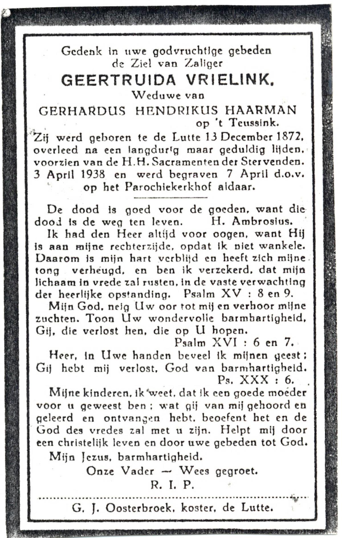VRIELINK, Geertruida, geboren op 13-12-1872 te De Lutte, overleden op 3-4-1938 op 67-jarige leeftijd, begraven op 7-4-1938 te De Lutte.
