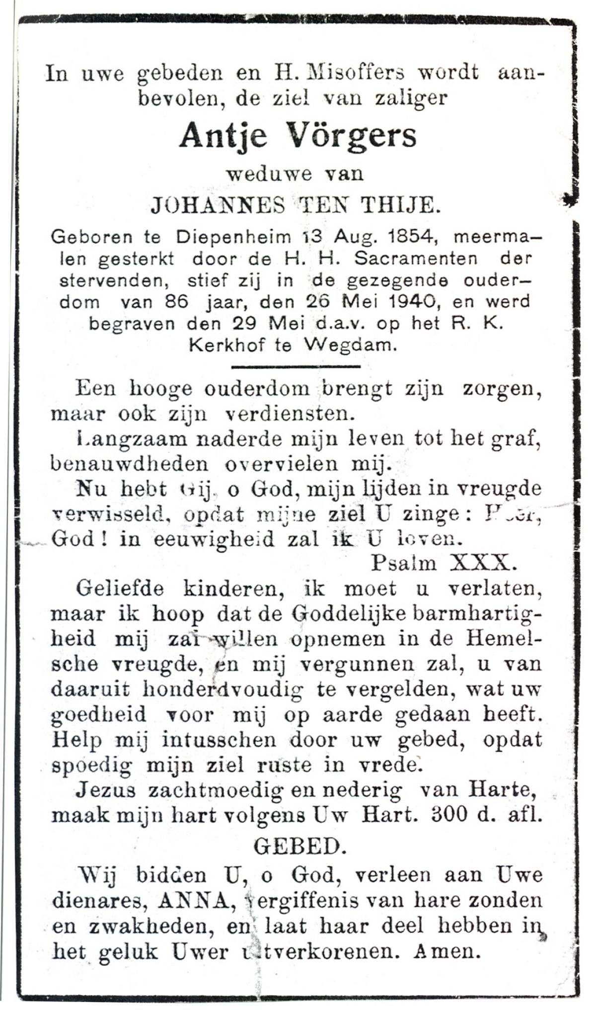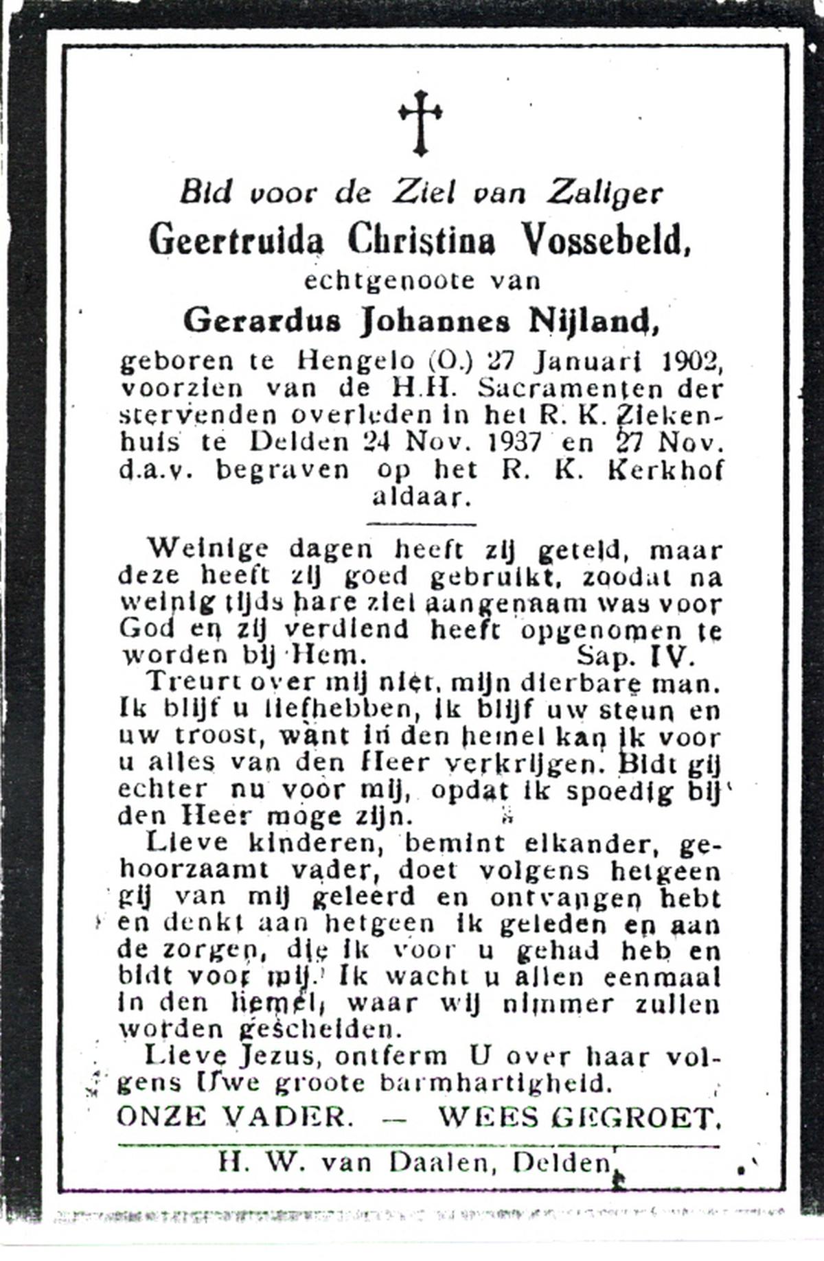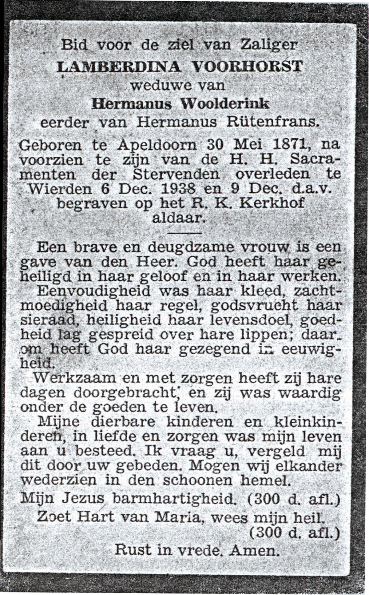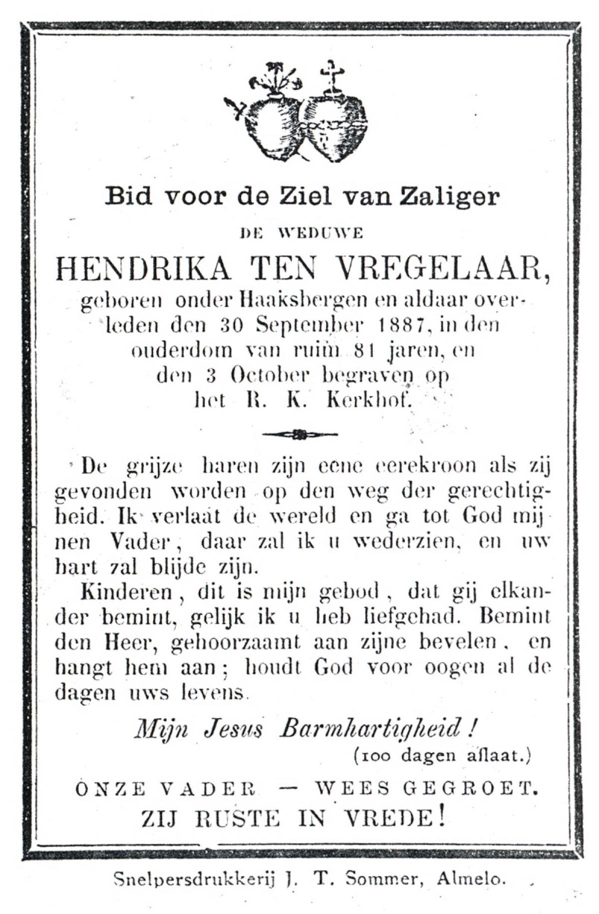 VRIELINK, Geertruida, geboren op 13-12-1872 te De Lutte, overleden op 3-4-1938 op 67-jarige leeftijd, begraven op 7-4-1938 te De Lutte.