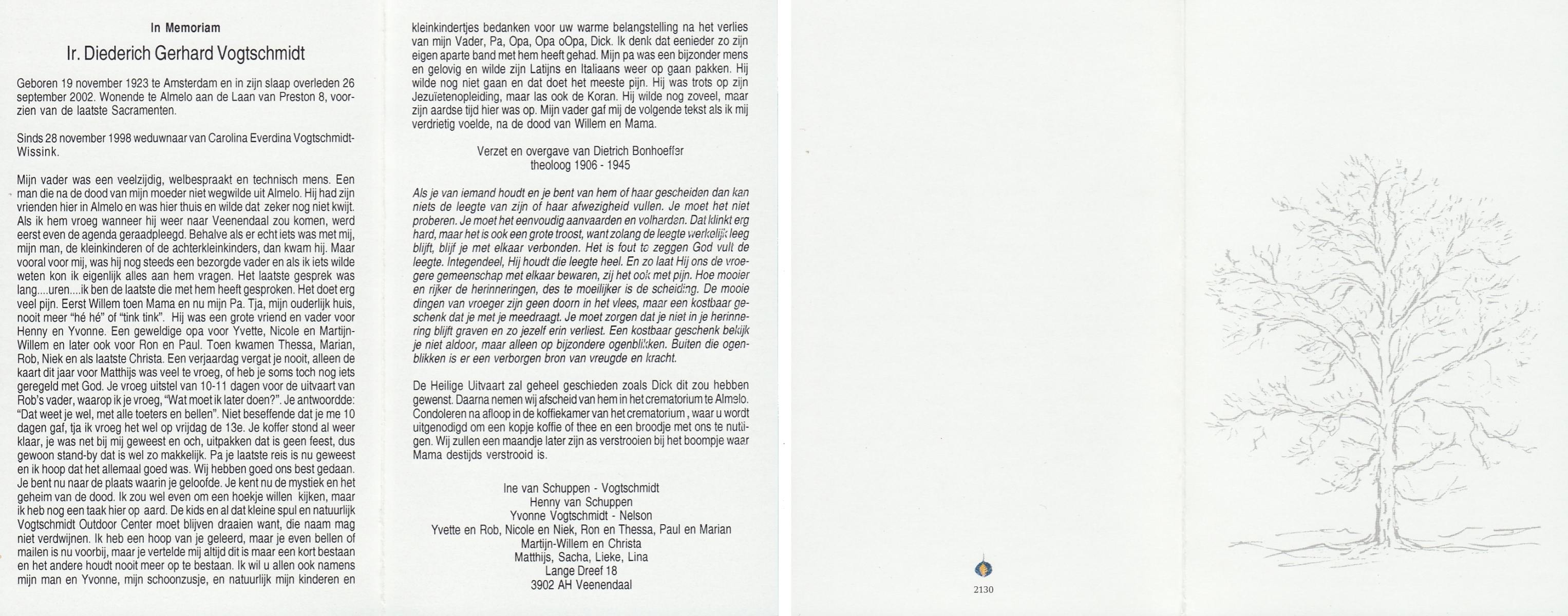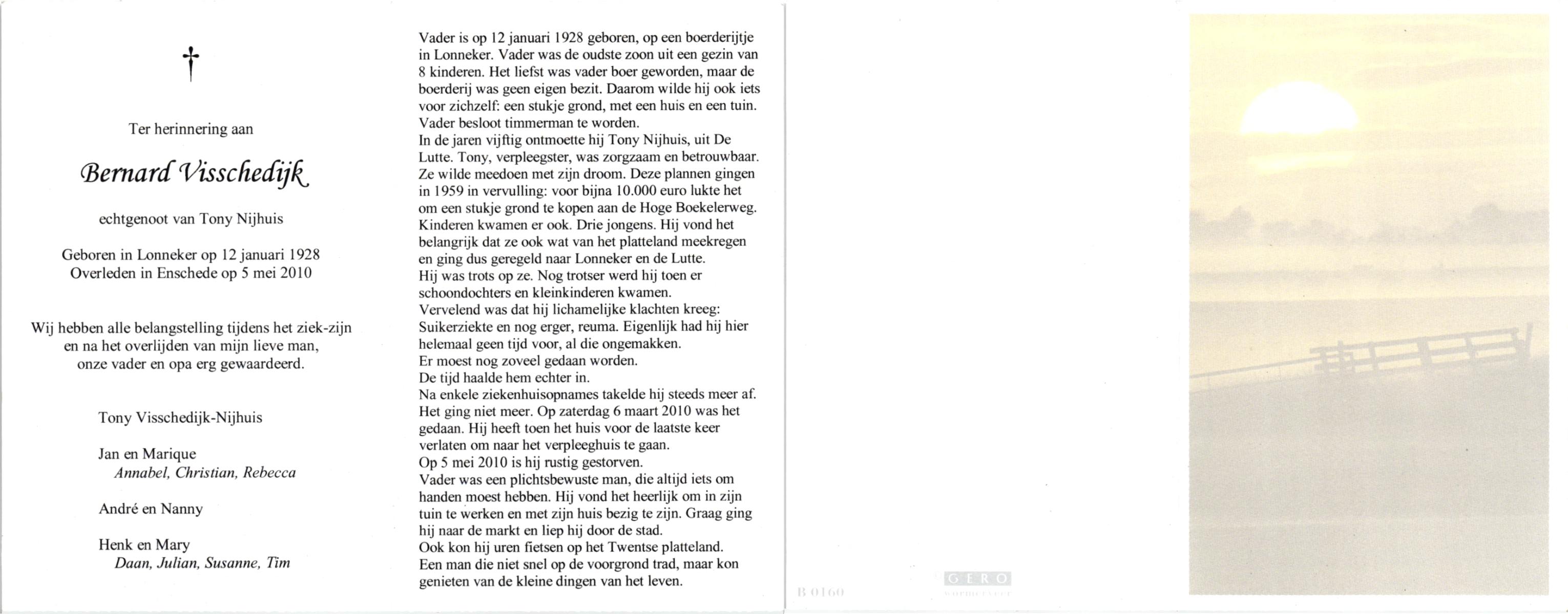 VISSCHEDIJK, , Bernard, geboren op 12-1-1928 te Lonneker, overleden op 5-5-2010 te Enschede op 82-jarige leeftijd.