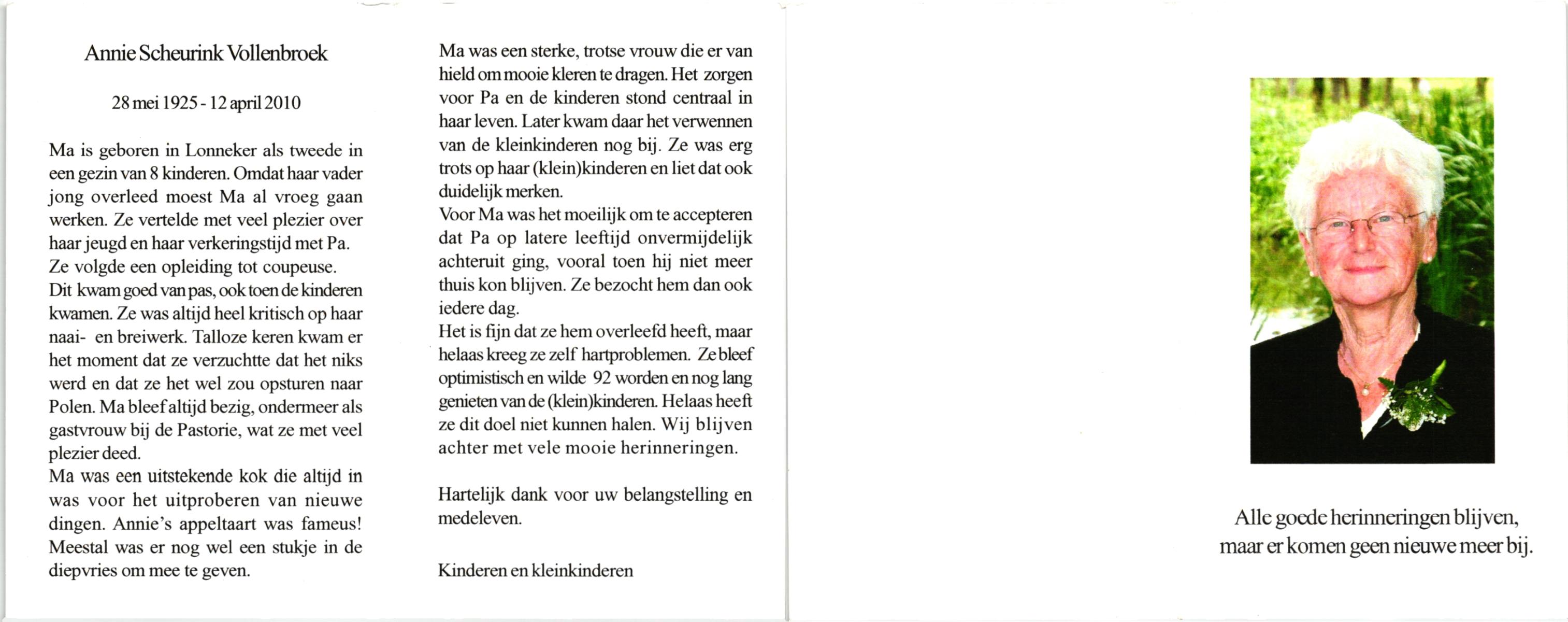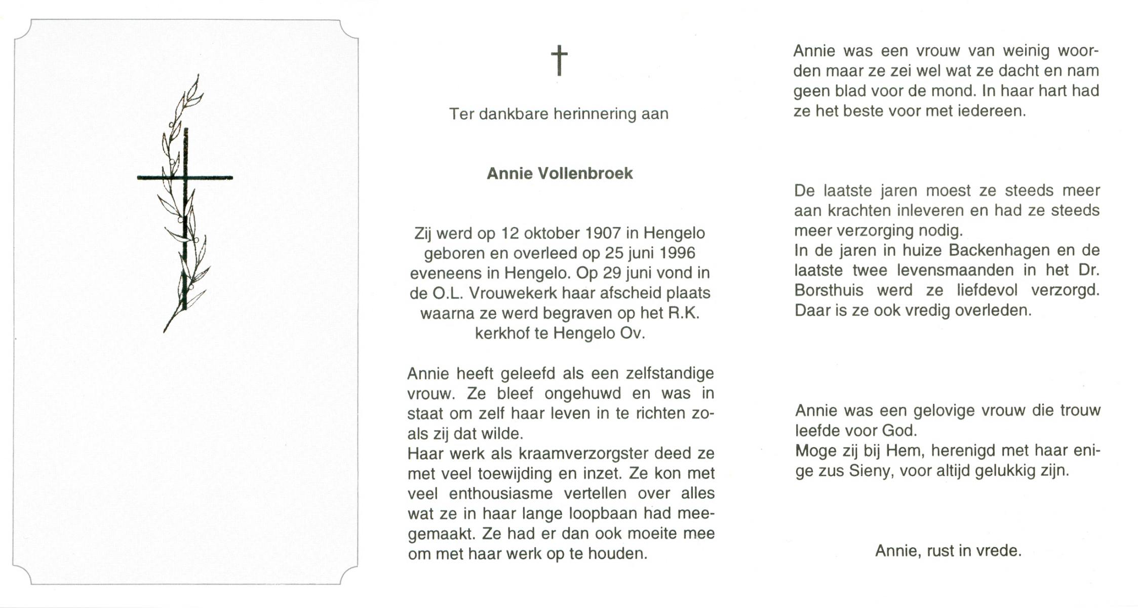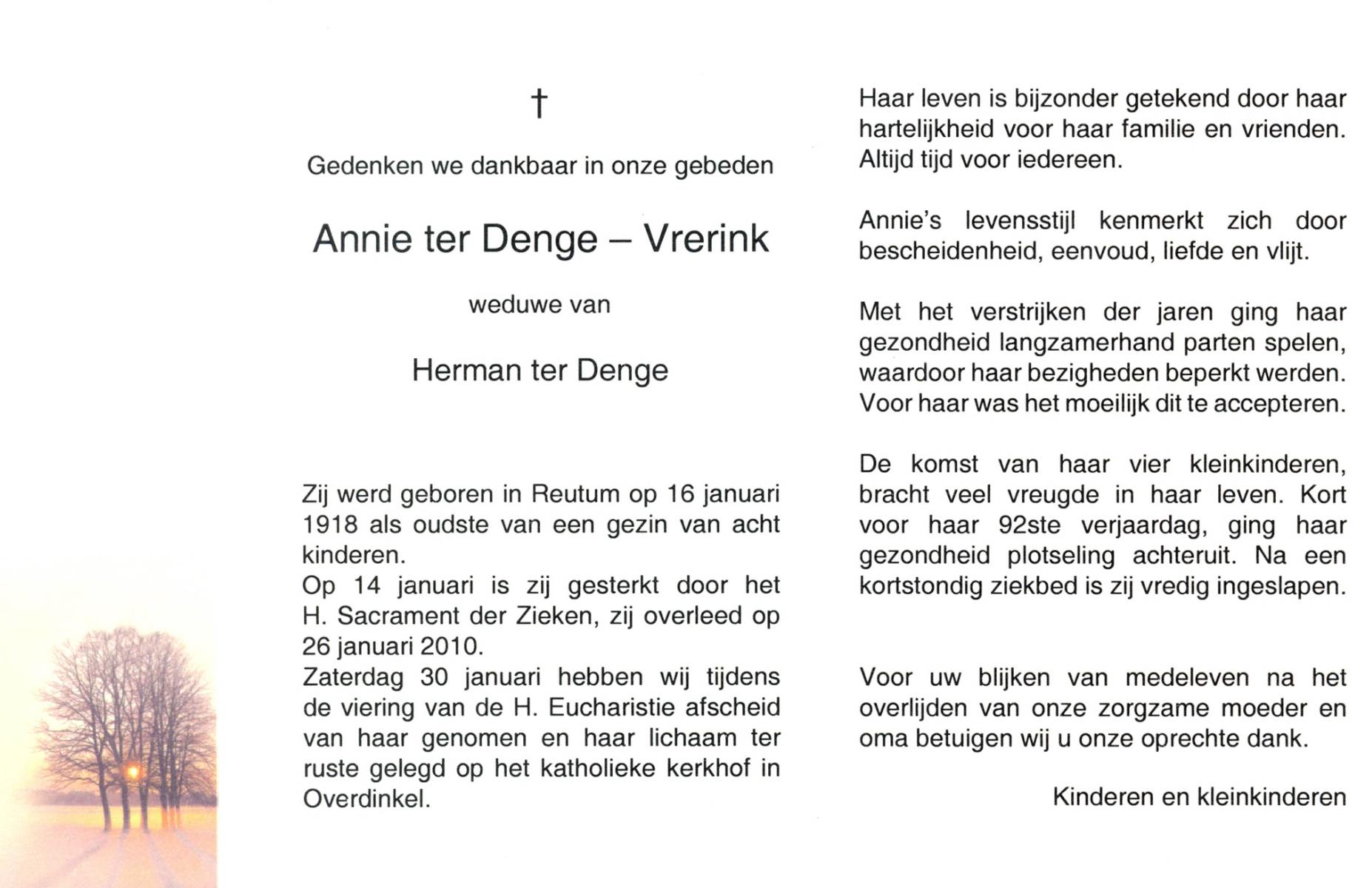 VRERINK, Annie, geboren op 16-1-1918 te Reutum, overleden op 26-1-2010 op 92-jarige leeftijd, begraven op 30-1-2010 te Overdinkel.
