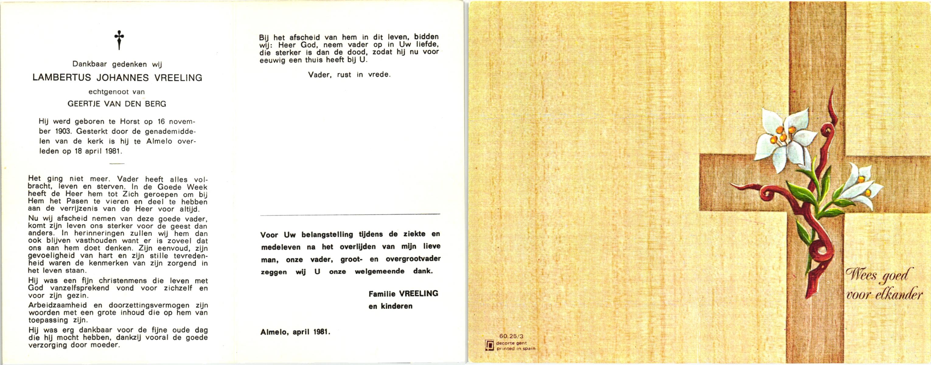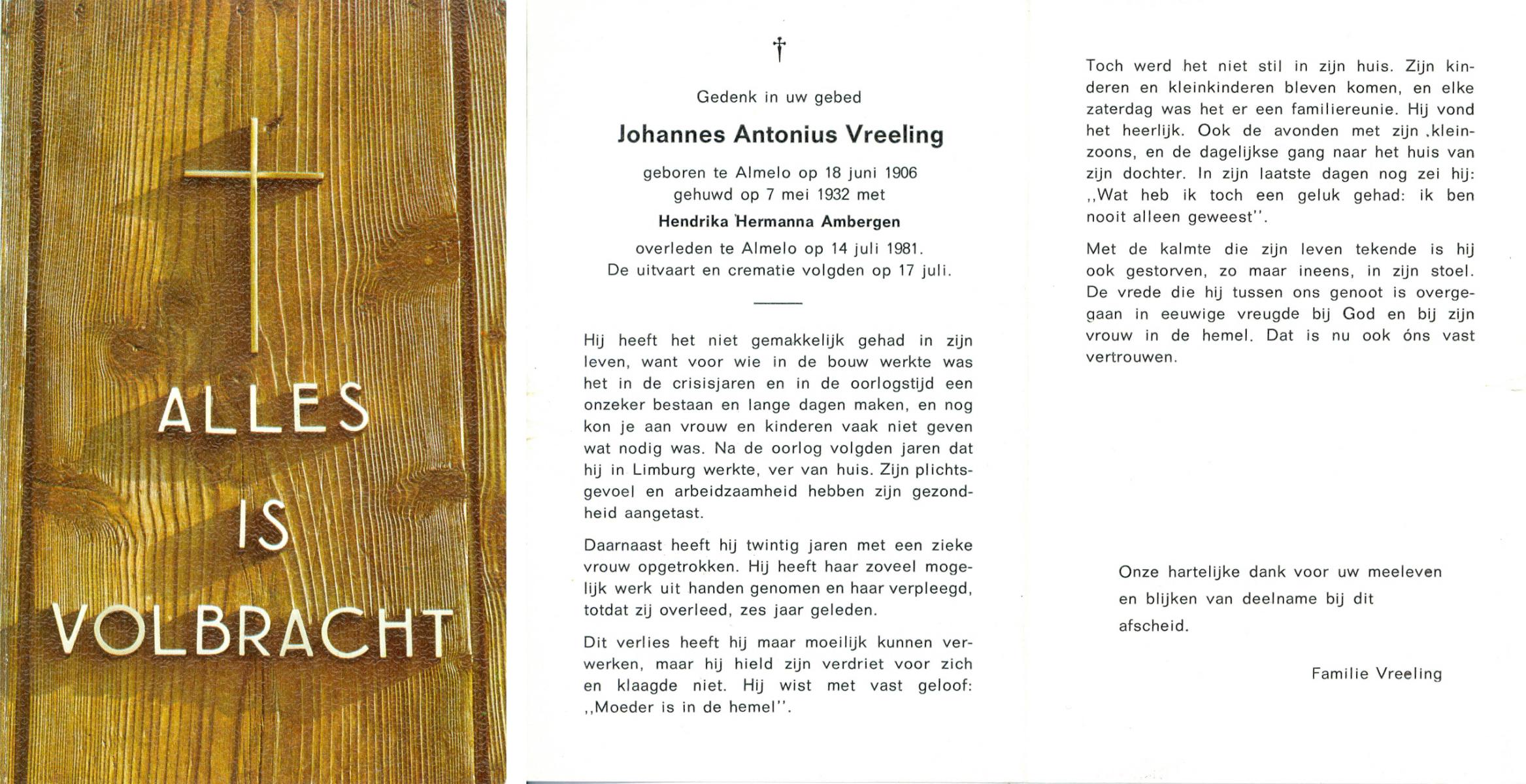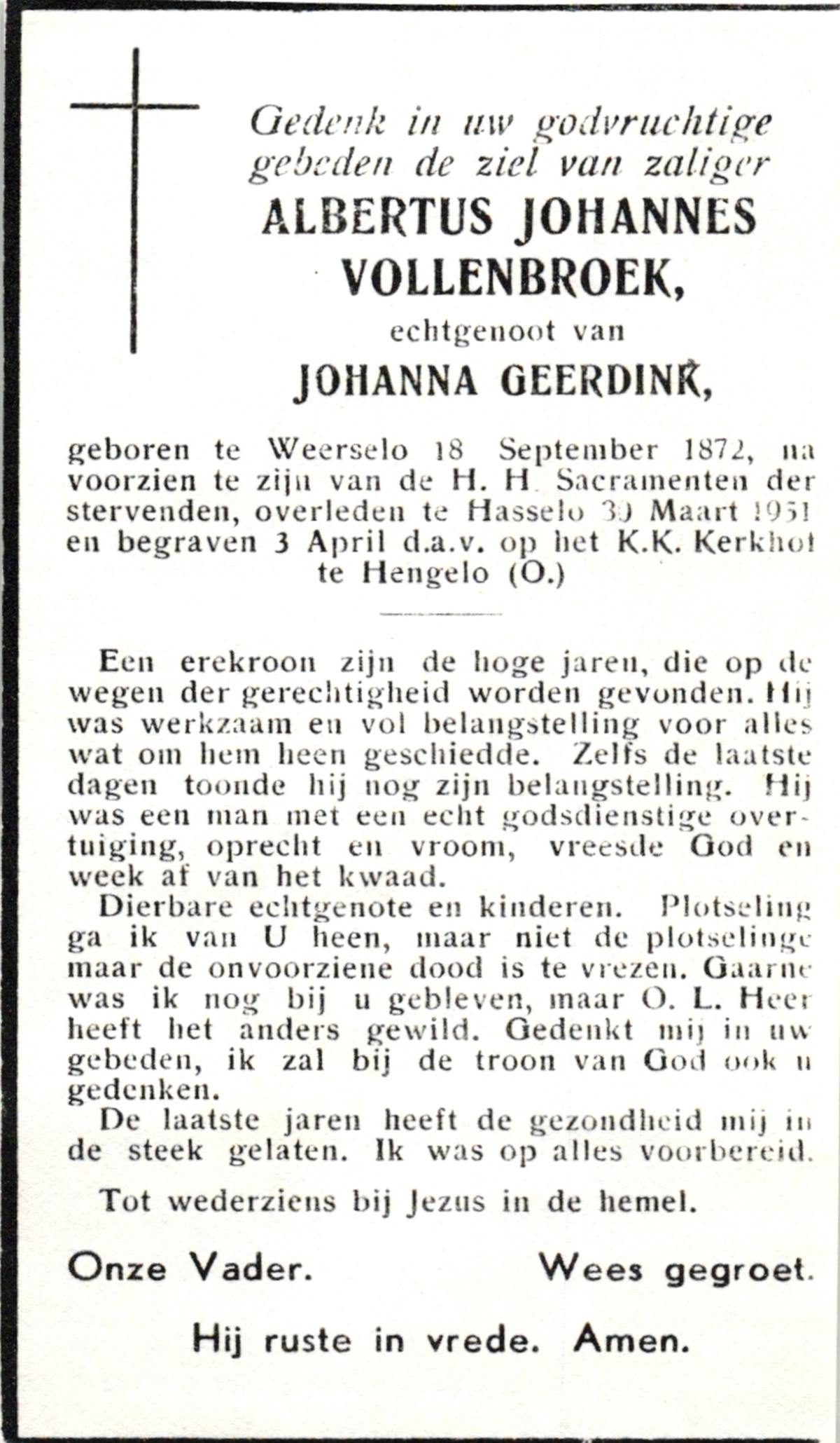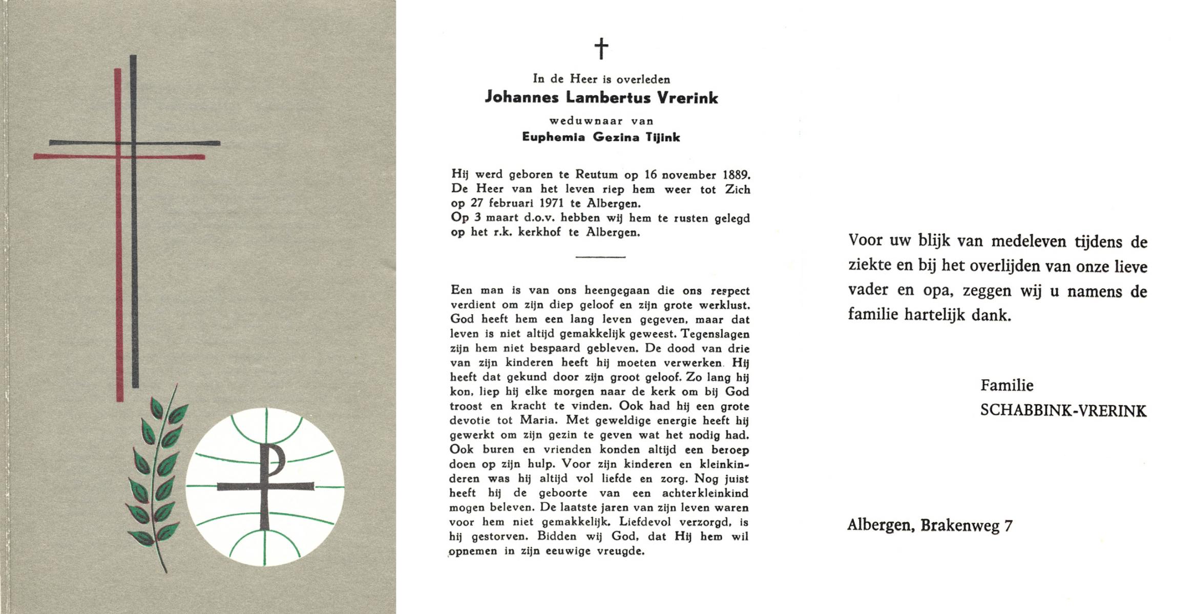 VRERINK, Johannes Lambertus, geboren op 16-11-1889 te Reutum, overleden op 27-2-1971 te Albergen op 81-jarige leeftijd, begraven op 3-3-1971 te Albergen.