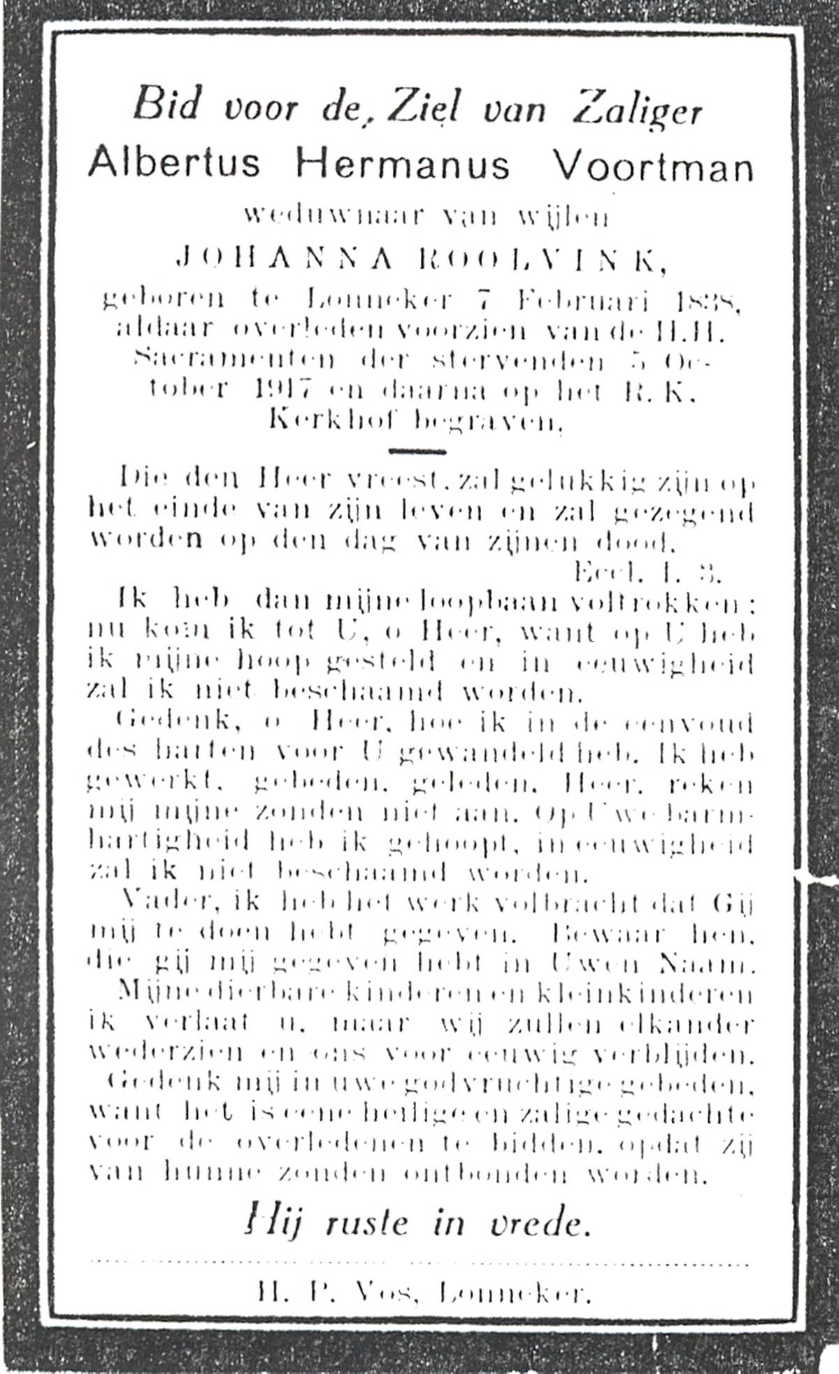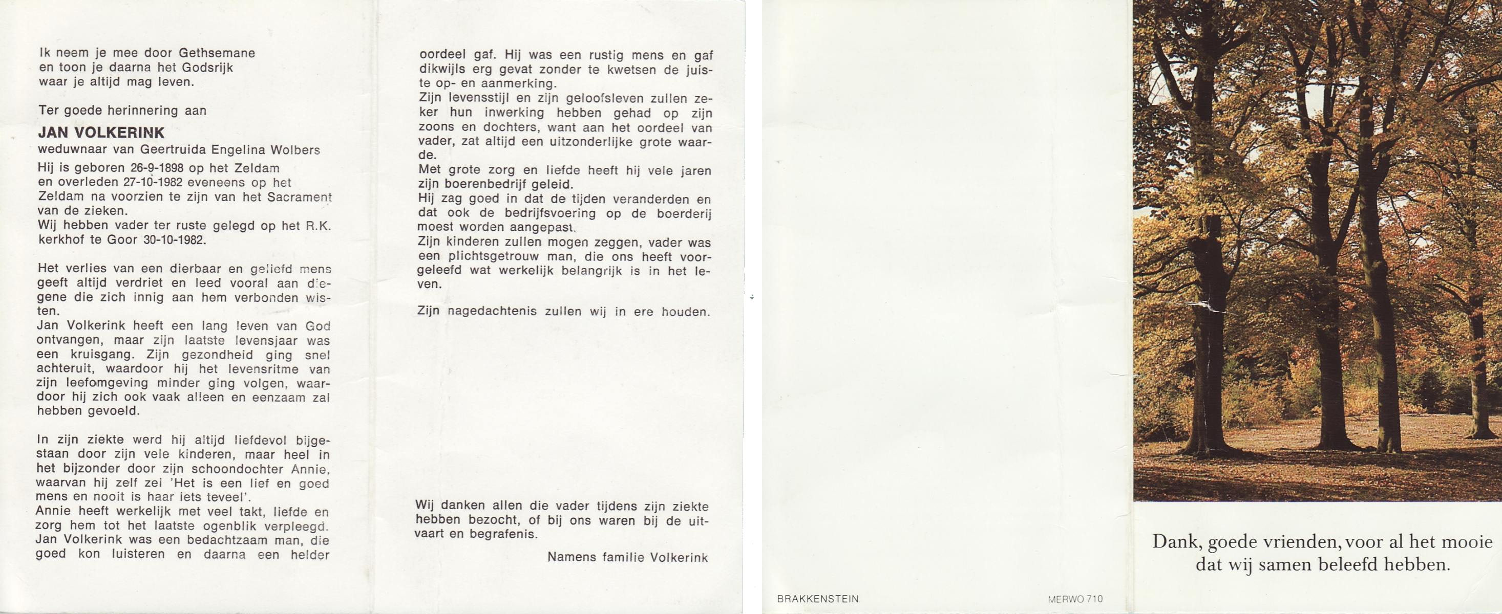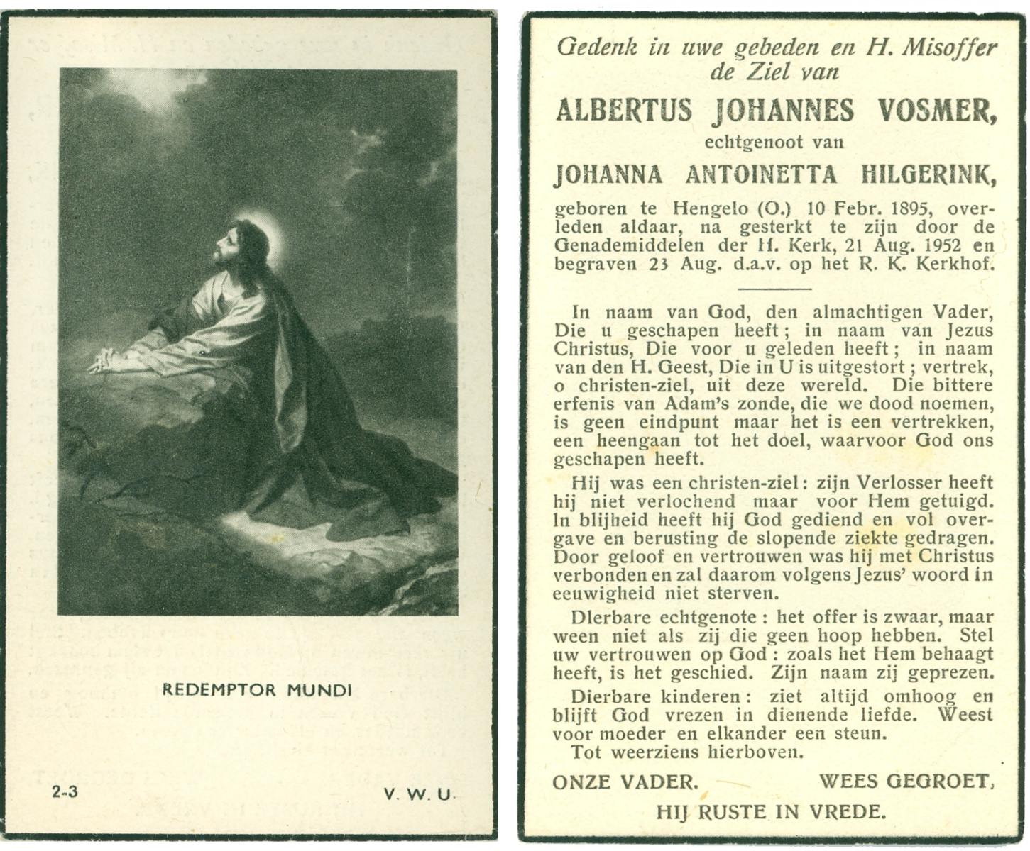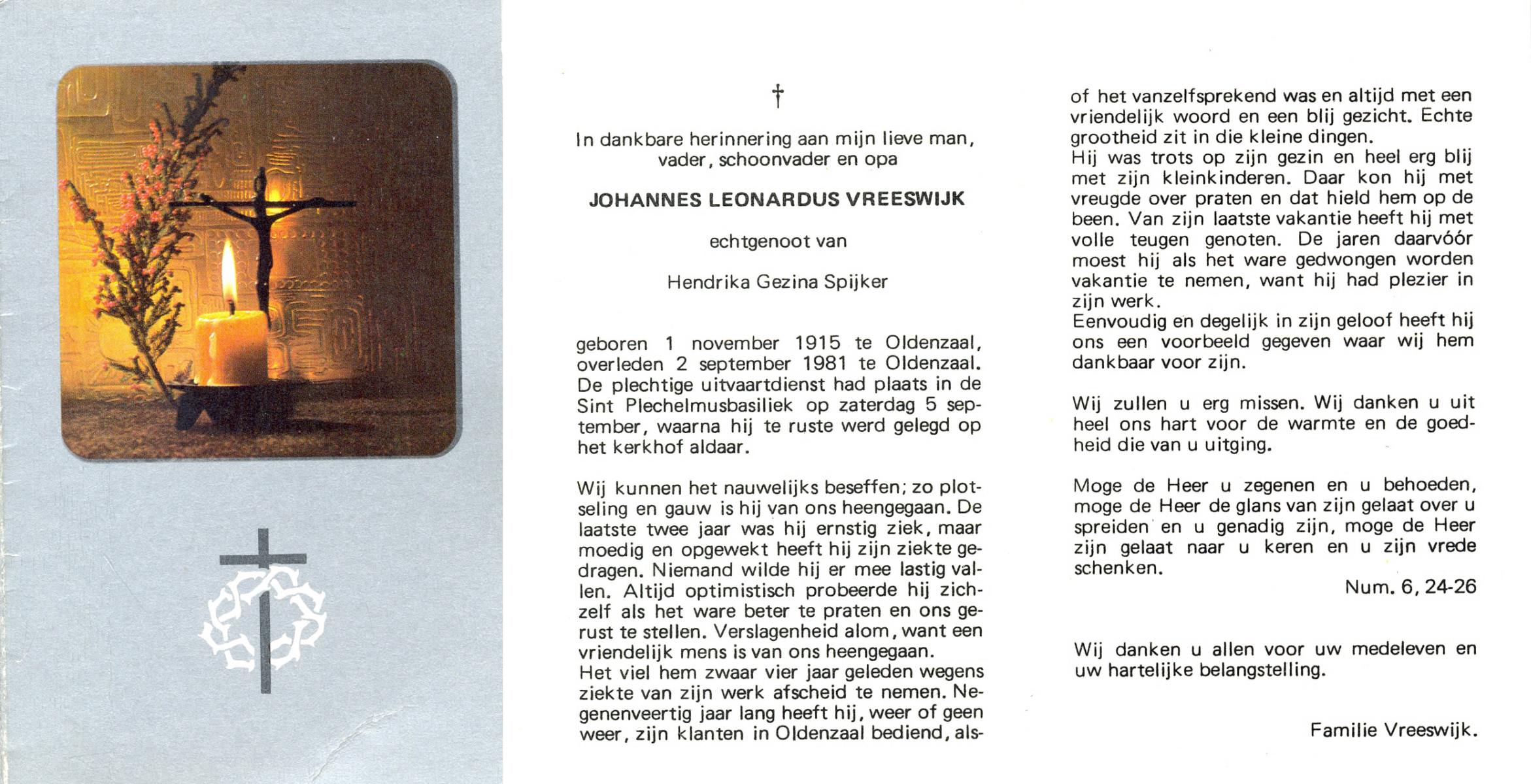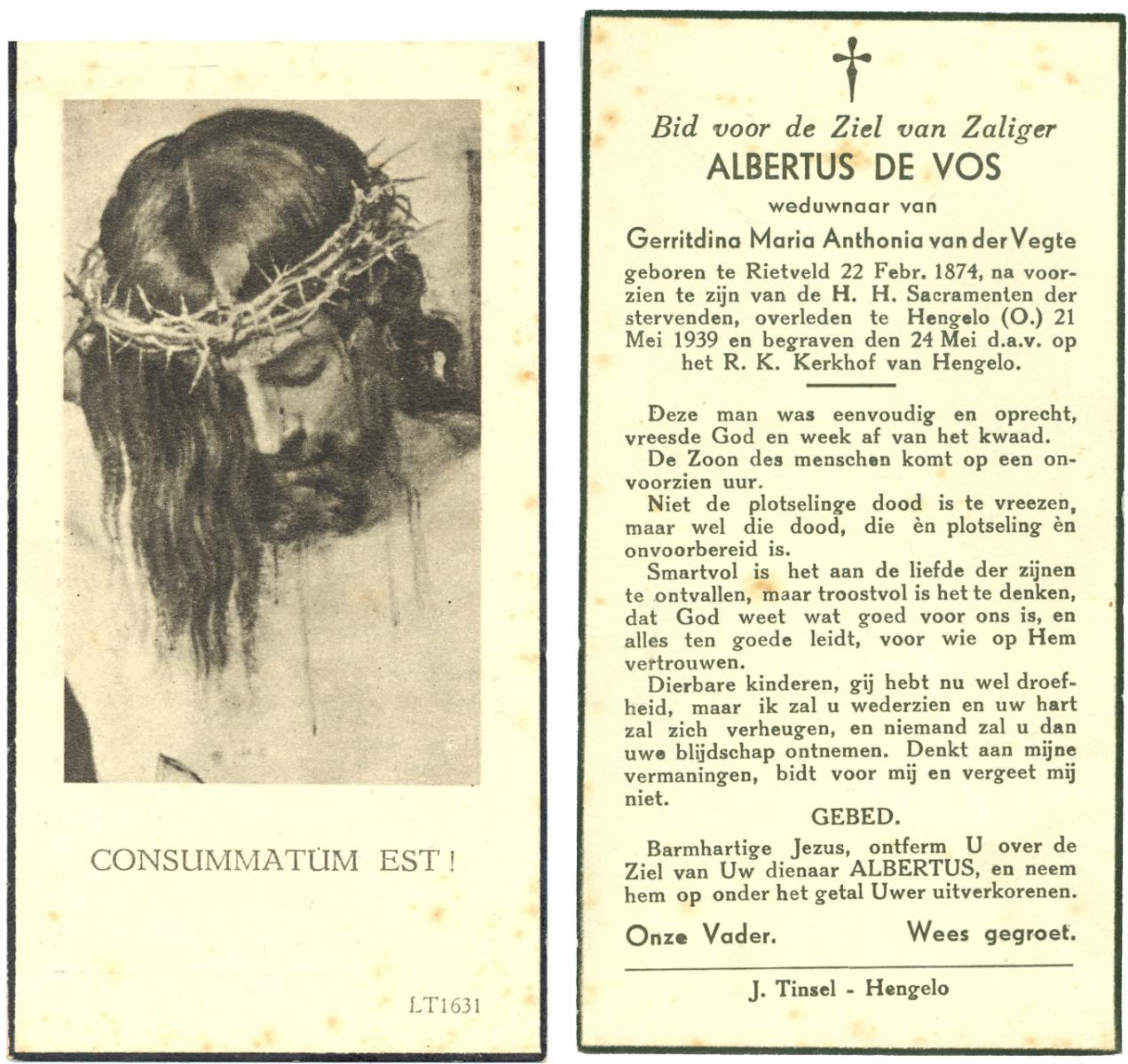 VRERINK, Johannes Lambertus, geboren op 16-11-1889 te Reutum, overleden op 27-2-1971 te Albergen op 81-jarige leeftijd, begraven op 3-3-1971 te Albergen.