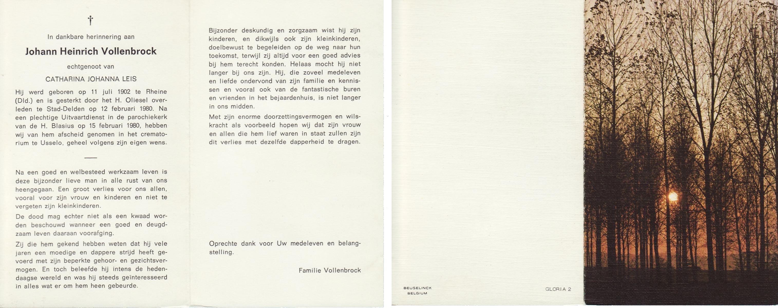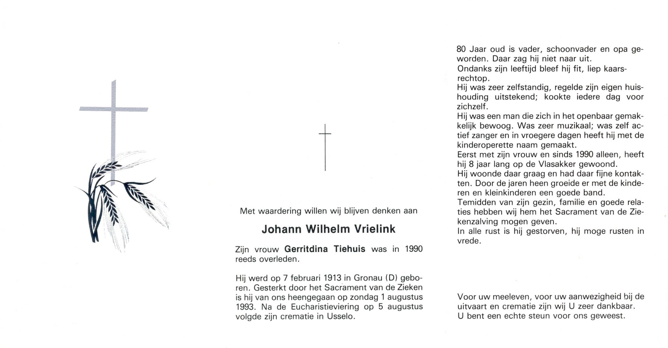 VRIELINK, Johann Wilhelm, geboren op 7-2-1913 te Gronau (Dld.), overleden op 1-8-1993 op 80-jarige leeftijd, gecremeerd op 5-8-1993 te Usselo.