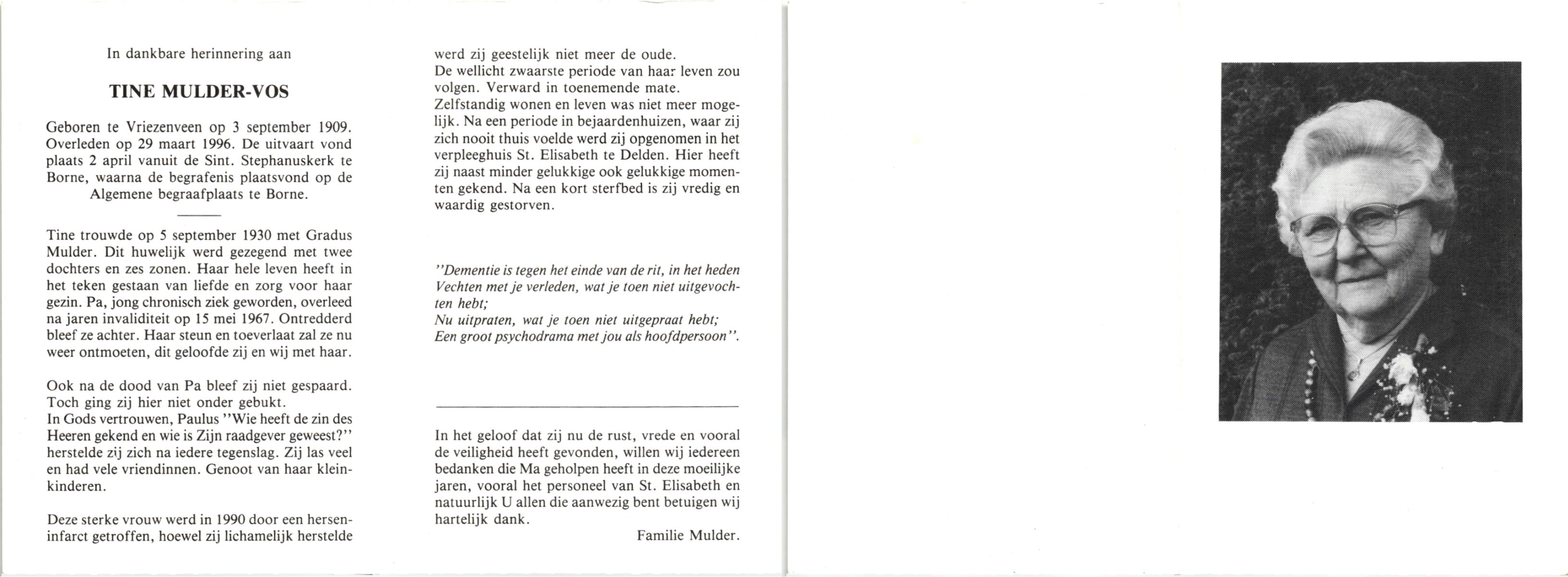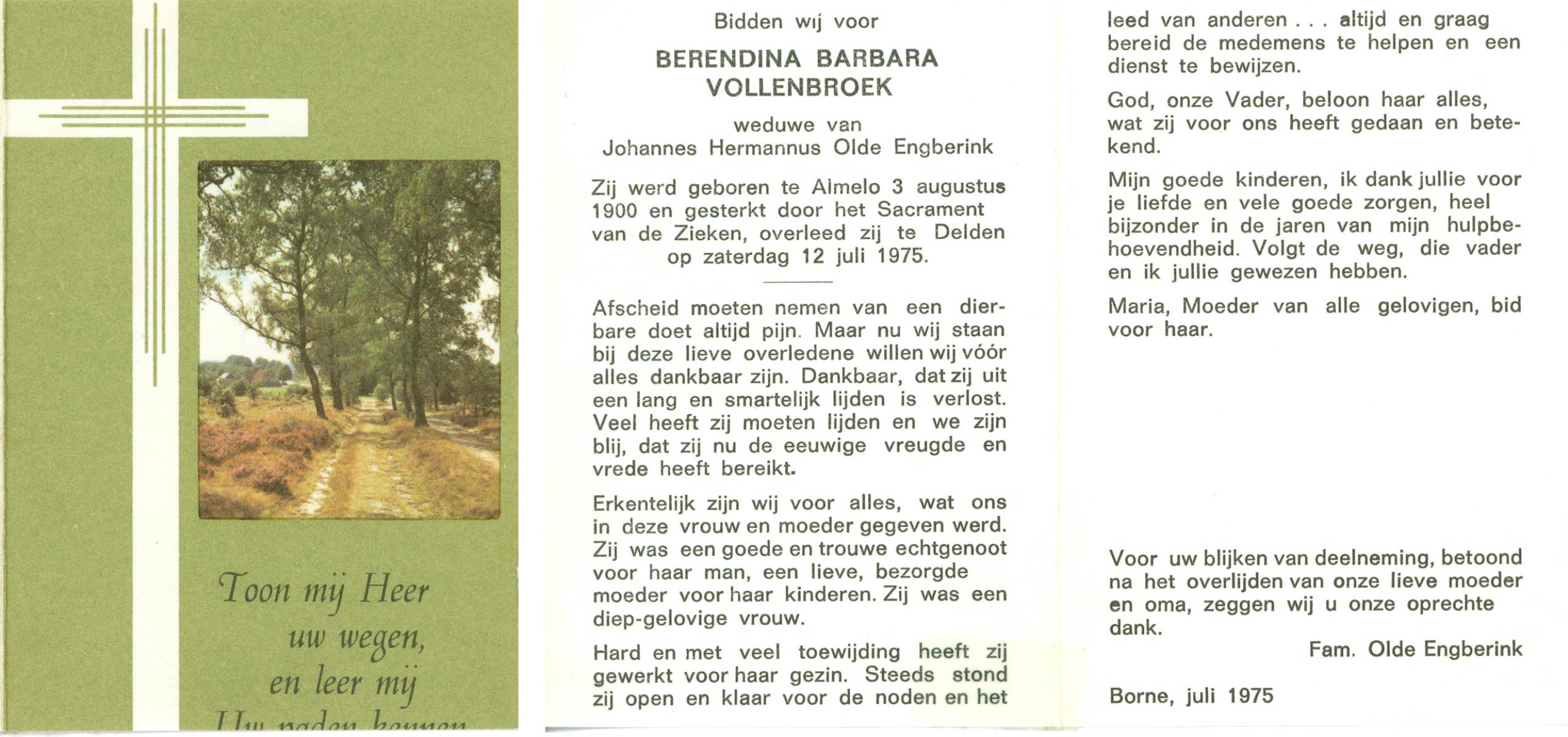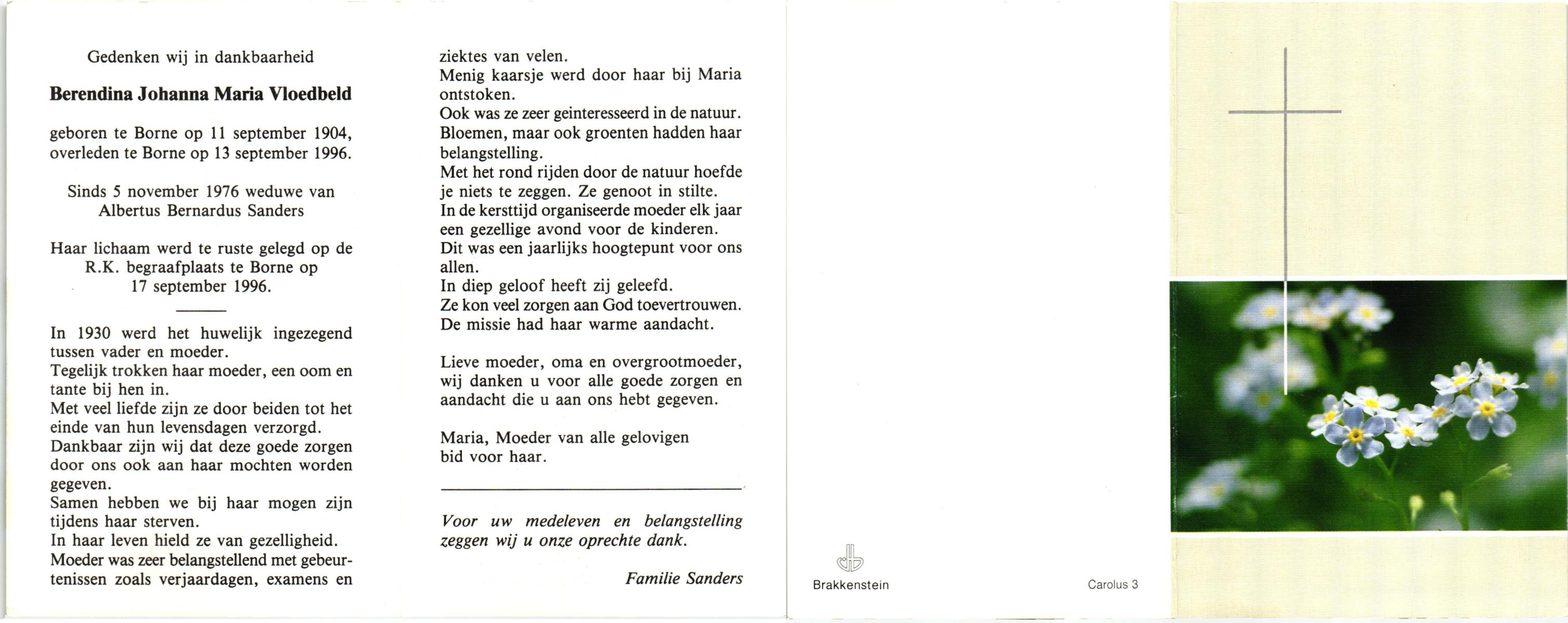 VLOEDBELD, Berendina Johanna Maria, geboren op 11-9-1904 te Borne, overleden op 13-9-1996 te Borne op 92-jarige leeftijd, begraven op 17-9-1996 te Borne.