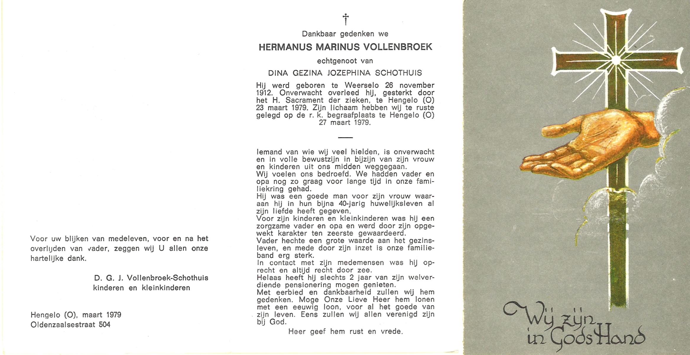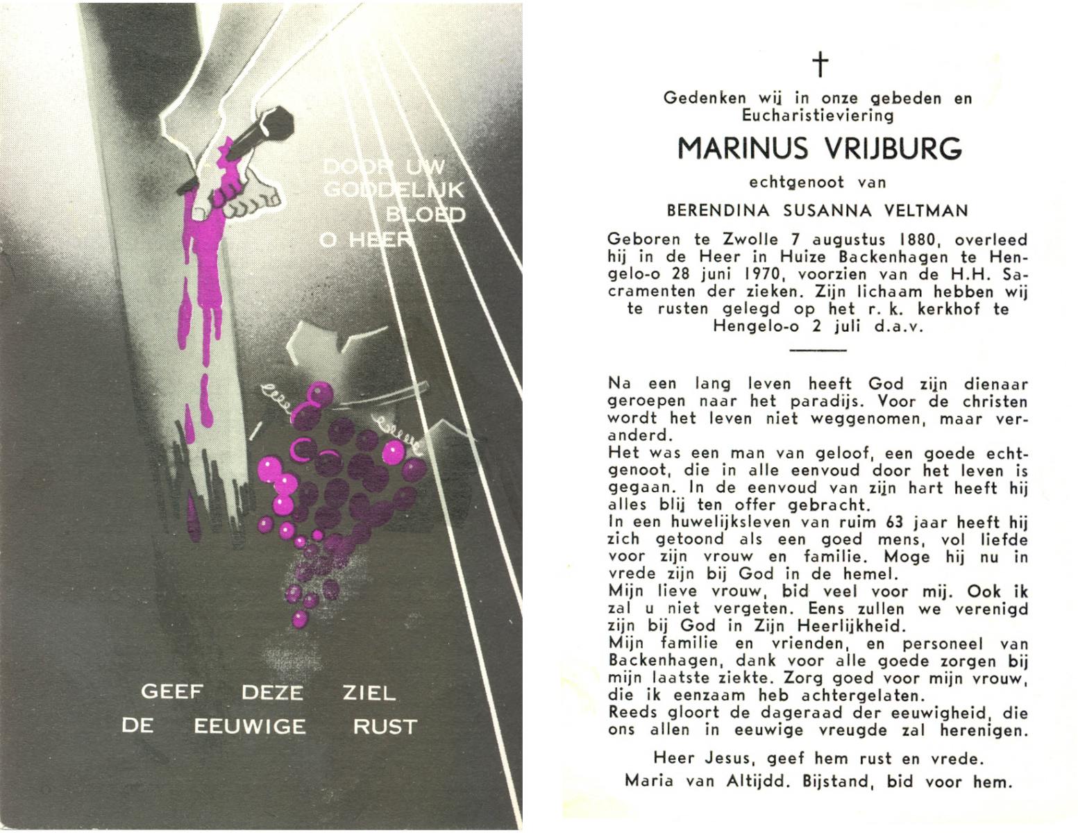 VRIJBURG, Marinus, geboren op 07-08-1880 te Zwolle, overleden op 28-6-1970 te Hengelo (Ov.) op 89-jarige leeftijd, begraven op 2-7-1970 te Hengelo (Ov.).