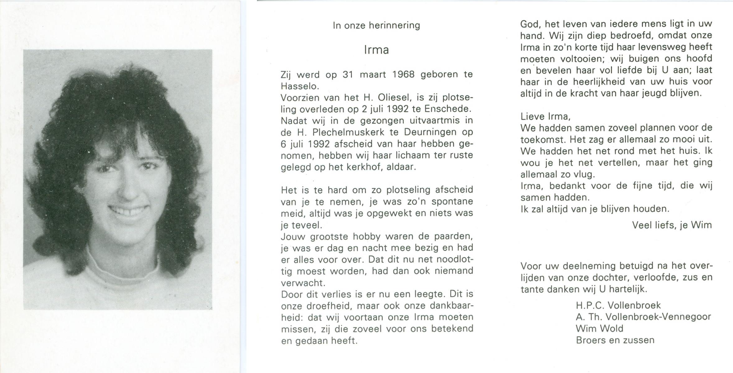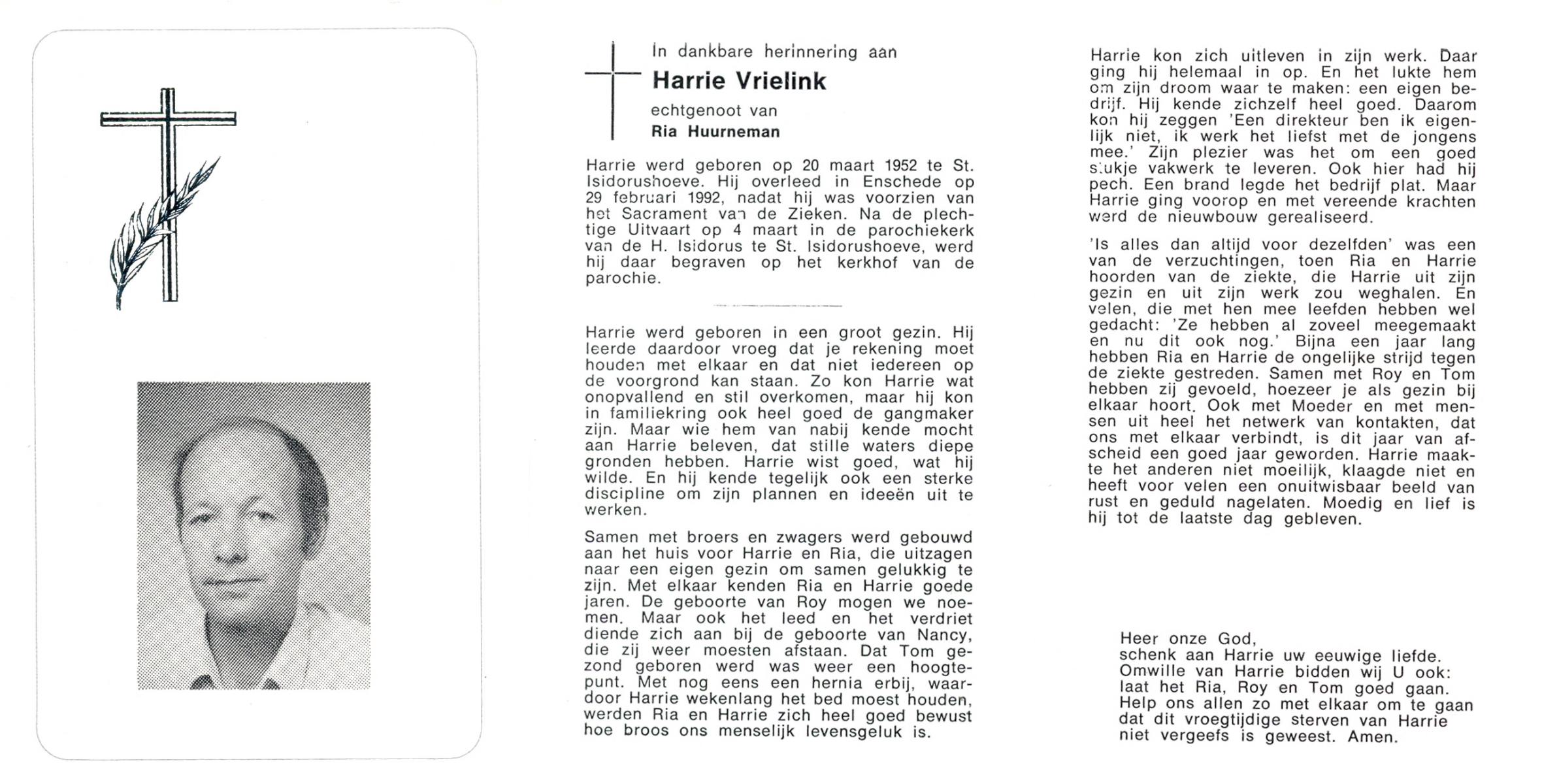 VRIELINK, Harrie, geboren op 20-3-1952 te St. Isidorushoeve, overleden op 29-2-1992 te Enschede op 39-jarige leeftijd, begraven op 4-3-1992 te St. Isidorushoeve.