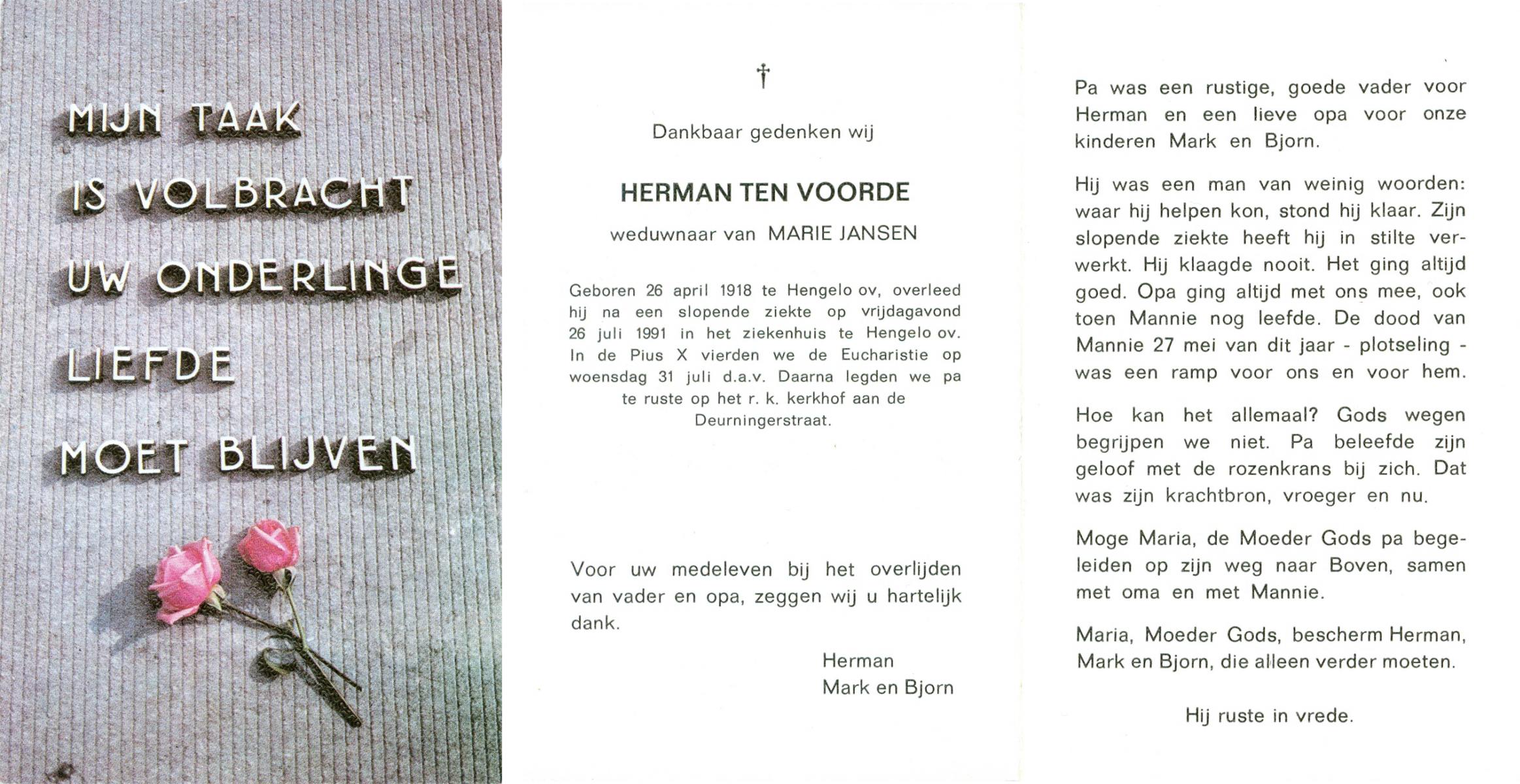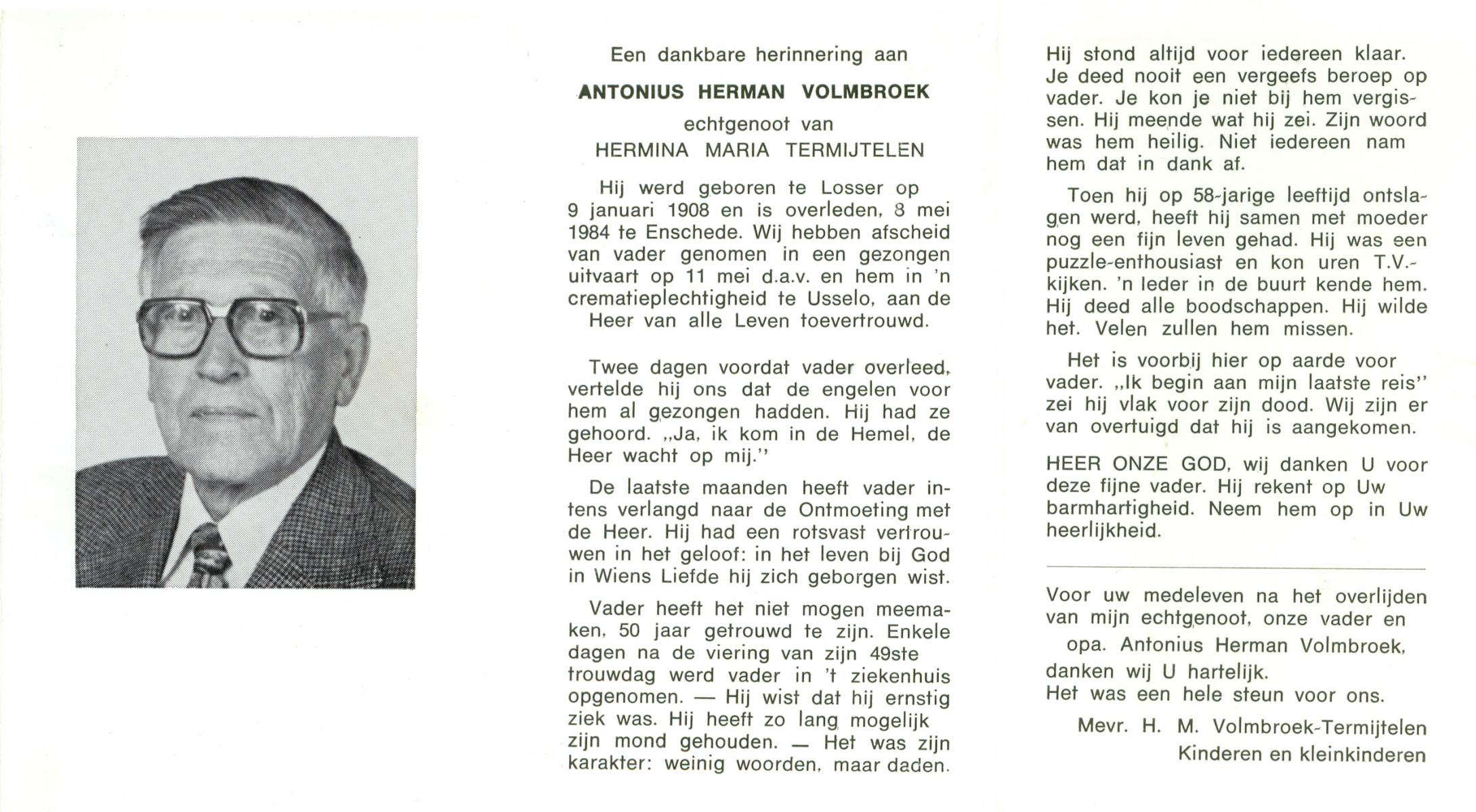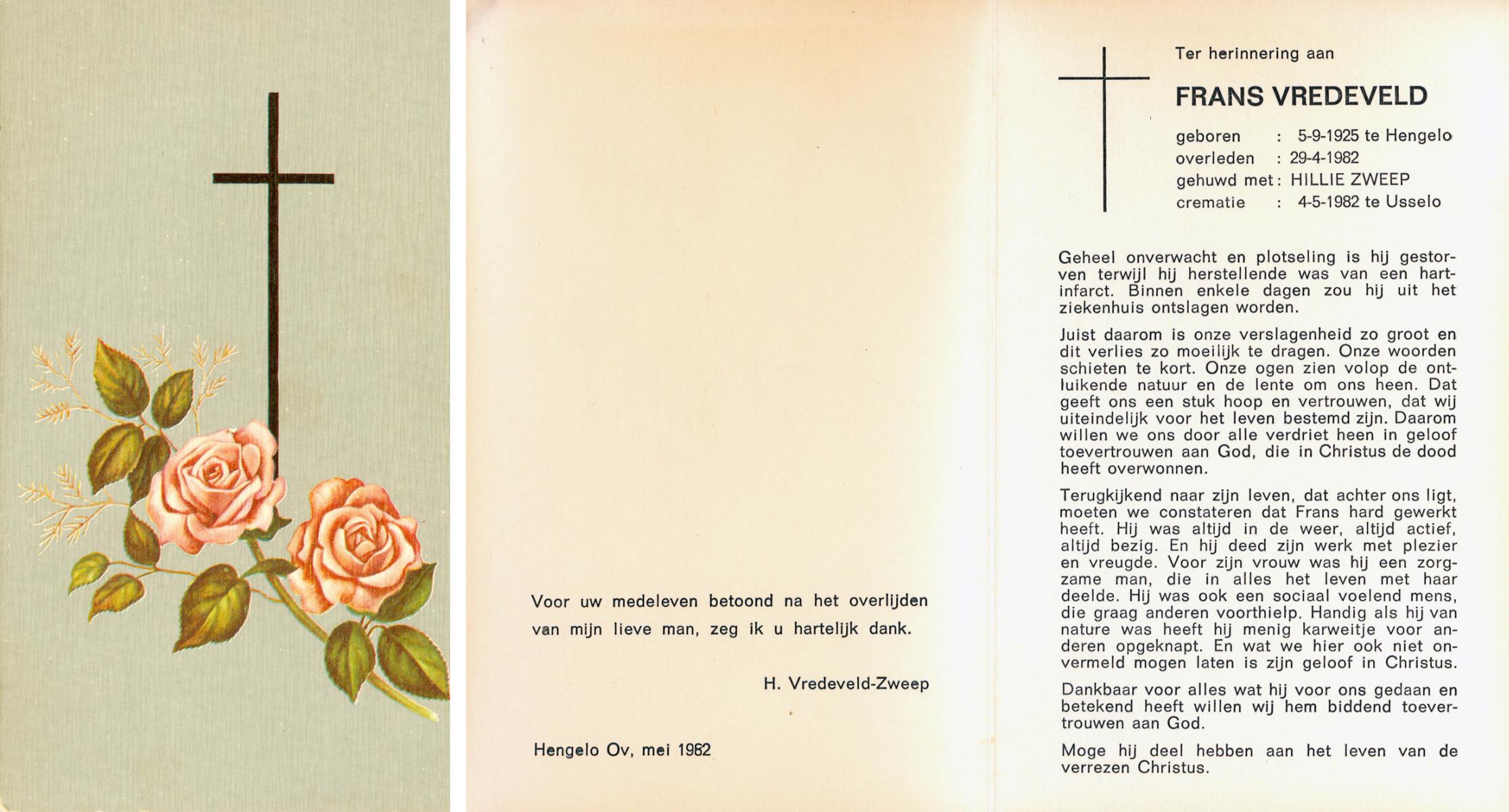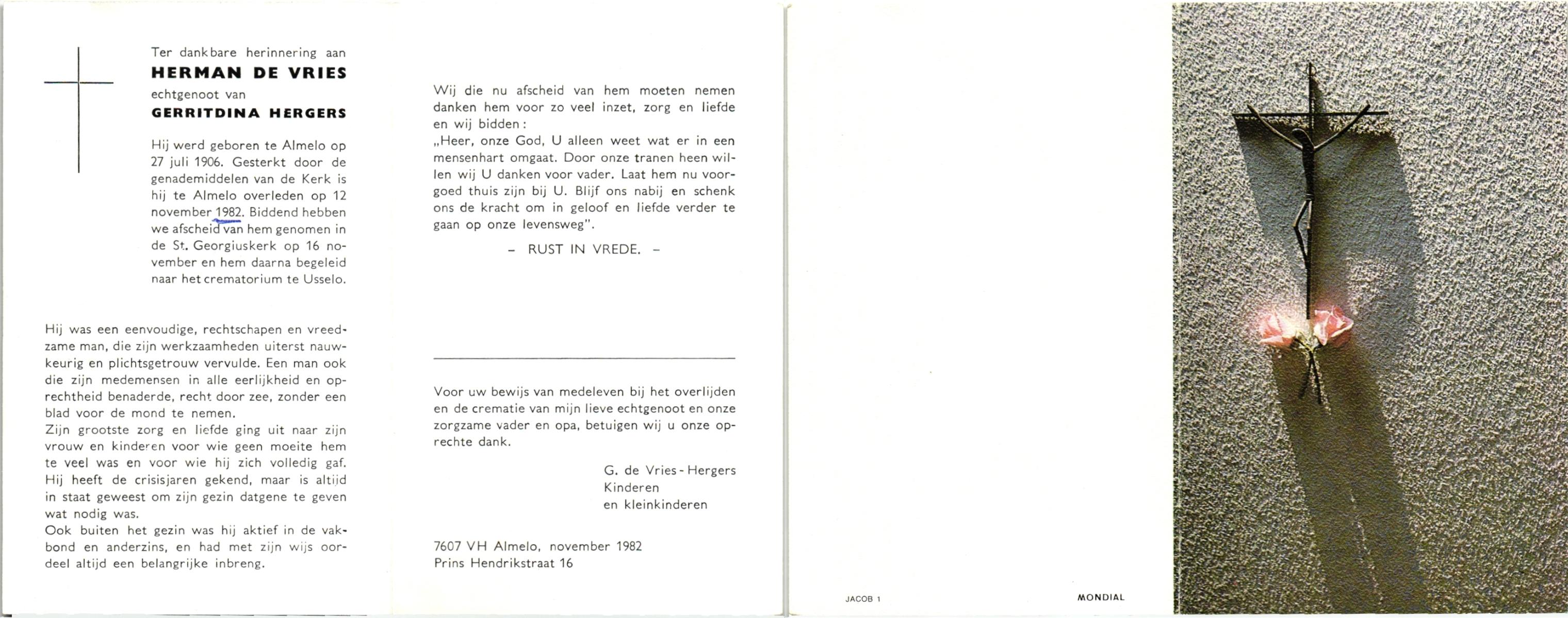 VRIES, de, Herman, geboren op 27-7-1906 te Almelo, overleden op 12-11-1982 te Almelo op 76-jarige leeftijd, gecremeerd op 16-11-1982 te Usselo.