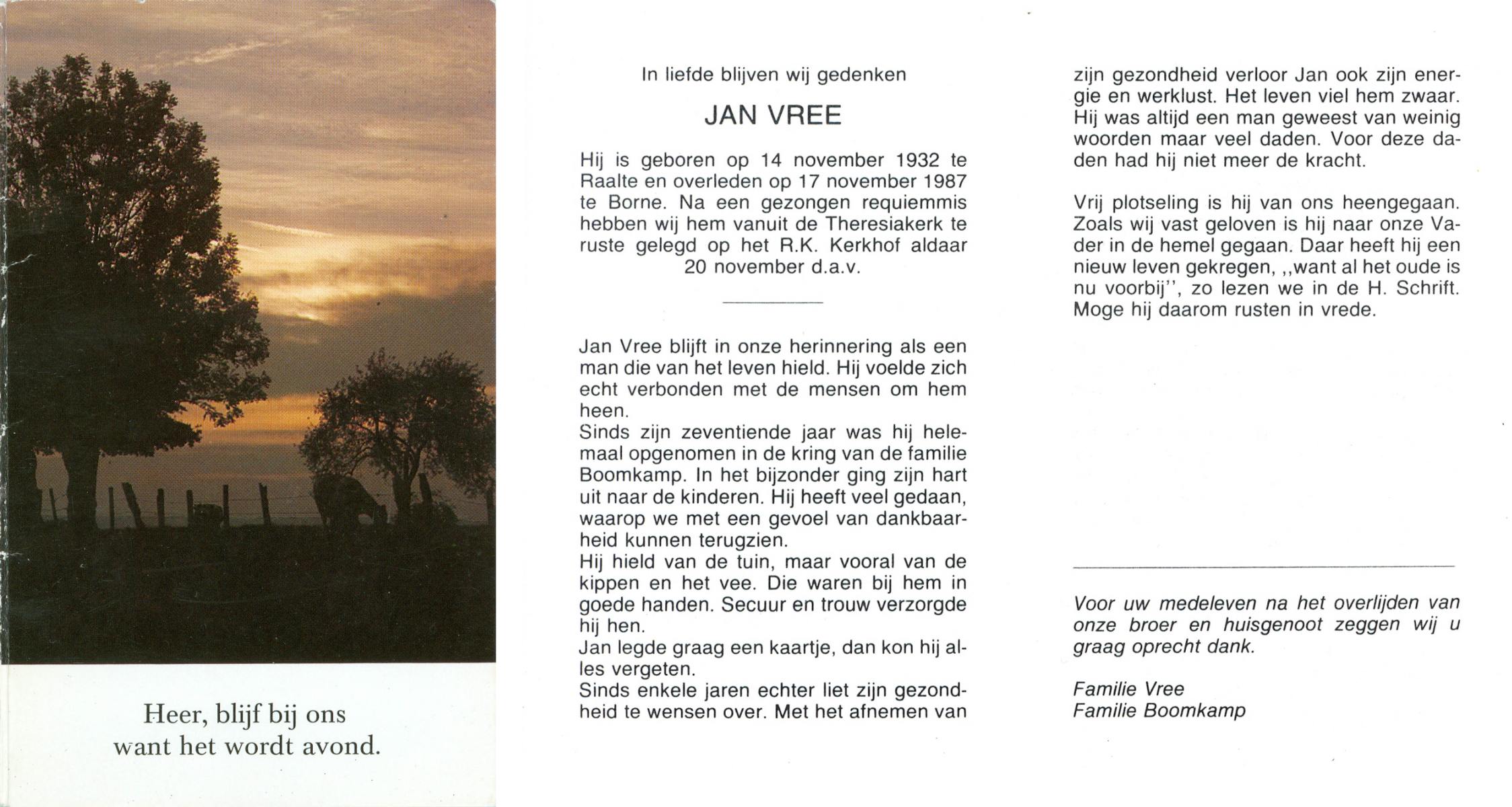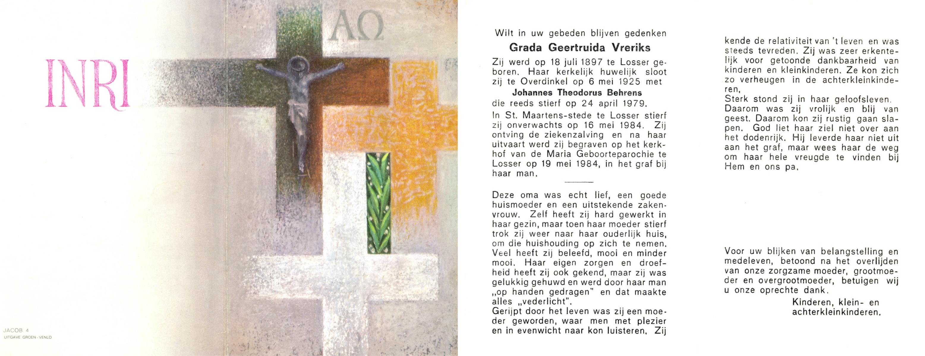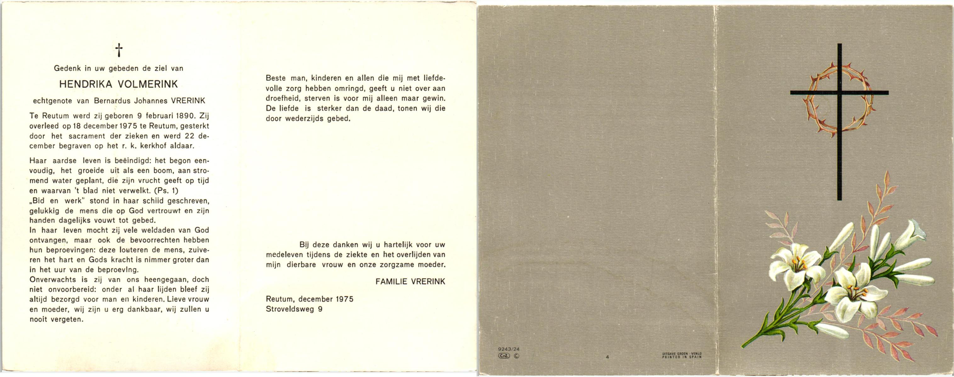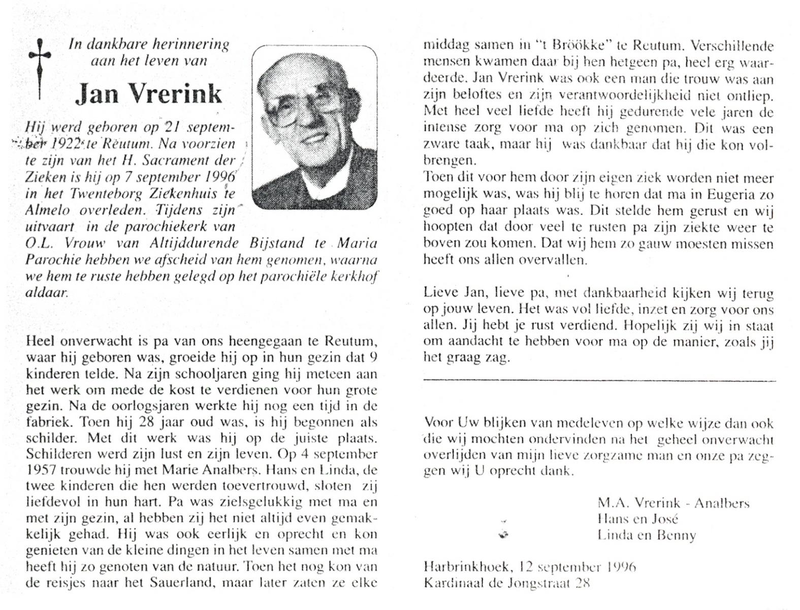 VRERINK, Jan, geboren op 21-9-1922 te Reutum, overleden op 7-9-1996 te Almelo op 73-jarige leeftijd, begraven te Maria Parochie.