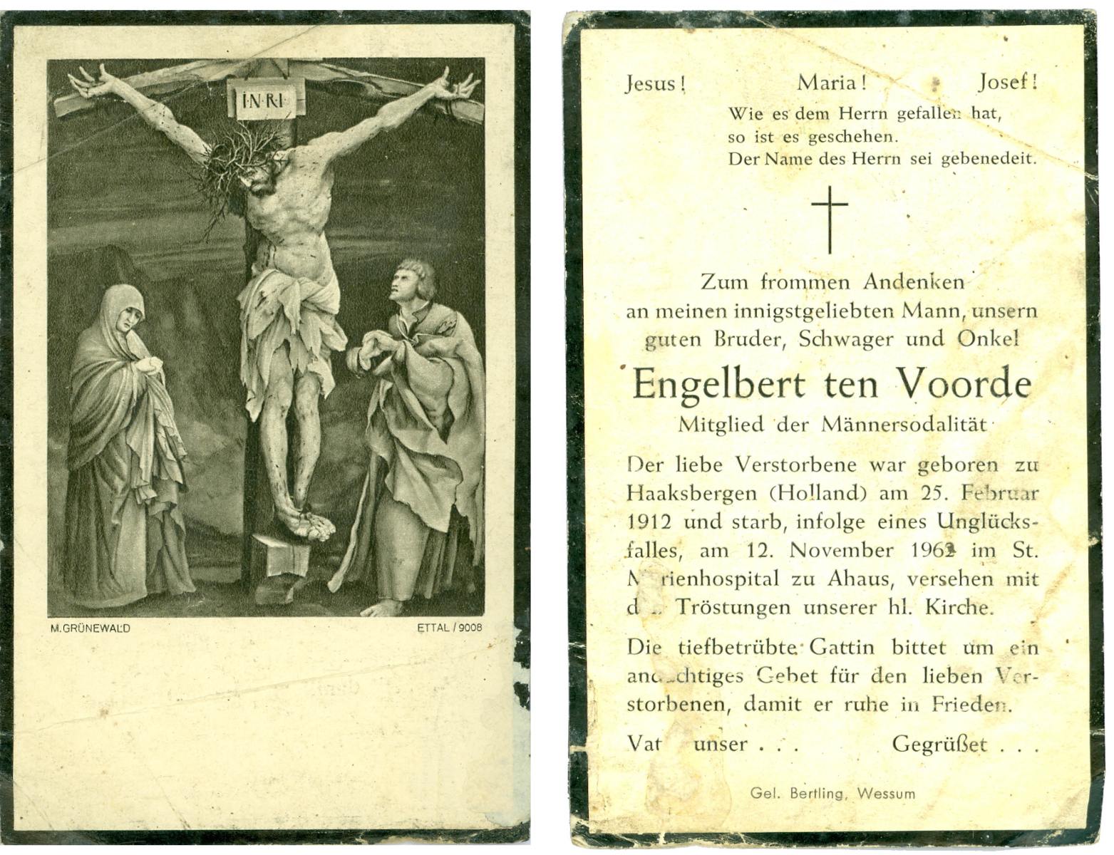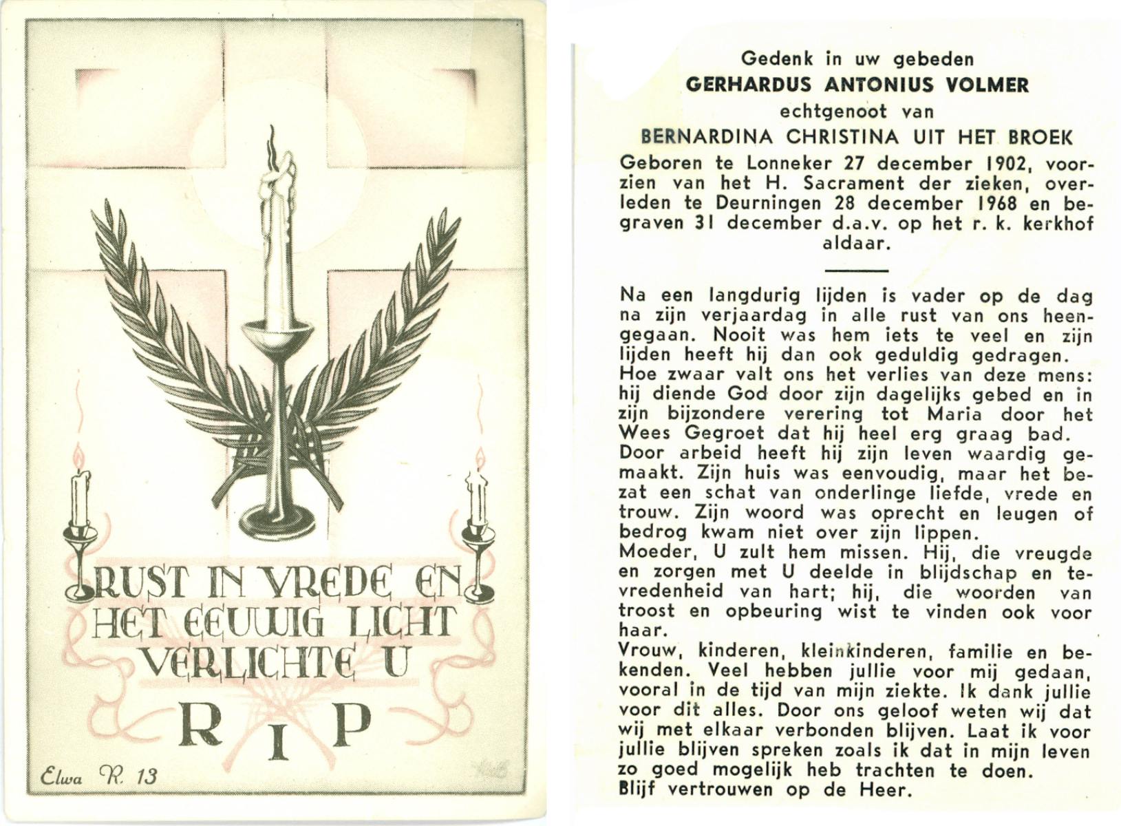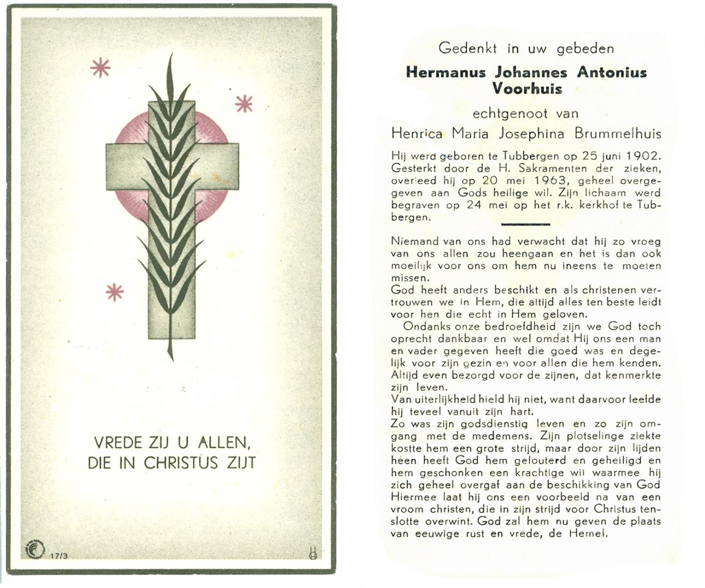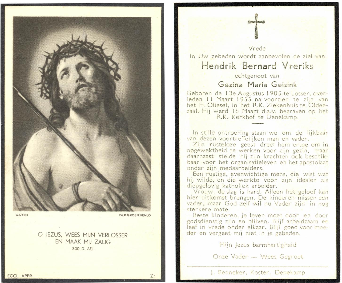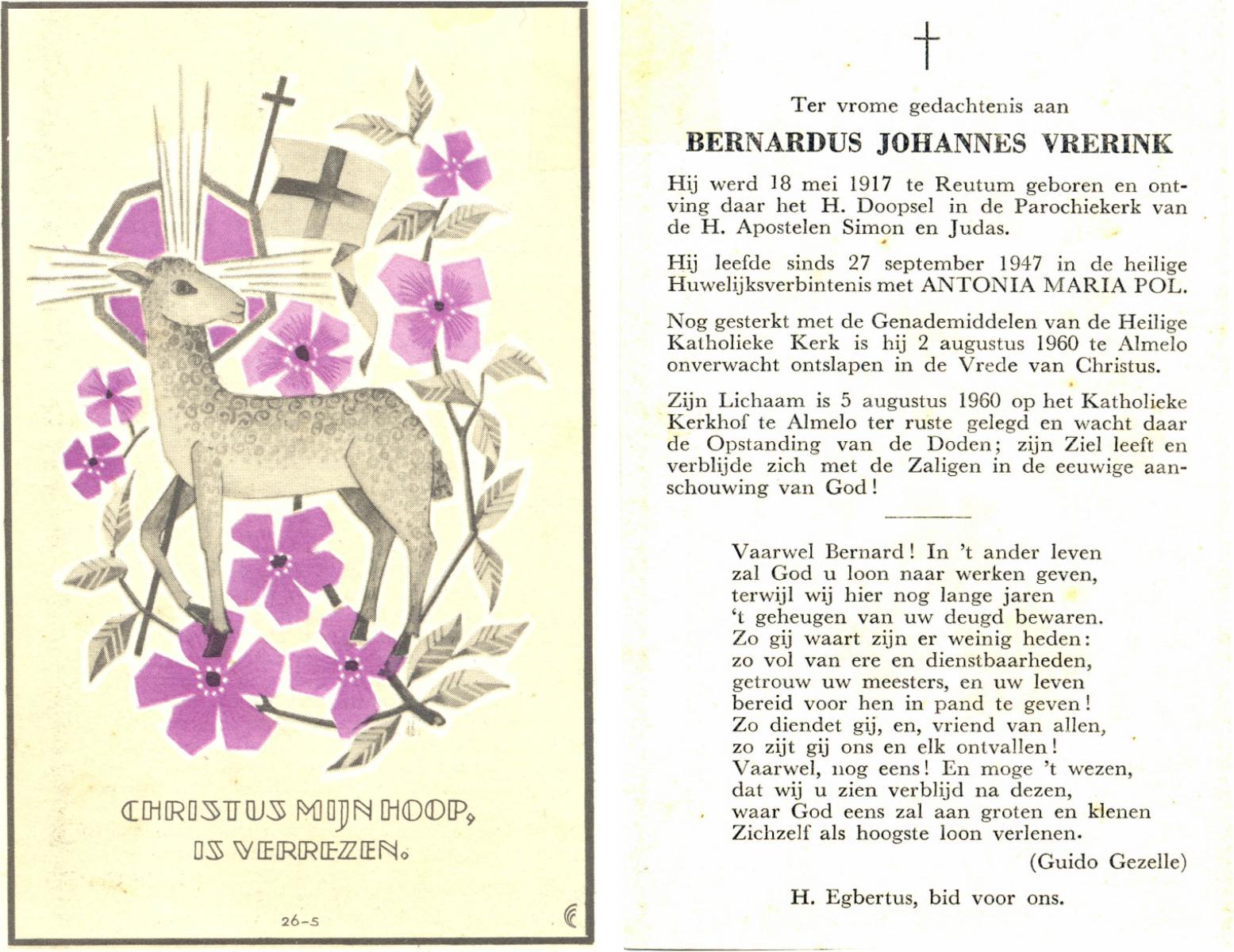 VRERINK, Bernardus Johannes, geboren op 18-5-1917 te Reutum, overleden op 2-8-1960 te Almelo op 43-jarige leeftijd, begraven op 5-8-1960 te Almelo.