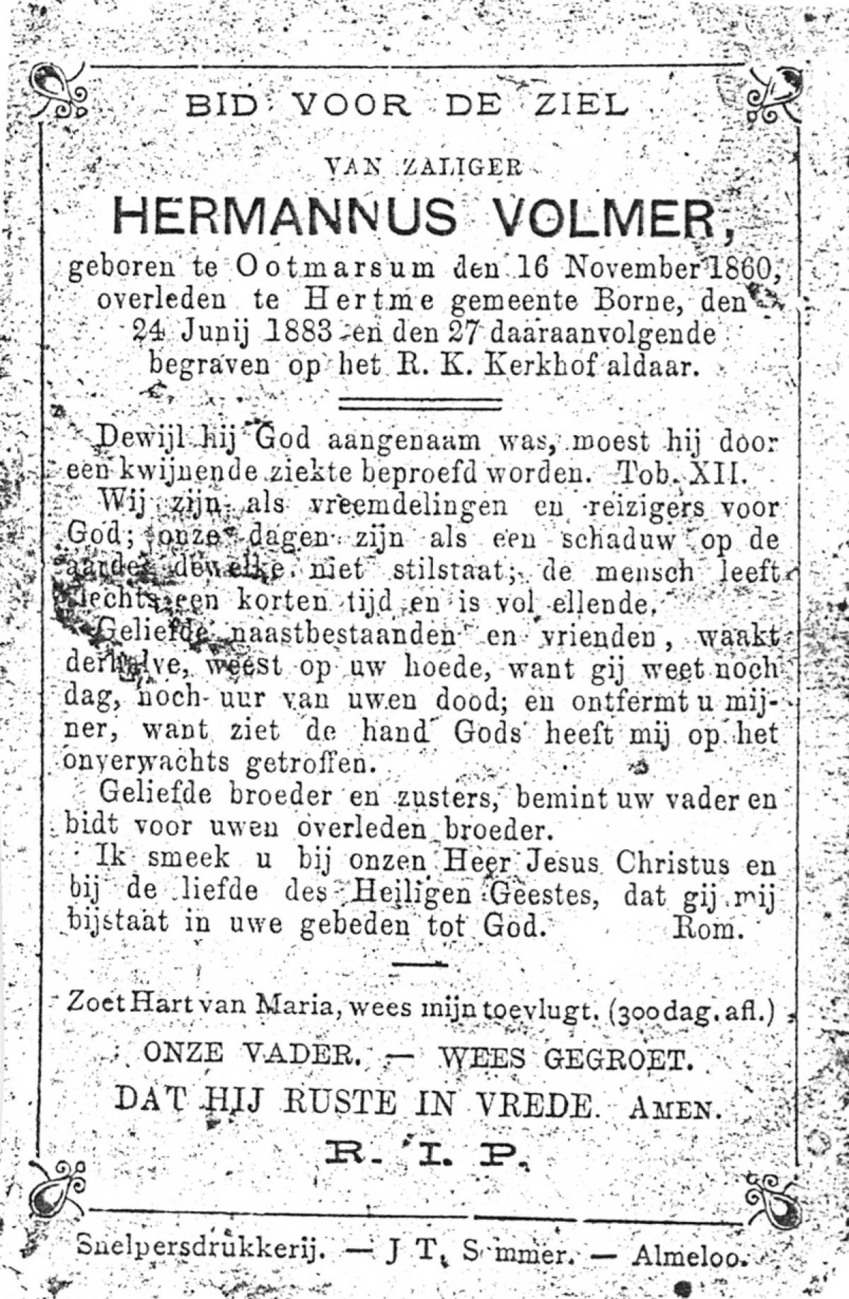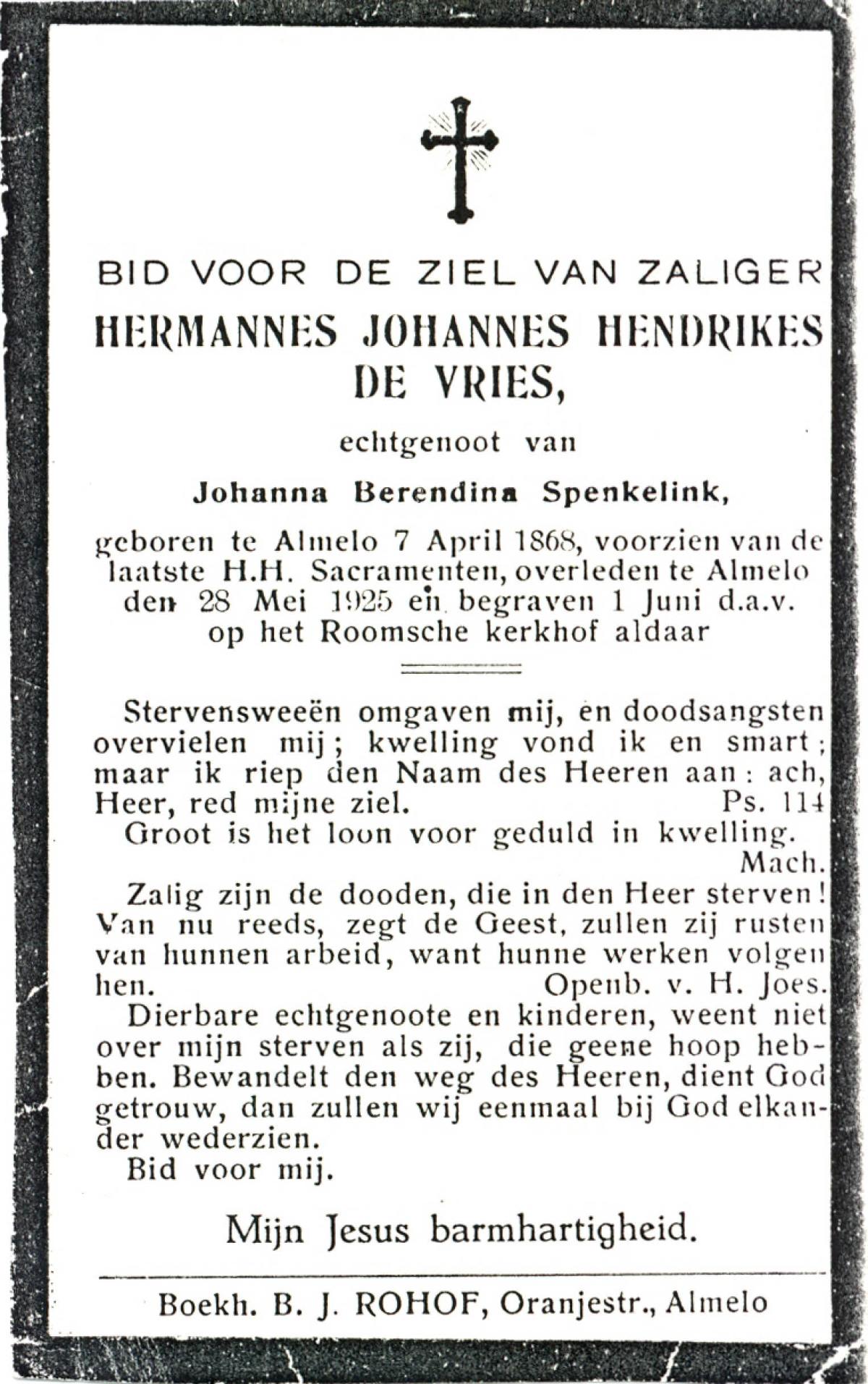 VRIES, De, Hermannes Johannes Hendrikes, geboren op 07-04-1868 te Almelo, overleden op 28-5-1925 te Almelo op 57-jarige leeftijd, begraven op 1-6-1925 te Almelo.