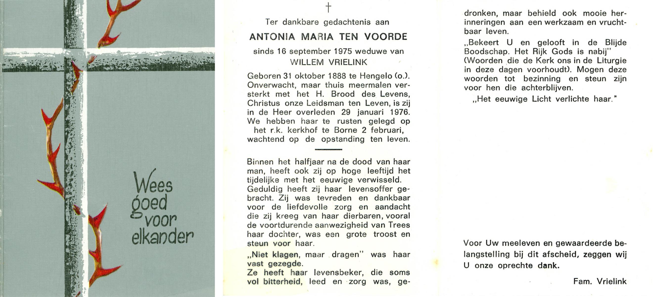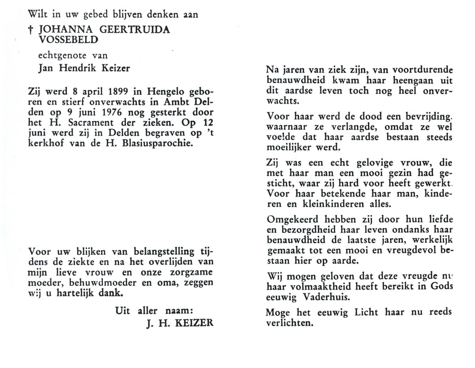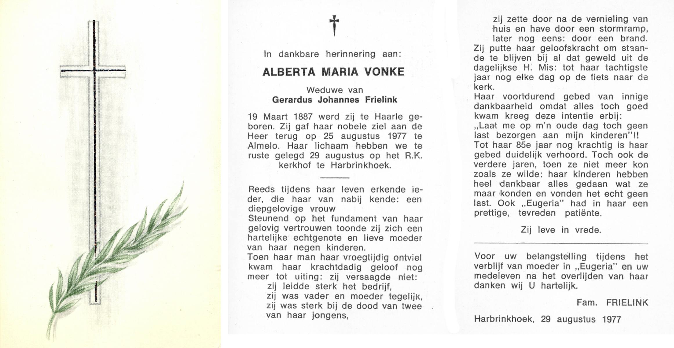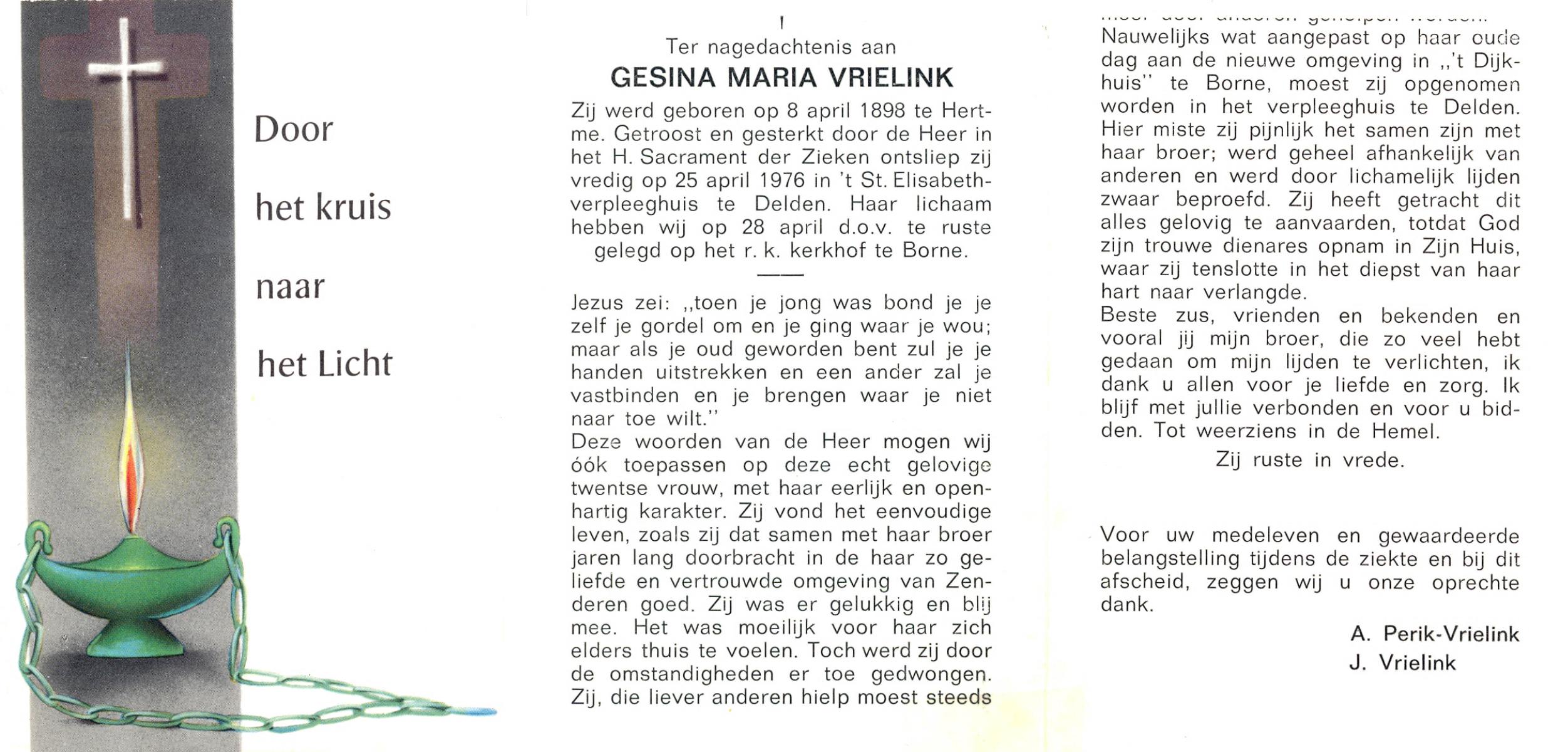 VRIELINK, Gesina Maria, geboren op 08-04-1898 te Hertme, overleden op 25-4-1976 te Delden op 78-jarige leeftijd, begraven op 28-4-1976 te Borne.