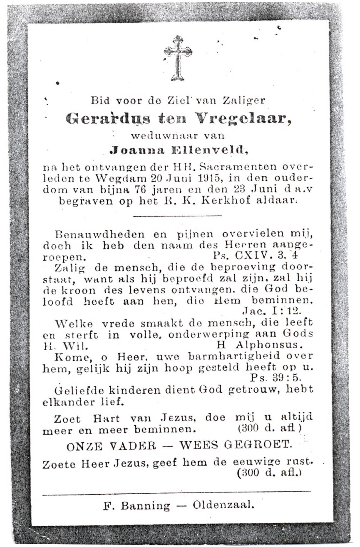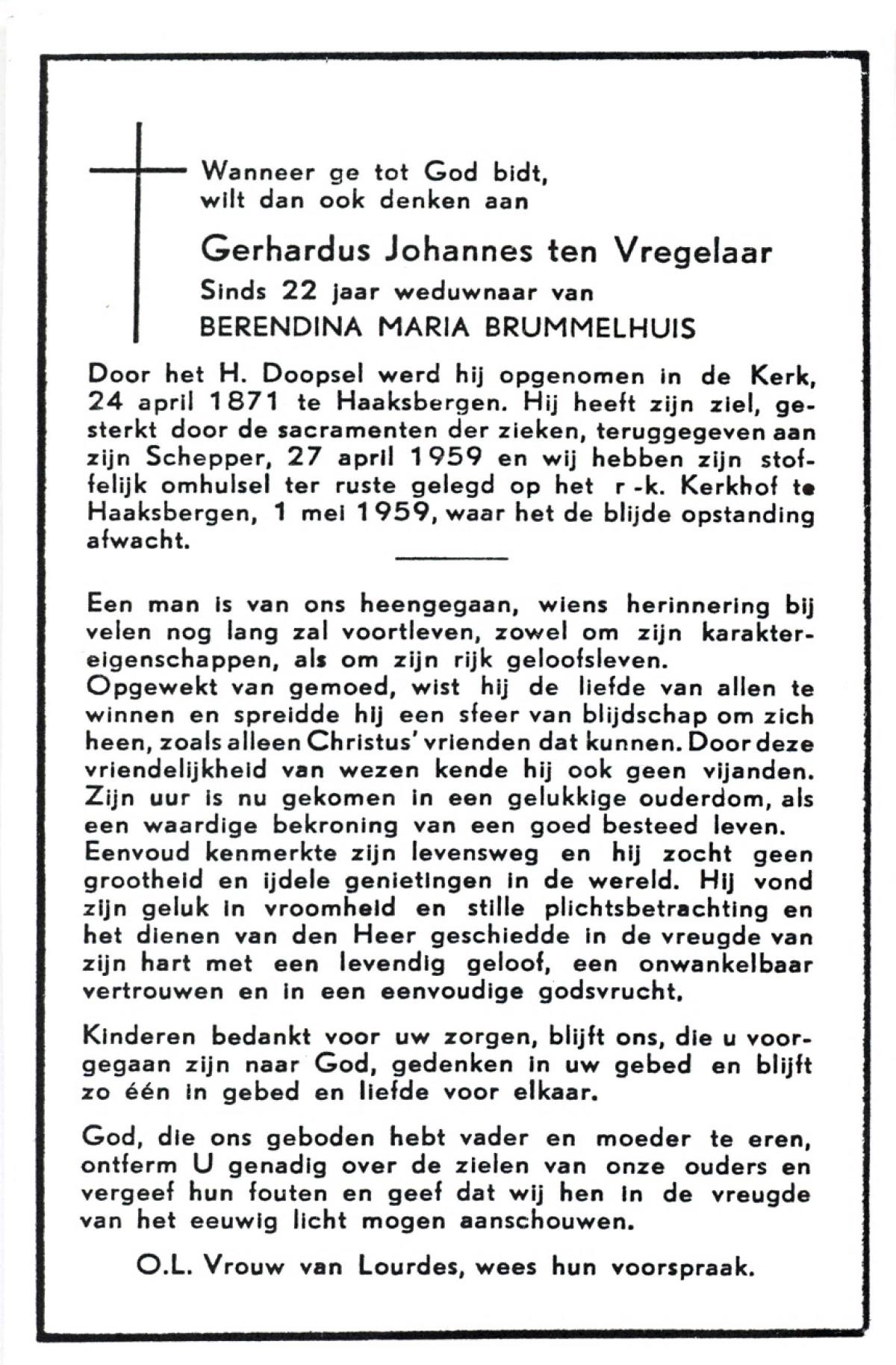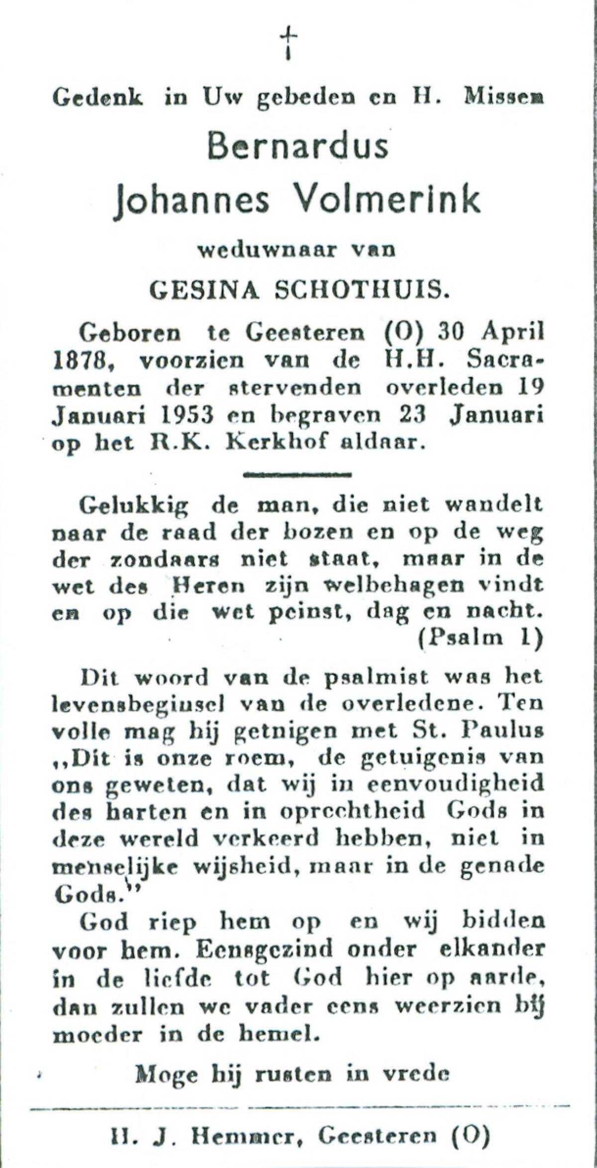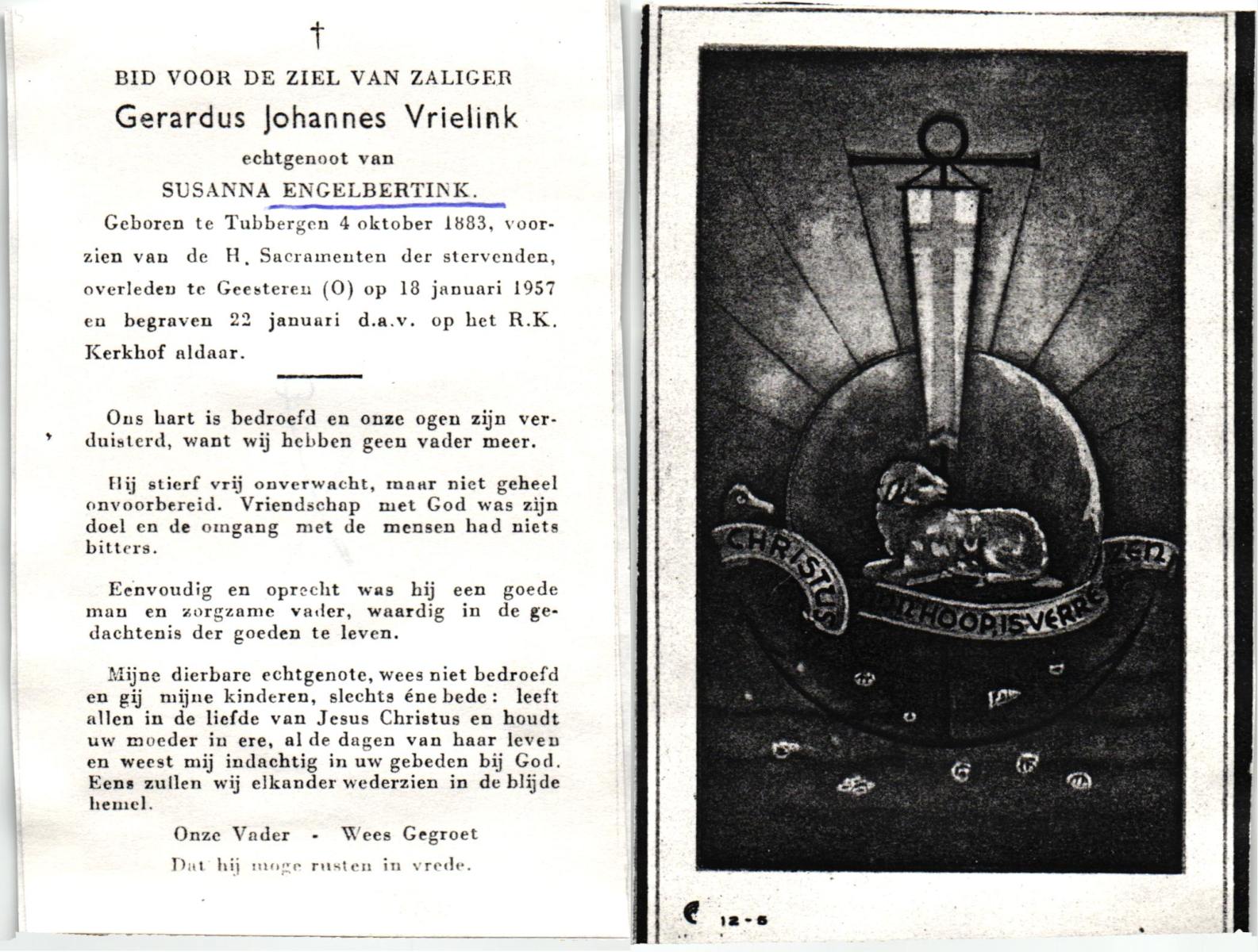 VRIELINK, Gerardus Johannes, geboren op 04-10-1883 te Tubbergen, overleden op 18-1-1957 te Geesteren op 73-jarige leeftijd, begraven op 22-1-1957 te Geesteren.