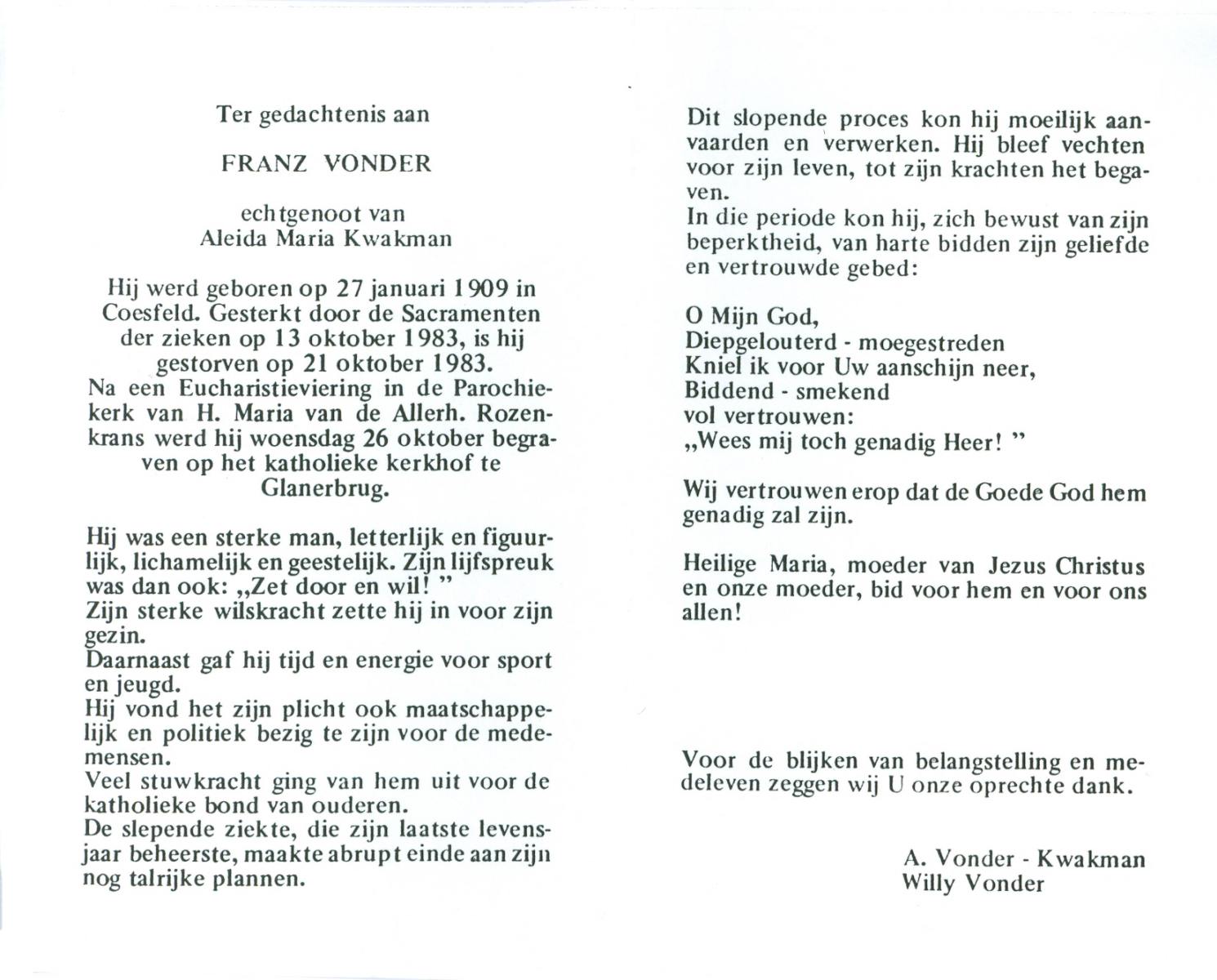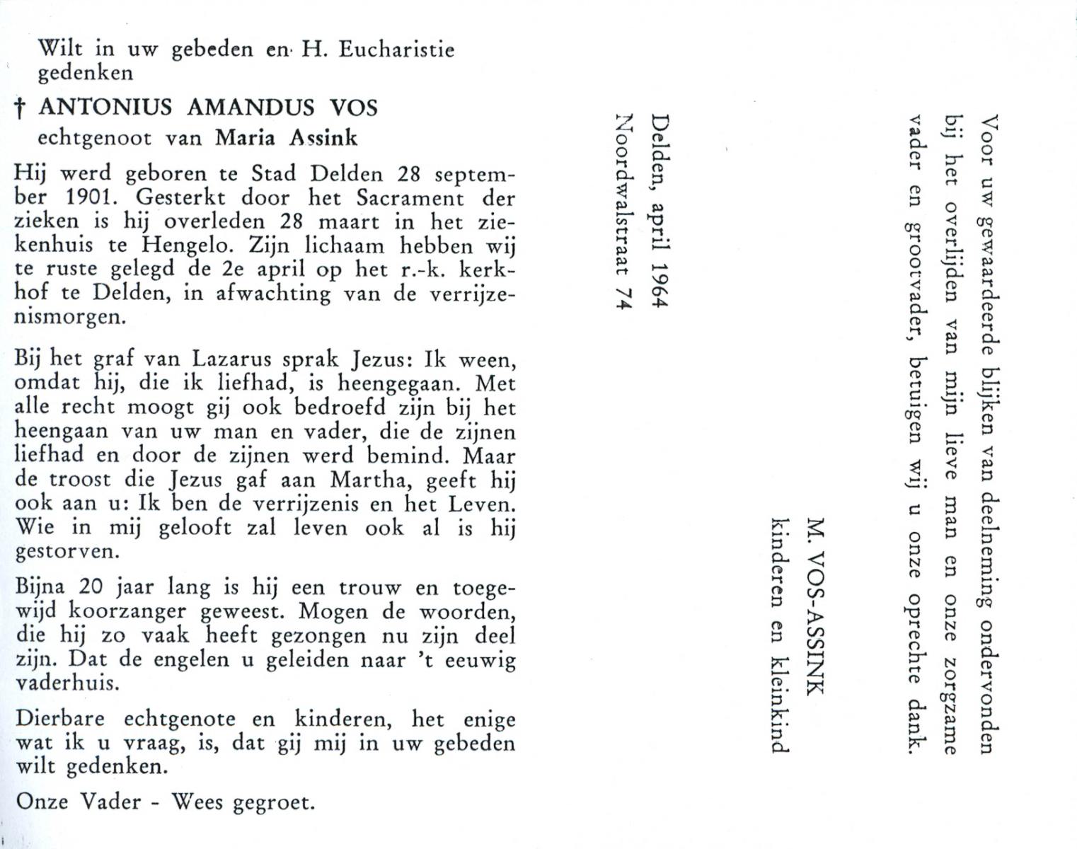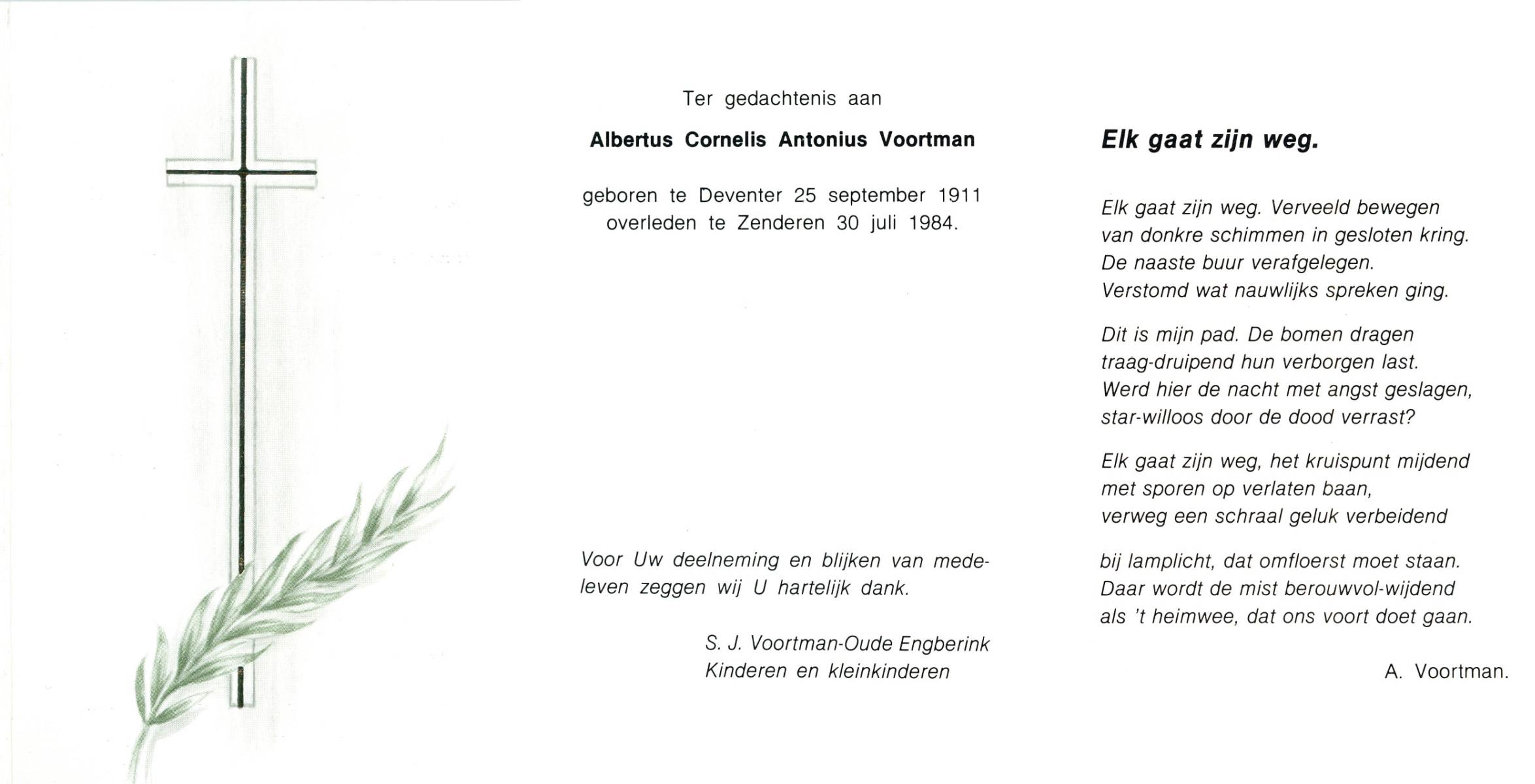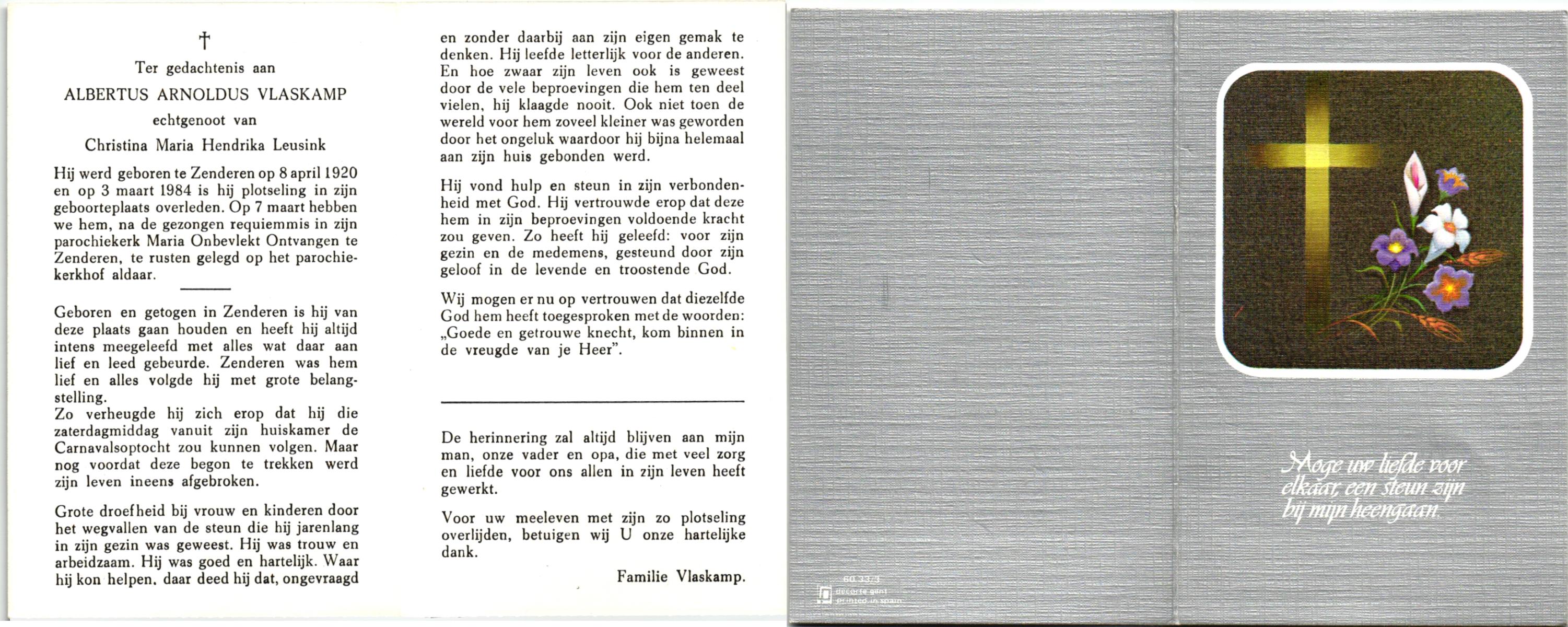 VLASKAMP, , Albertus Arnoldus, geboren op 8-4-1920 te Zenderen, overleden op 3-3-1984 te Zenderen op 63-jarige leeftijd, begraven op 7-3-1984 te Zenderen.