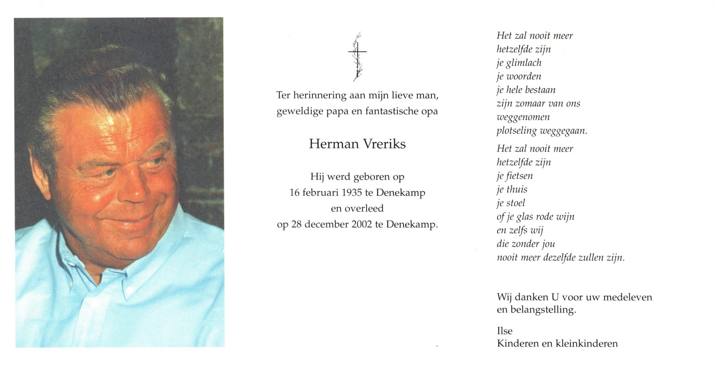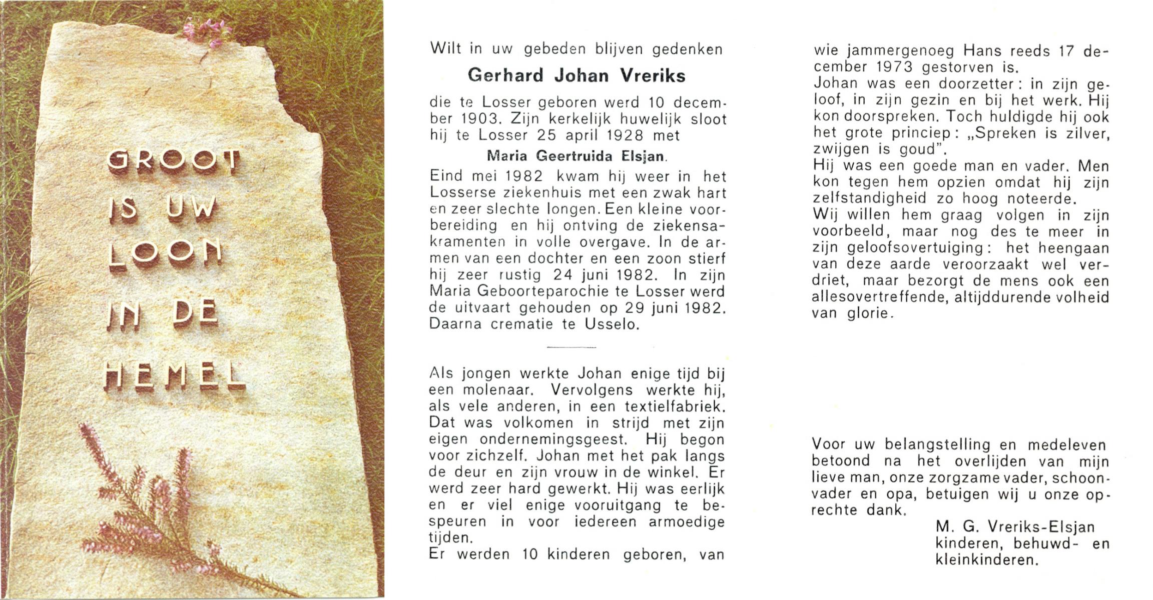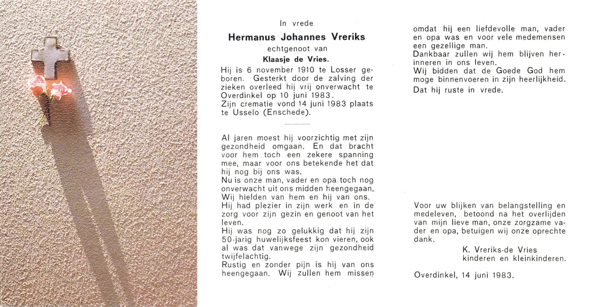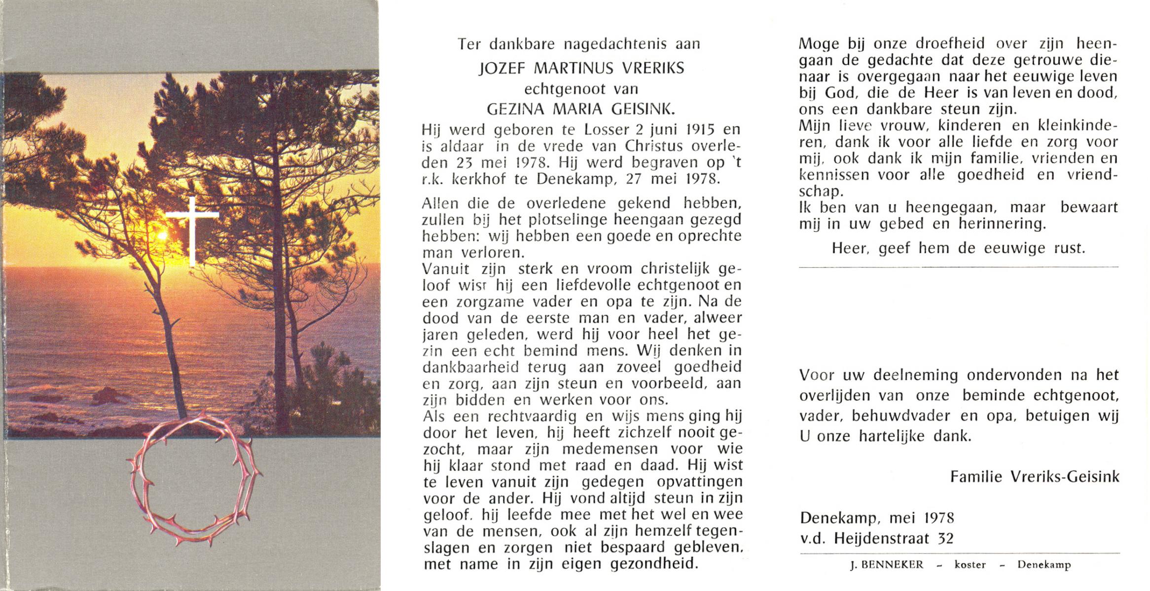 VRERIKS, Jozef Martinus, geboren op 2-6-1915 te Losser, overleden op 23-5-1978 op 62-jarige leeftijd, begraven op 27-5-1978 te Denekamp R.K.kerkhof.