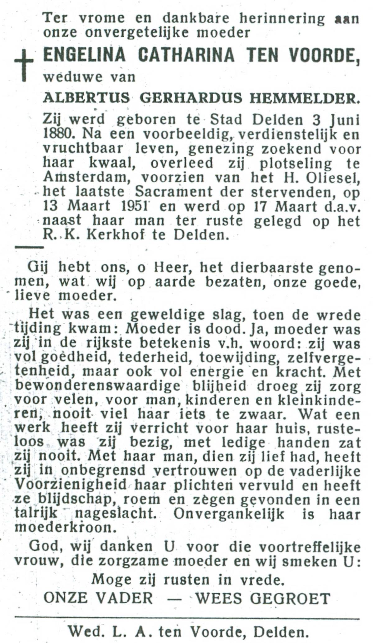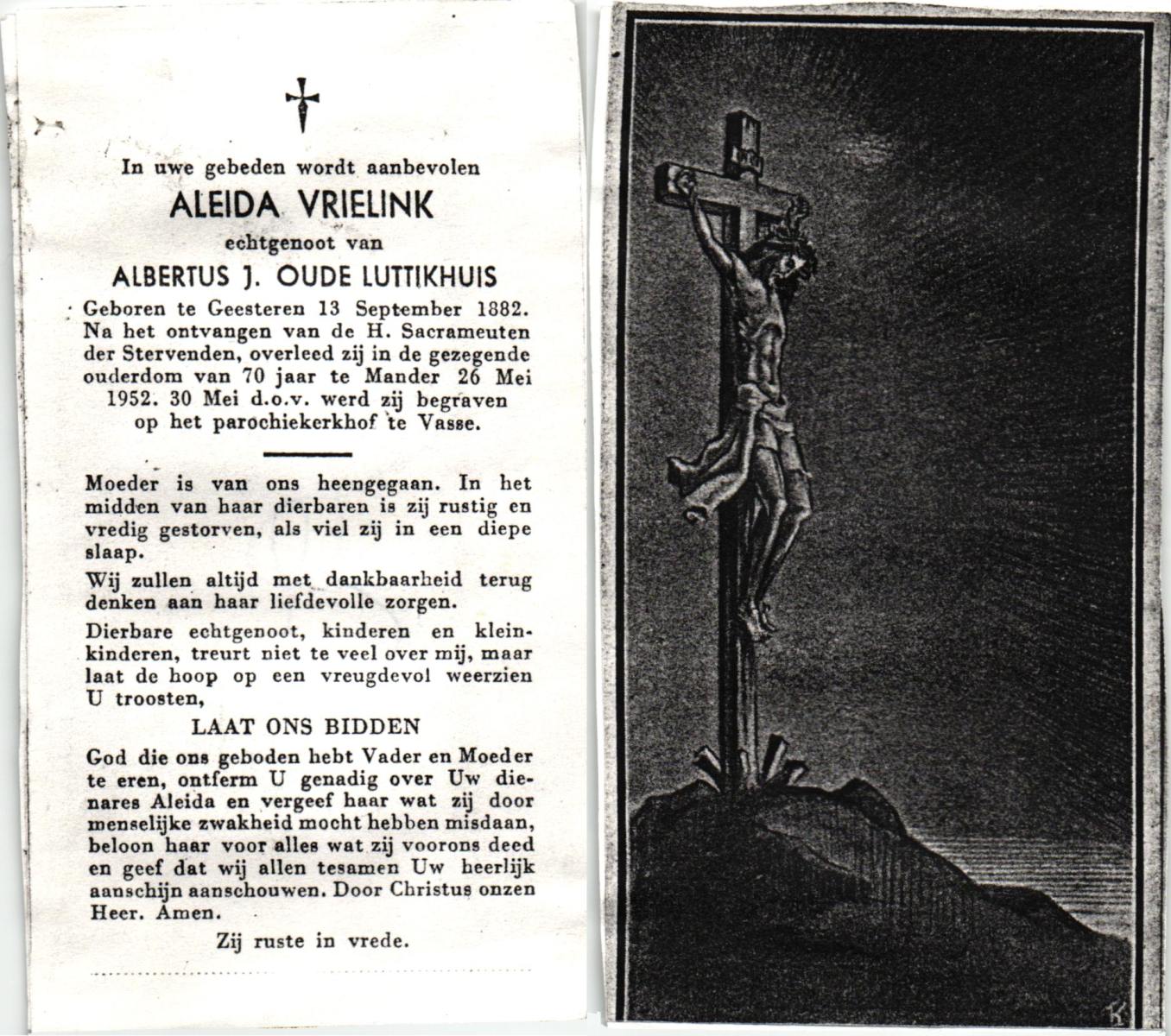 VRIELINK, Aleida, geboren op 13-09-1882 te Geesteren, overleden op 26-5-1952 te Mander op 70-jarige leeftijd, begraven op 30-5-1952 te Vasse.